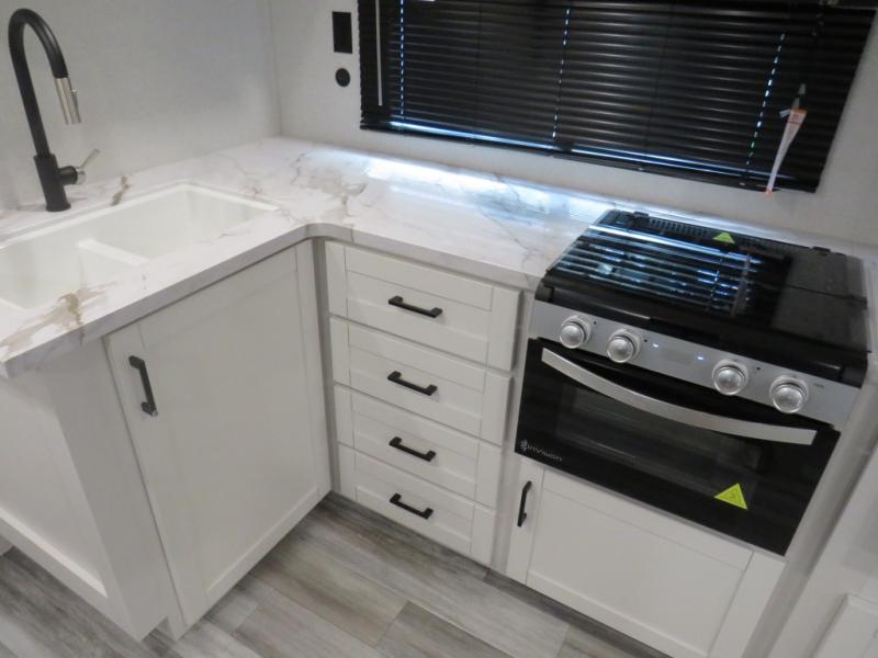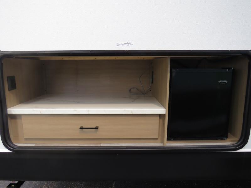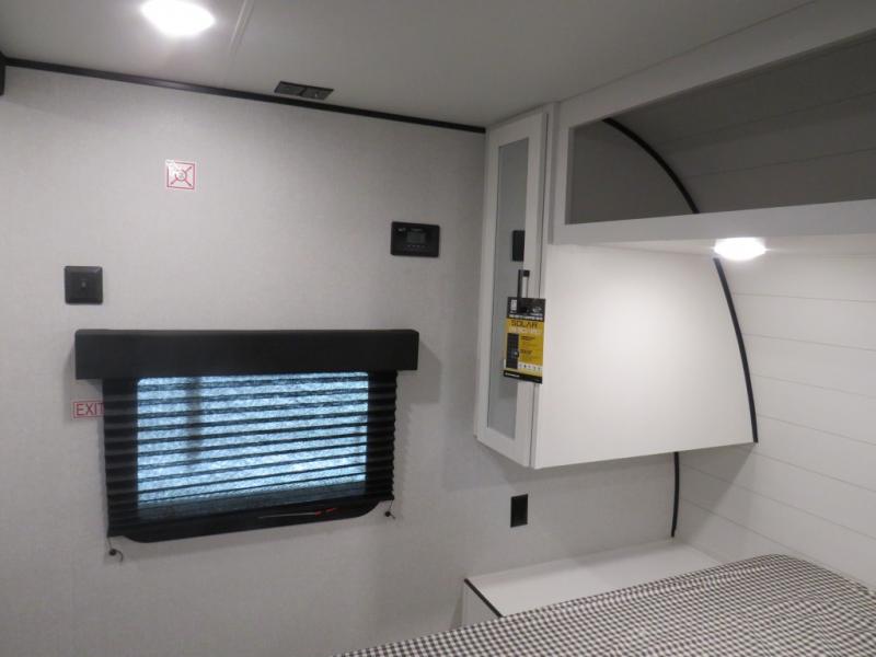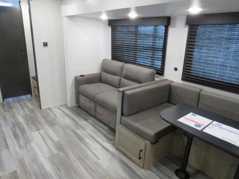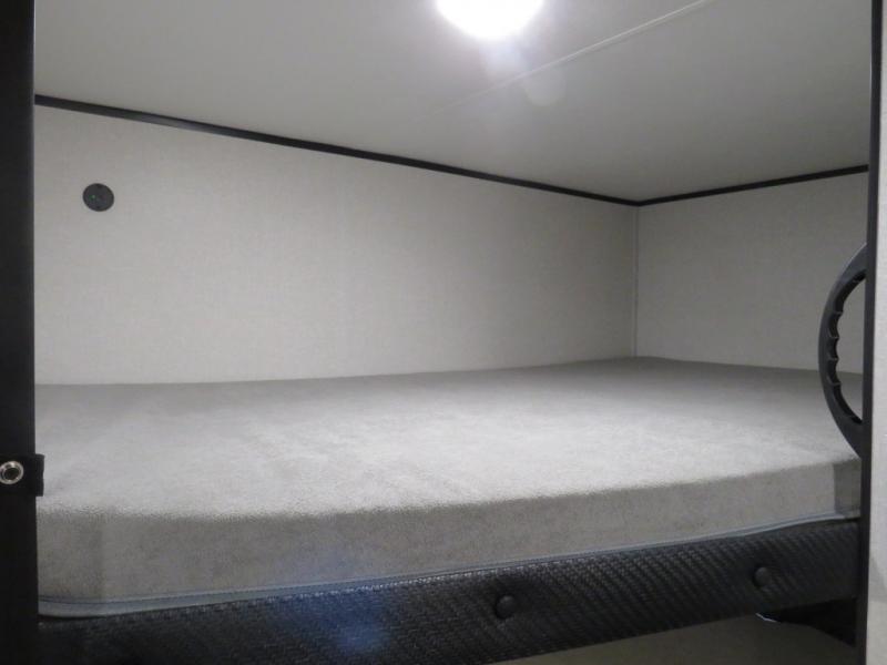 It's time to ditch that old tent and upgrade to this spacious travel trailer! The little ones or your guests will love the double-size bunks in the rear bunkhouse, along with a half bath and storage space for their things. You'll enjoy the front private bedroom all to yourselves with a queen bed and dual wardrobes, and the full bath is close by for easy nighttime use. A U-shaped dinette slide and sofa in the main living area provide your crew with space to relax and dine together, and the fully equipped kitchen lets you cook up your best meals. Outside, you'll find exterior storage, a 20' power awning, plus an outdoor kitchen to enjoy a sunrise breakfast!