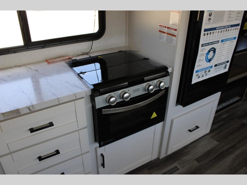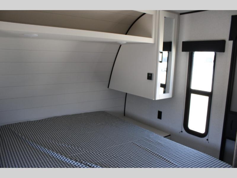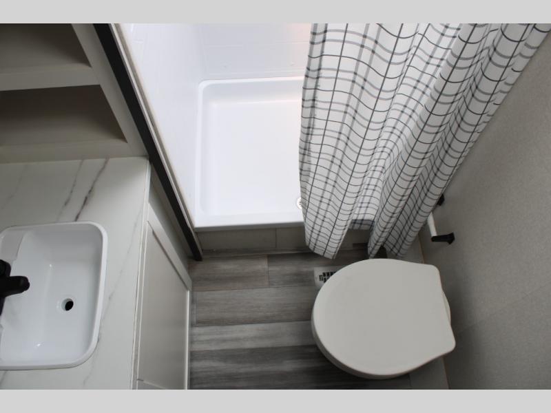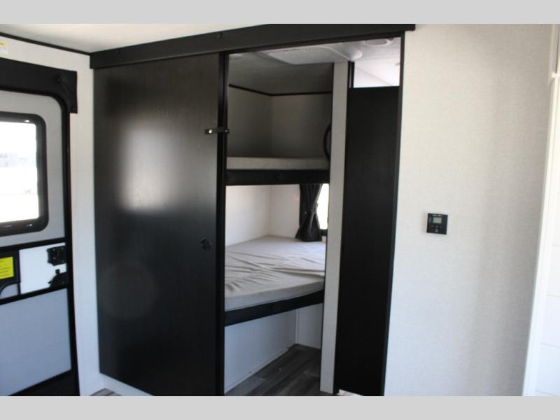 It's time to ditch that old tent and upgrade to this spacious travel trailer! The littles ones or your guests will love the double-size bunks in the rear bunkhouse, along with a half bath and storage space for their things. You'll enjoy the front private bedroom all to yourselves with a queen bed and dual wardrobes, and the full bath is close by for easy nighttime use. A U-shaped dinette slide and sofa in the main living area provide your crew with space to relax and dine together, and the fully equipped kitchen lets you cook up your best meals. Outside, you'll find exterior storage, a 20' power awning, plus an exterior refrigerator, LP Quick Connect, and an exterior spray port!