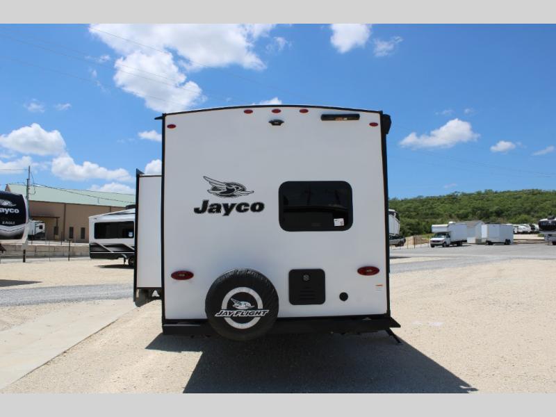 The Jayco Jay Flight SLX travel trailer is quite easy to own because it is lightweight for an easier towing experience. Built on a fully integrated A-frame with galvanized-steel, impact-resistant wheel wells, the Jay Flight SLX has quality at its very foundation. That quality continues on to the electric self-adjusting brakes, easy-lube hubs, Magnum Truss roof system, and LP quick connect. Some of what the mandatory Customer Value Package includes is backup camera prep, Keyed-Alike entry and baggage doors, marine grade exterior speakers, and an on-demand tankless water heater.