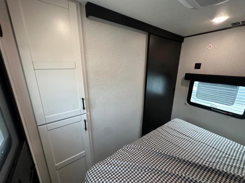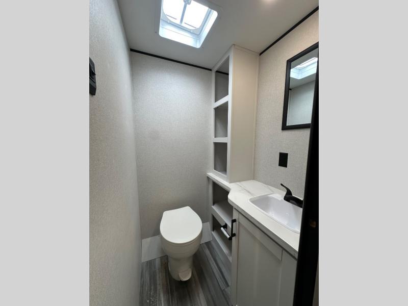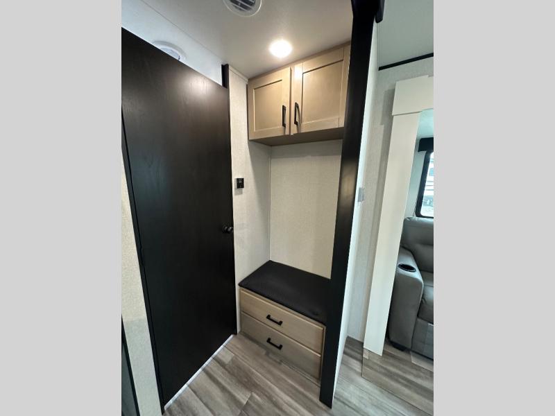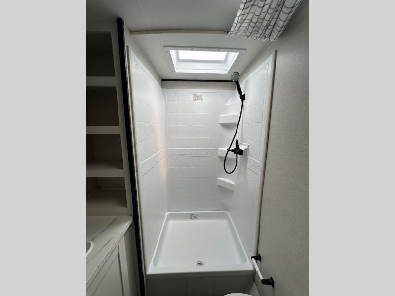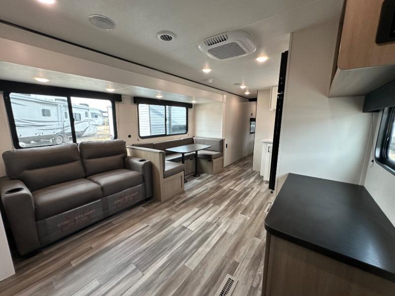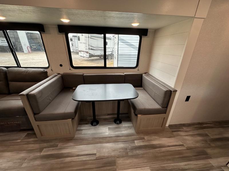 It's time to ditch that old tent and upgrade to this spacious travel trailer! The littles ones or your guests will love the double-size bunks in the rear bunkhouse, along with a half bath and storage space for their things. You'll enjoy the front private bedroom all to yourselves with a queen bed and dual wardrobes, and the full bath is close by for easy nighttime use. A U-shaped dinette slide and sofa in the main living area provide your crew with space to relax and dine together, and the fully equipped kitchen lets you cook up your best meals. Outside, you'll find exterior storage, a 20' power awning, plus an exterior refrigerator, LP Quick Connect, and an exterior spray port!