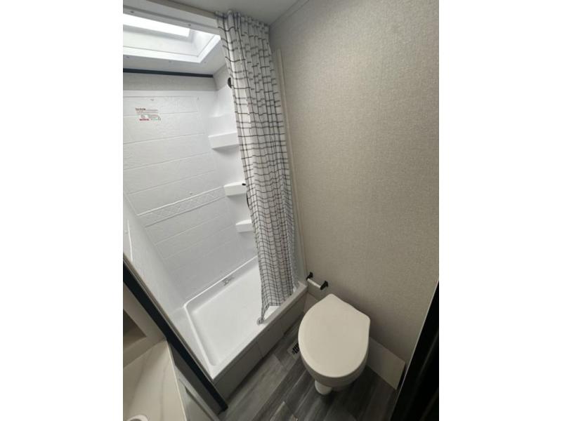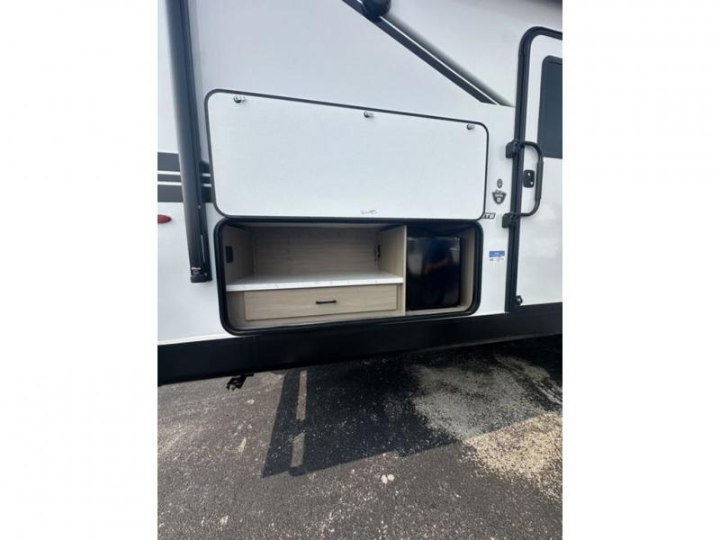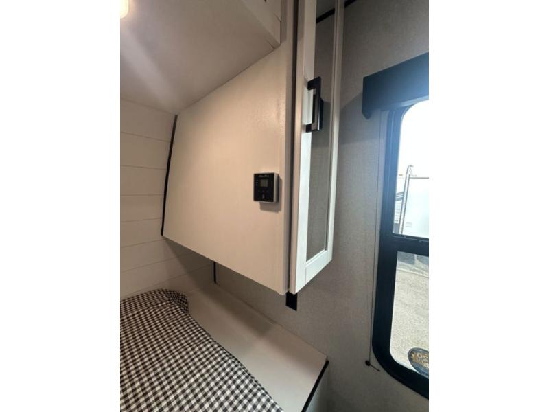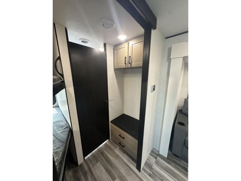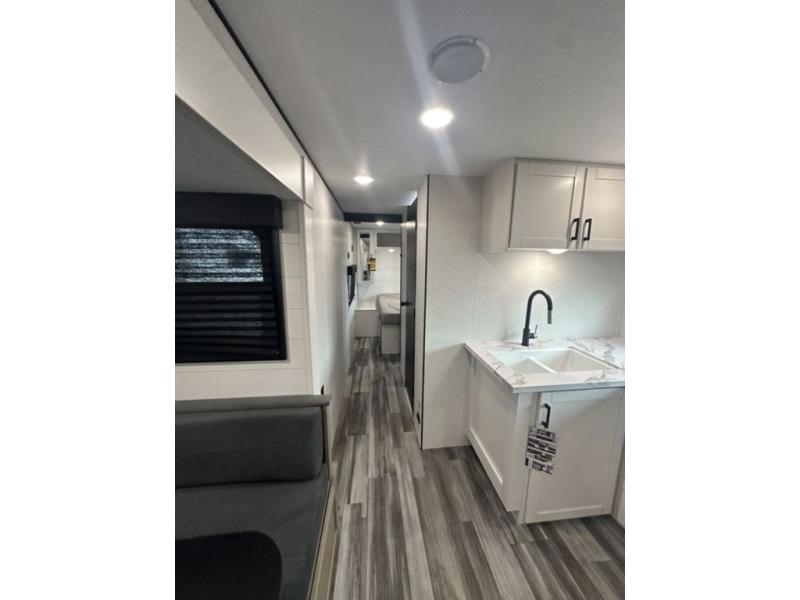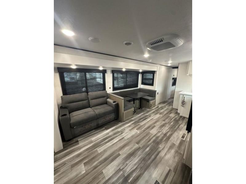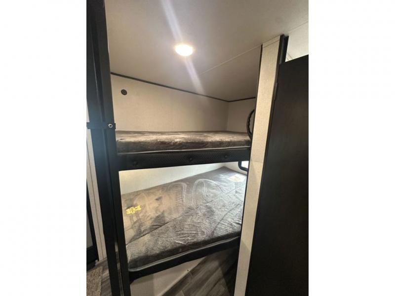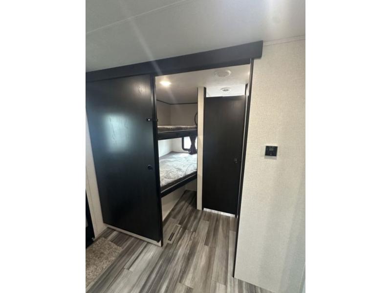 It's time to ditch that old tent and upgrade to this spacious travel trailer! The littles ones or your guests will love the double-size bunks in the rear bunkhouse, along with a half bath and storage space for their things. You'll enjoy the front private bedroom all to yourselves with a queen bed and dual wardrobes, and the full bath is close by for easy nighttime use. A U-shaped dinette slide and sofa in the main living area provide your crew with space to relax and dine together, and the fully equipped kitchen lets you cook up your best meals. Outside, you'll find exterior storage, a 20' power awning, plus an exterior refrigerator, LP Quick Connect, and an exterior spray port!