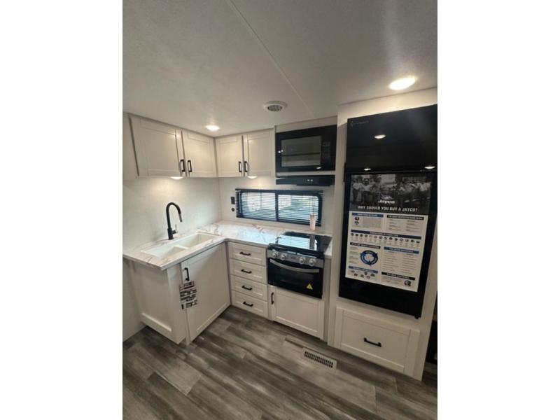 The Jayco Jay Flight SLX travel trailer is quite easy to own because it is lightweight for an easier towing experience. Built on a fully integrated A-frame with galvanized-steel, impact-resistant wheel wells, the Jay Flight SLX has quality at its very foundation. That quality continues on to the electric self-adjusting brakes, easy-lube hubs, Magnum Truss roof system, and LP quick connect. Some of what the mandatory Customer Value Package includes is backup camera prep, Keyed-Alike entry and baggage doors, marine grade exterior speakers, and an on-demand tankless water heater.