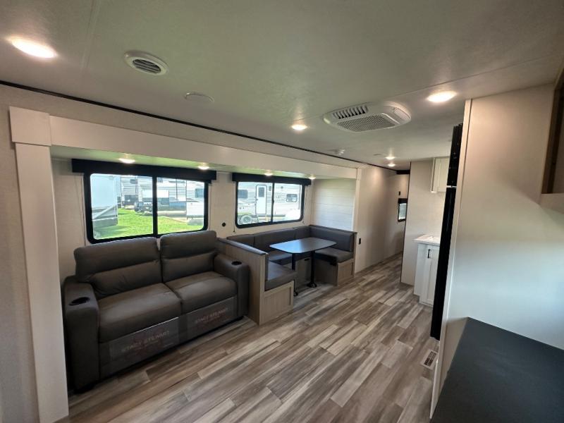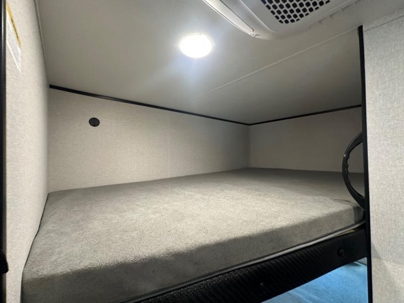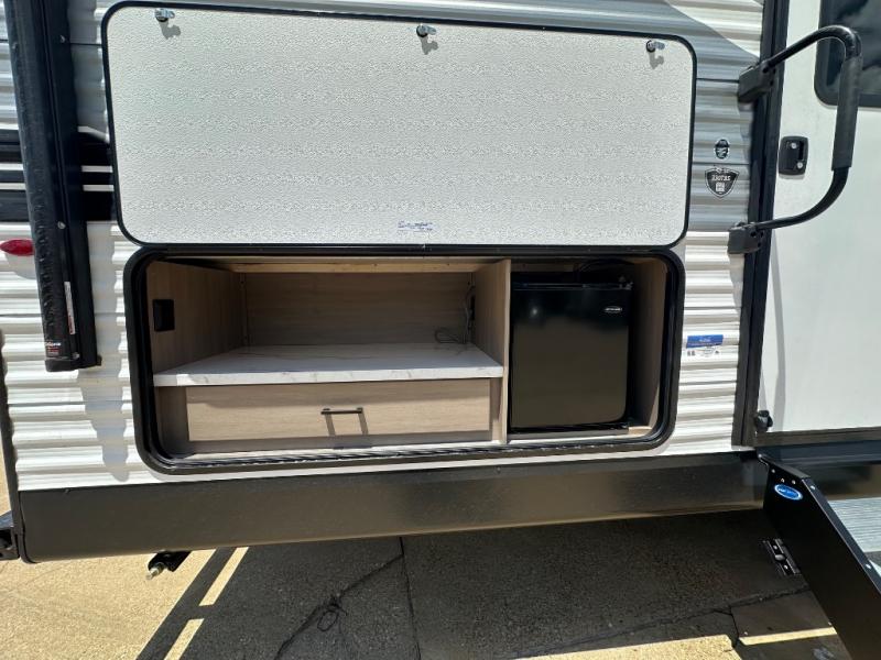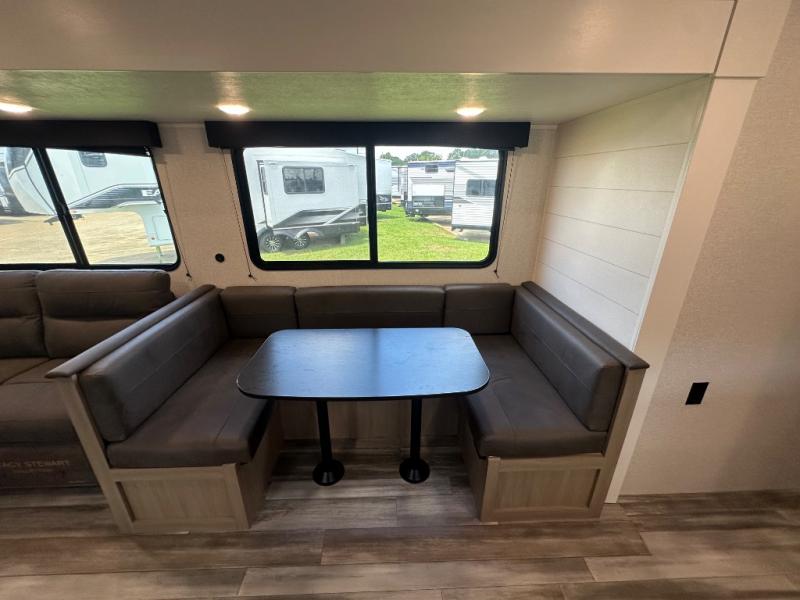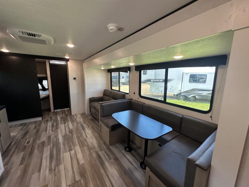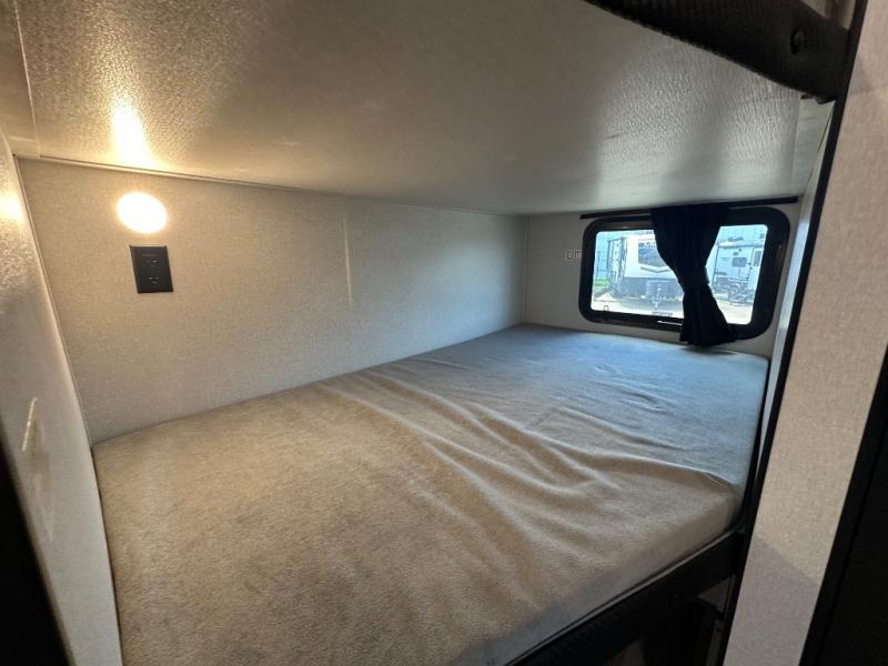 It's time to ditch that old tent and upgrade to this spacious travel trailer! The little ones or your guests will love the double-size bunks in the rear bunkhouse, along with a half bath and storage space for their things. You'll enjoy the front private bedroom all to yourselves with a queen bed and dual wardrobes, and the full bath is close by for easy nighttime use. A U-shaped dinette slide and sofa in the main living area provide your crew with space to relax and dine together, and the fully equipped kitchen lets you cook up your best meals. Outside, you'll find exterior storage, a 20' power awning, plus an outdoor kitchen to enjoy a sunrise breakfast!