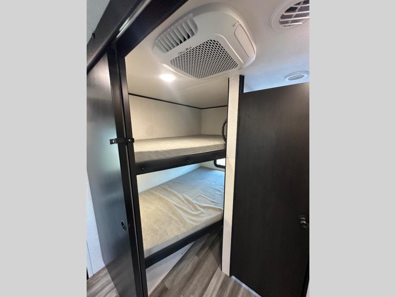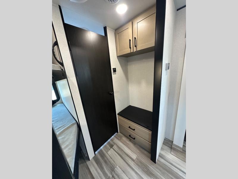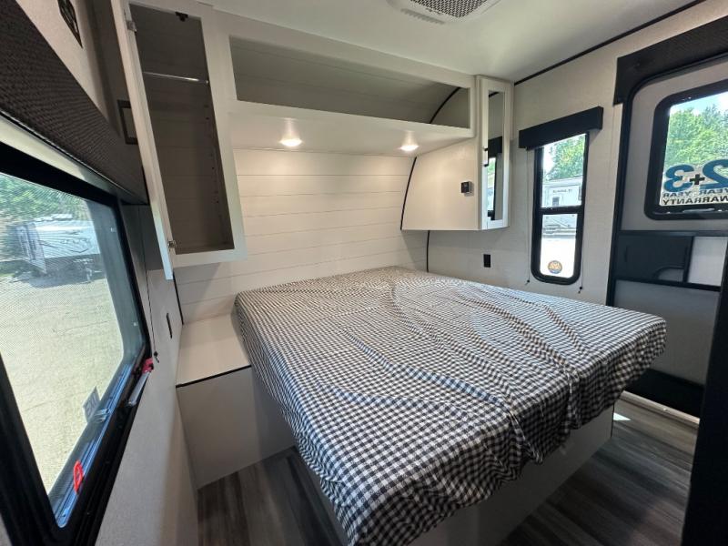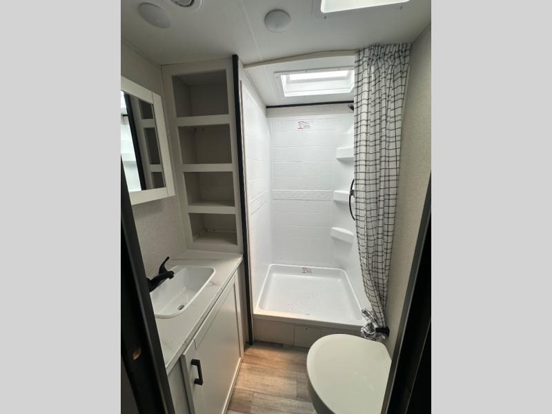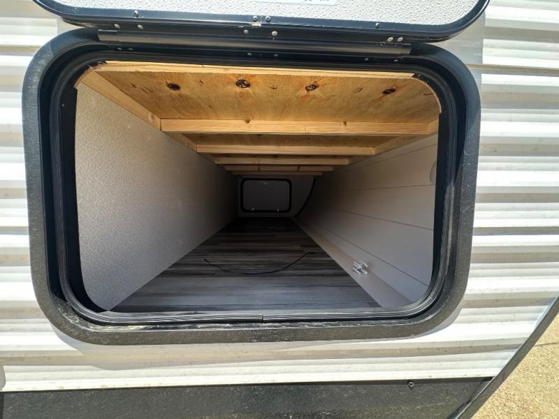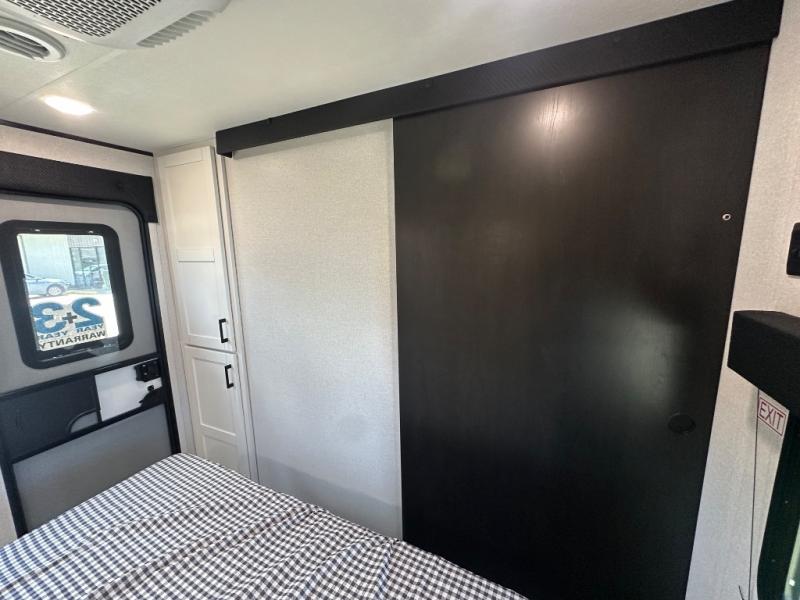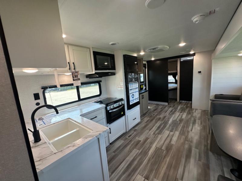 It's time to ditch that old tent and upgrade to this spacious travel trailer! The little ones or your guests will love the double-size bunks in the rear bunkhouse, along with a half bath and storage space for their things. You'll enjoy the front private bedroom all to yourselves with a queen bed and dual wardrobes, and the full bath is close by for easy nighttime use. A U-shaped dinette slide and sofa in the main living area provide your crew with space to relax and dine together, and the fully equipped kitchen lets you cook up your best meals. Outside, you'll find exterior storage, a 20' power awning, plus an outdoor kitchen to enjoy a sunrise breakfast!