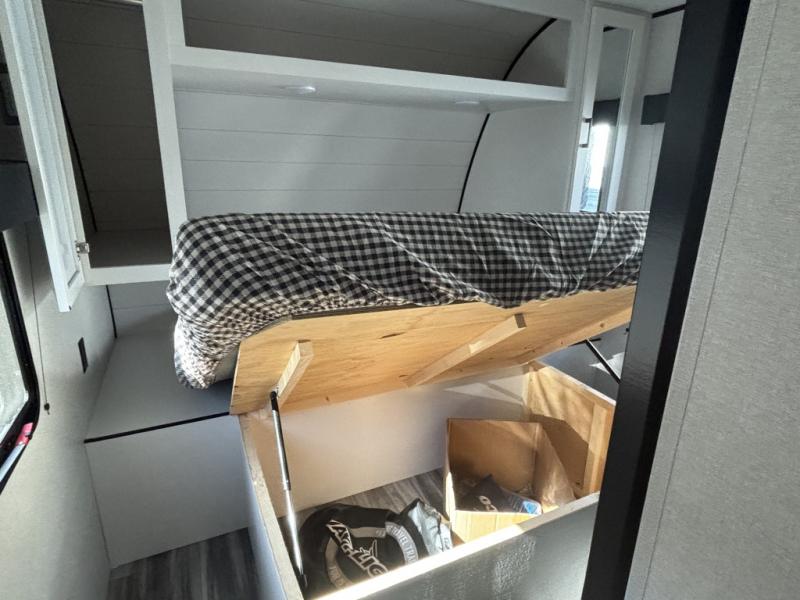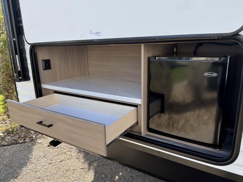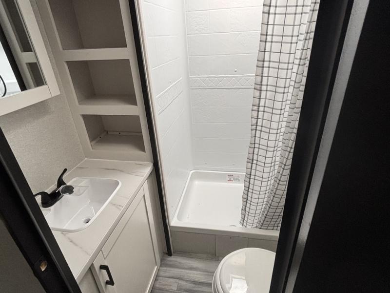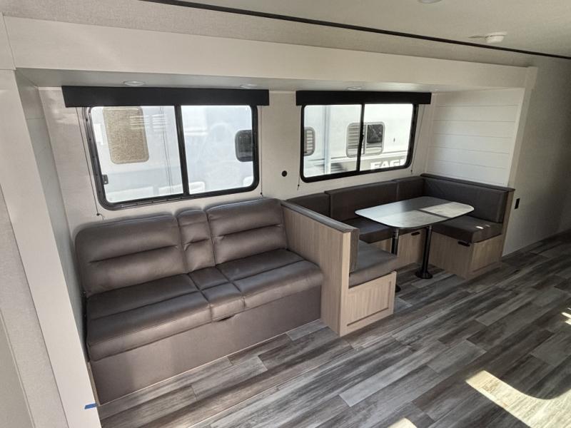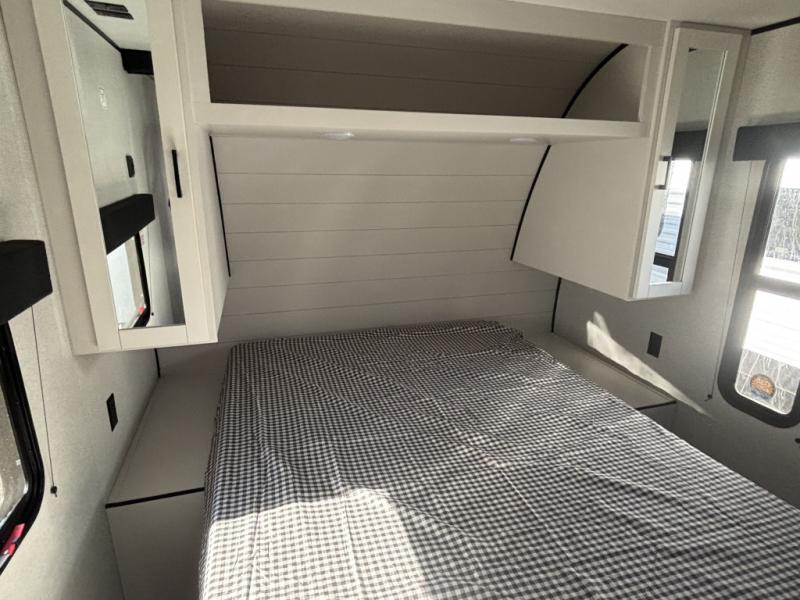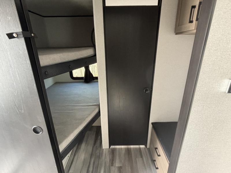 It's time to ditch that old tent and upgrade to this spacious travel trailer! The little ones or your guests will love the double-size bunks in the rear bunkhouse, along with a half bath and storage space for their things. You'll enjoy the front private bedroom all to yourselves with a queen bed and dual wardrobes, and the full bath is close by for easy nighttime use. A U-shaped dinette slide and sofa in the main living area provide your crew with space to relax and dine together, and the fully equipped kitchen lets you cook up your best meals. Outside, you'll find exterior storage, a 20' power awning, plus an outdoor kitchen to enjoy a sunrise breakfast!