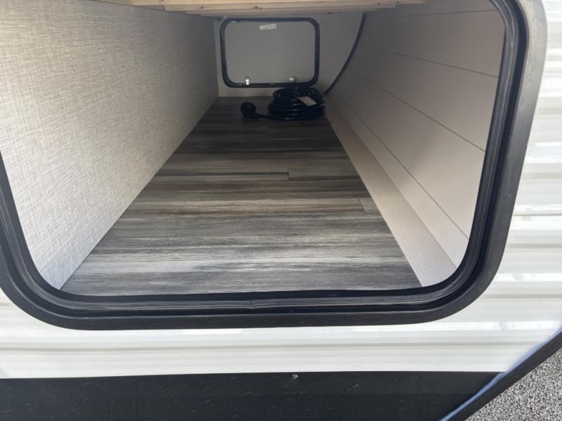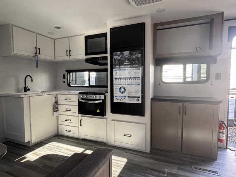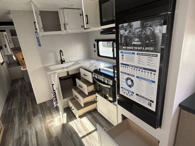 The Jayco Jay Flight SLX travel trailer is quite easy to own because it is lightweight for an easier towing experience. Built on a fully integrated A-frame with galvanized-steel, impact-resistant wheel wells, the Jay Flight SLX has quality at its very foundation. That quality continues on to the electric self-adjusting brakes, easy-lube hubs, Magnum Truss roof system, and LP quick connect. Some of what the mandatory Customer Value Package includes is backup camera prep, Keyed-Alike entry and baggage doors, and an on-demand tankless water heater.