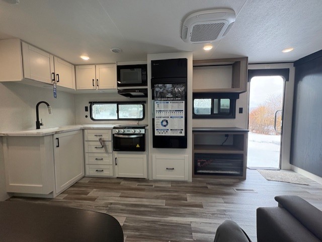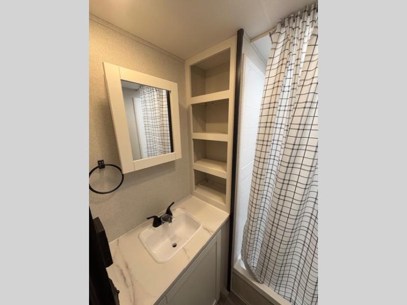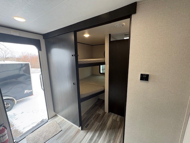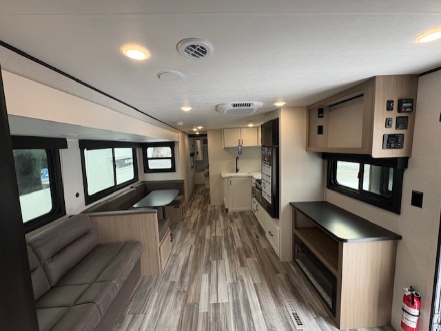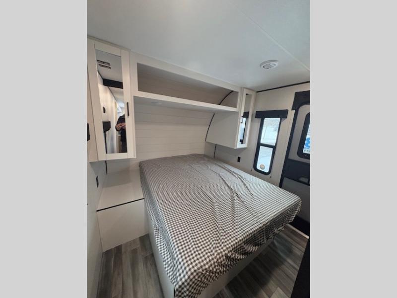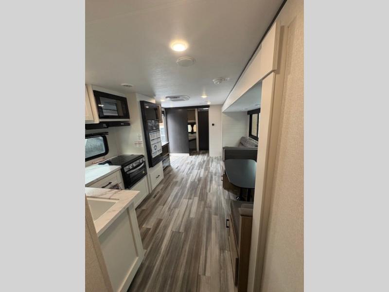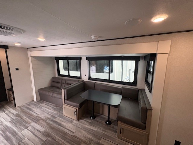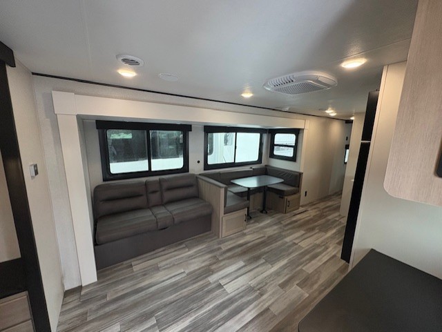 It's time to ditch that old tent and upgrade to this spacious travel trailer! The little ones or your guests will love the double-size bunks in the rear bunkhouse, along with a half bath and storage space for their things. You'll enjoy the front private bedroom all to yourselves with a queen bed and dual wardrobes, and the full bath is close by for easy nighttime use. A U-shaped dinette slide and sofa in the main living area provide your crew with space to relax and dine together, and the fully equipped kitchen lets you cook up your best meals. Outside, you'll find exterior storage, a 20' power awning, plus an outdoor kitchen to enjoy a sunrise breakfast!