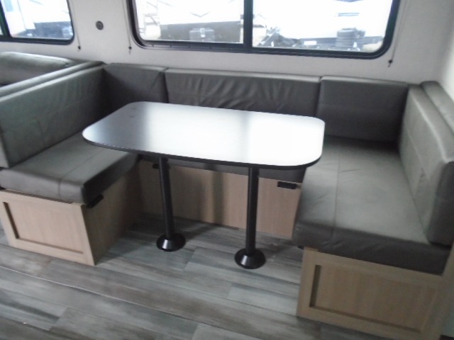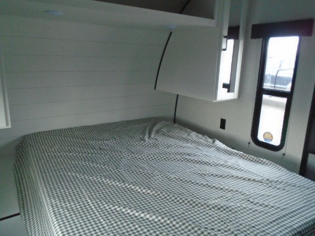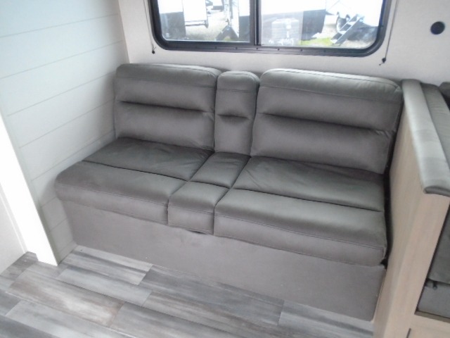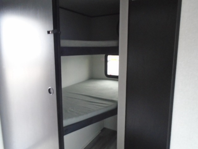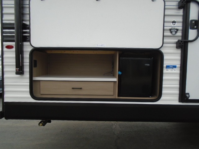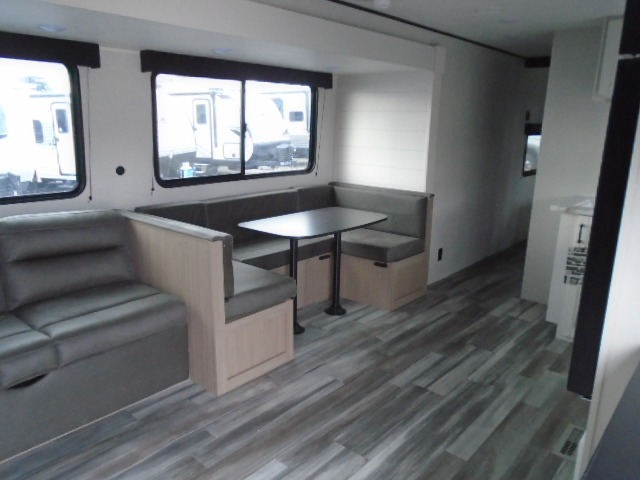 It's time to ditch that old tent and upgrade to this spacious travel trailer! The little ones or your guests will love the double-size bunks in the rear bunkhouse, along with a half bath and storage space for their things. You'll enjoy the front private bedroom all to yourselves with a queen bed and dual wardrobes, and the full bath is close by for easy nighttime use. A U-shaped dinette slide and sofa in the main living area provide your crew with space to relax and dine together, and the fully equipped kitchen lets you cook up your best meals. Outside, you'll find exterior storage, a 20' power awning, plus an outdoor kitchen to enjoy a sunrise breakfast!