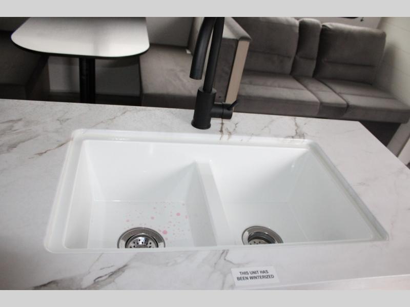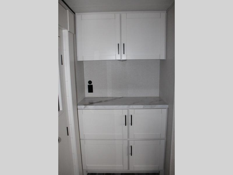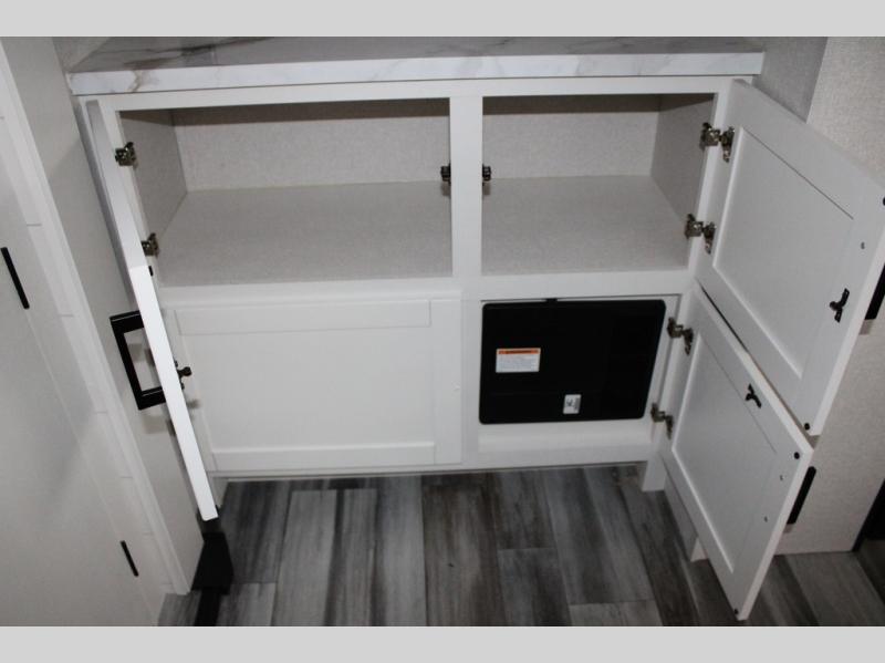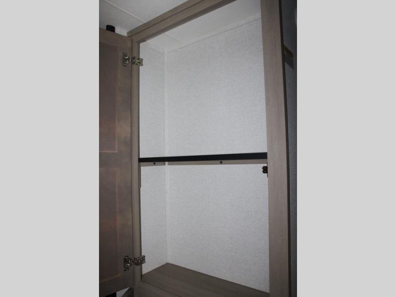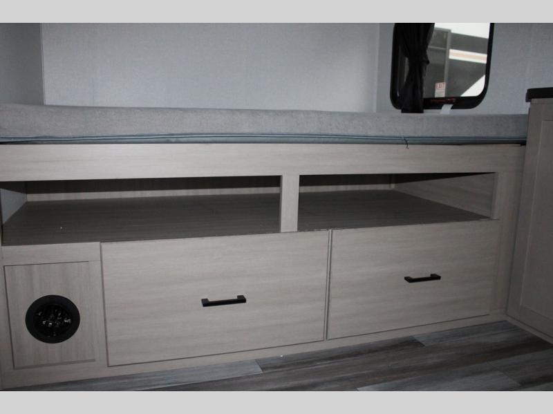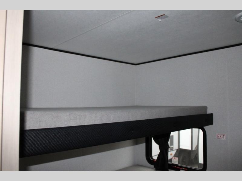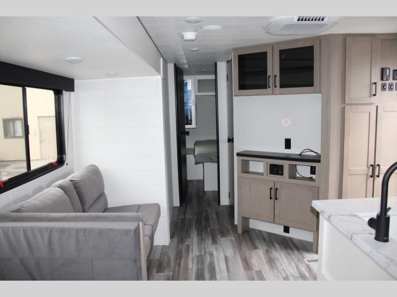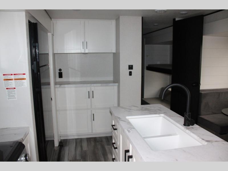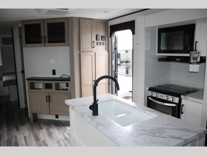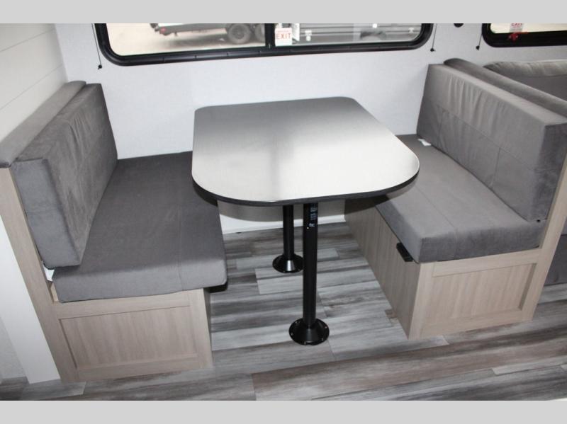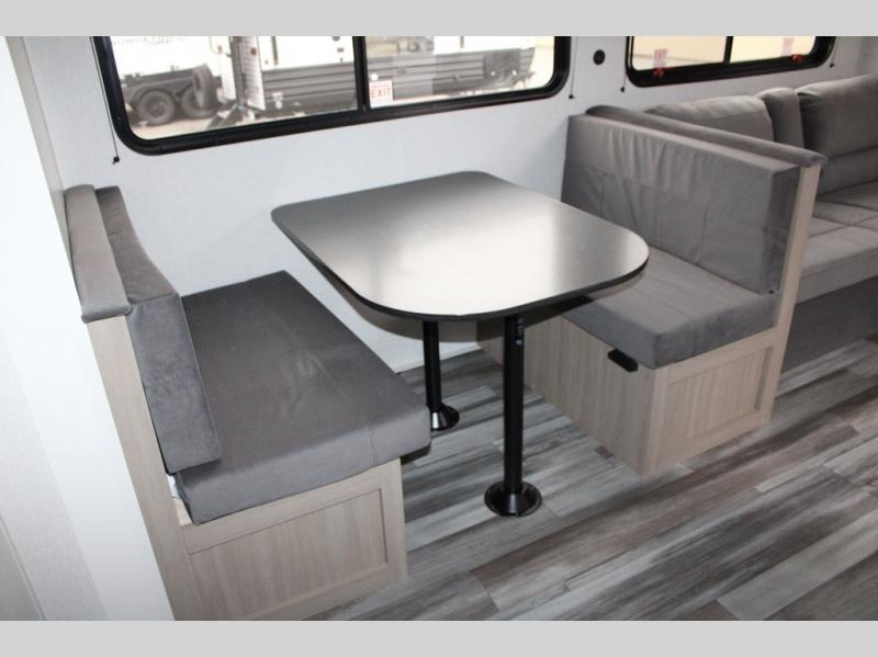The whole gang can join along on camping trips in this triple slide out travel trailer! There is a rear private bunkhouse with a bunk bed and J-cube futon sofa below plus a second bunk bed and storage below to help keep this space tidy. You'll find your own space in the front private bedroom, which also includes a queen bed and dual wardrobes. The middle kitchen and living room will be a favorite place to come together since there is a jack-knife sofa and booth dinette, a kitchen island, plus a fully-equipped kitchen to make meals each day. There is also an exterior camp kitchen when you want fresh air!
