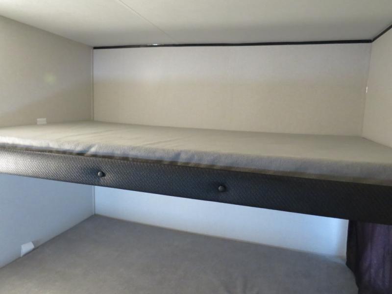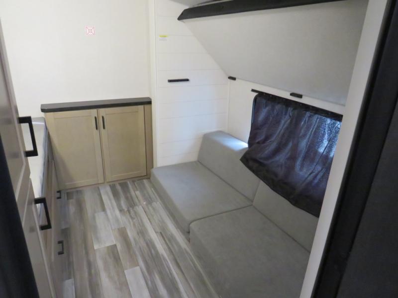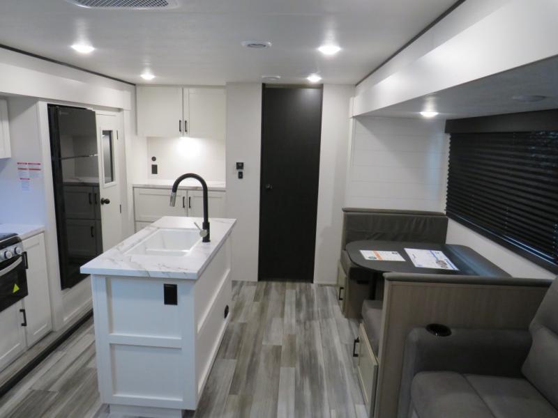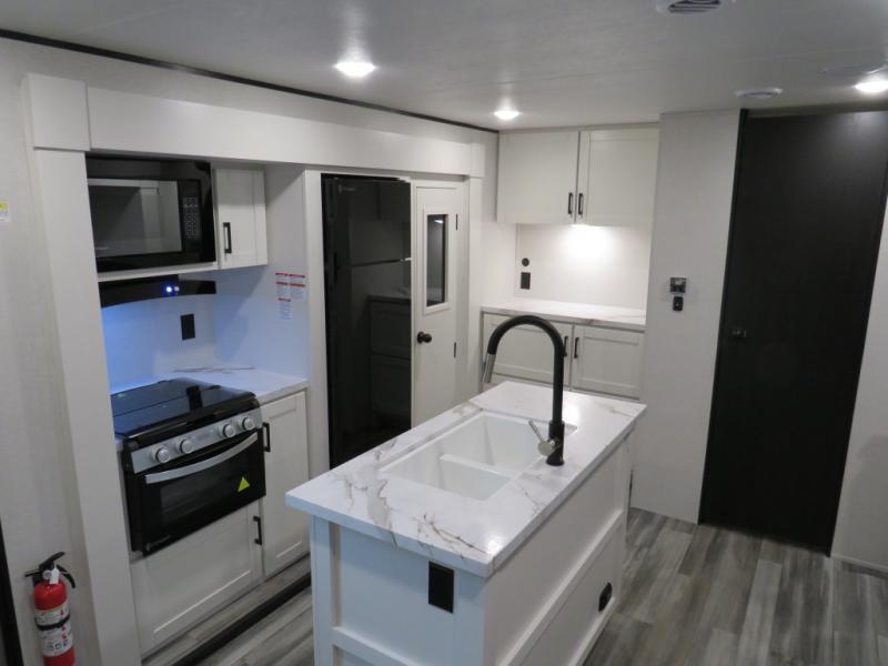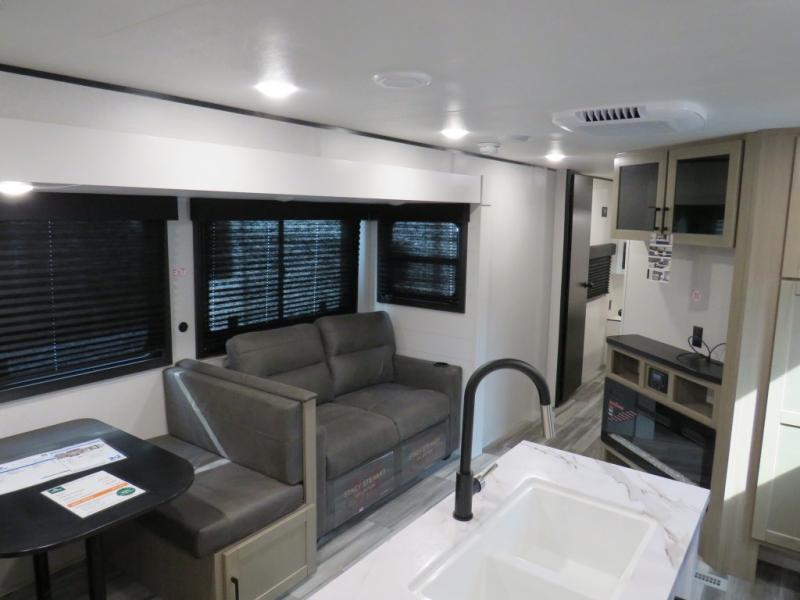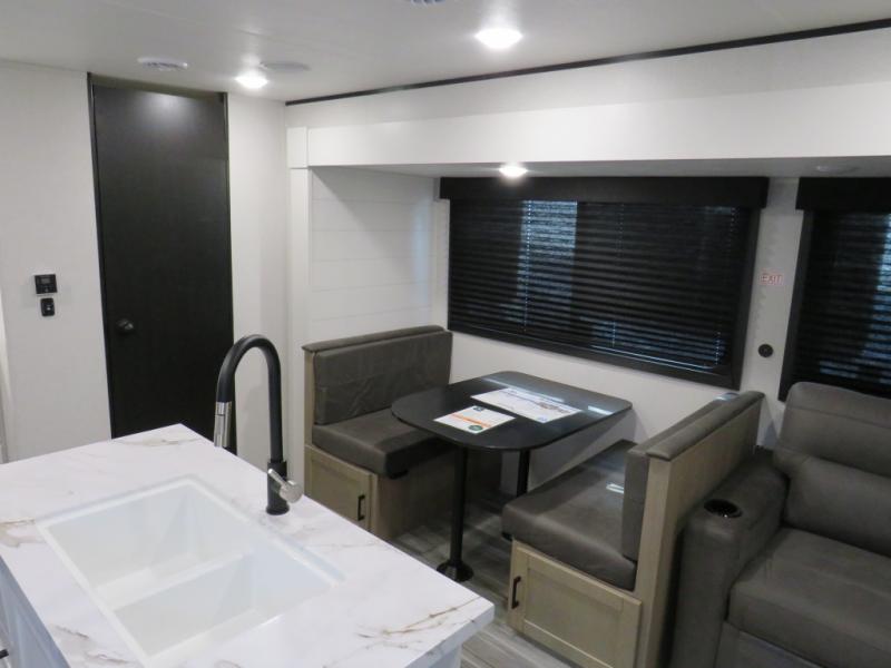 The whole gang can join along on camping trips in this triple slide out travel trailer! There is a rear private bunkhouse with a bunk bed and J-cube futon sofa below plus a second bunk bed and storage below to help keep this space tidy. You'll find your own space in the front private bedroom, which also includes a queen bed and dual wardrobes. The middle kitchen and living room will be a favorite place to come together since there is a jack-knife sofa and booth dinette, a kitchen island, plus a fully-equipped kitchen to make meals each day. There is also an exterior camp kitchen when you want fresh air!