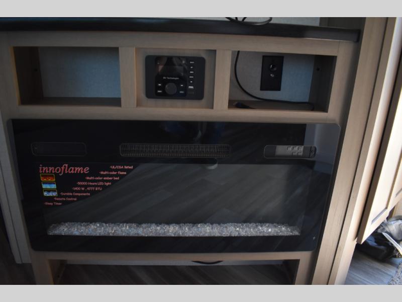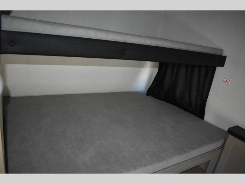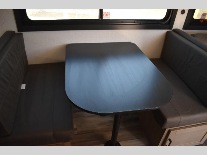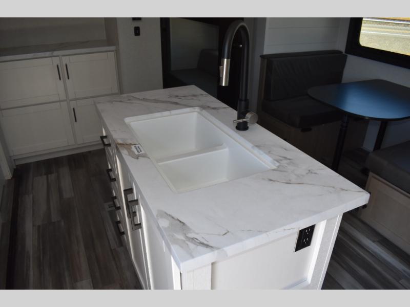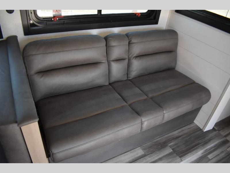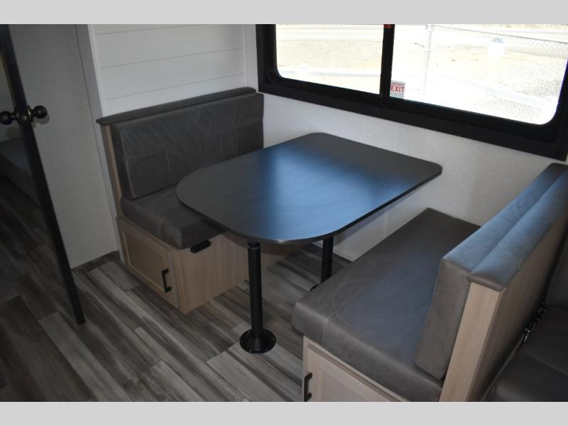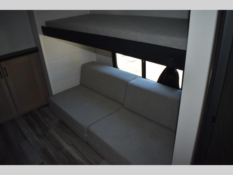 The whole gang can join along on camping trips in this triple slide out travel trailer! There is a rear private bunkhouse with a bunk bed and J-cube futon sofa below plus a second bunk bed and storage below to help keep this space tidy. You'll find your own space in the front private bedroom, which also includes a queen bed and dual wardrobes. The middle kitchen and living room will be a favorite place to come together since there is a jack-knife sofa and booth dinette, a kitchen island, plus a fully-equipped kitchen to make meals each day. There is also an exterior camp kitchen when you want fresh air!