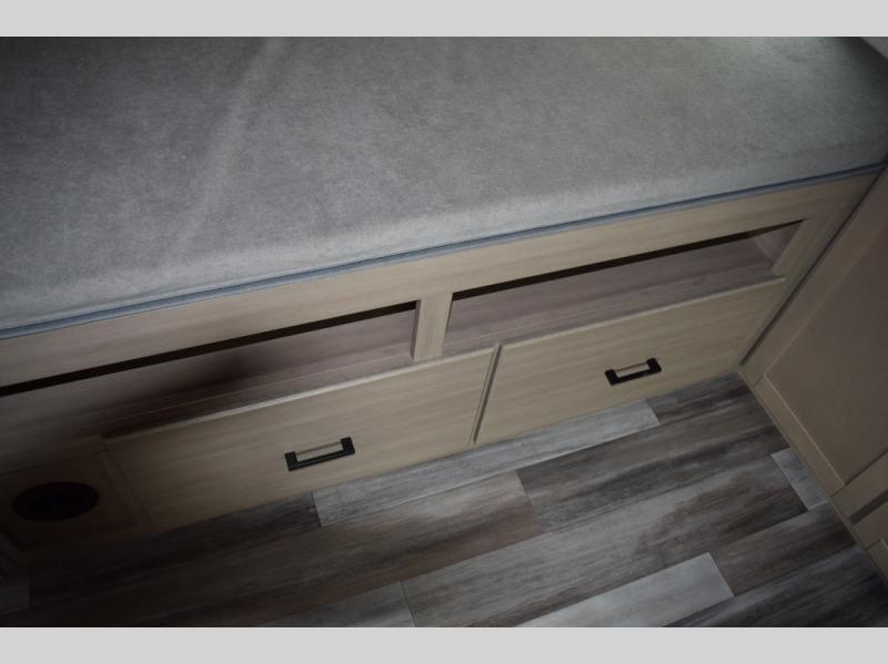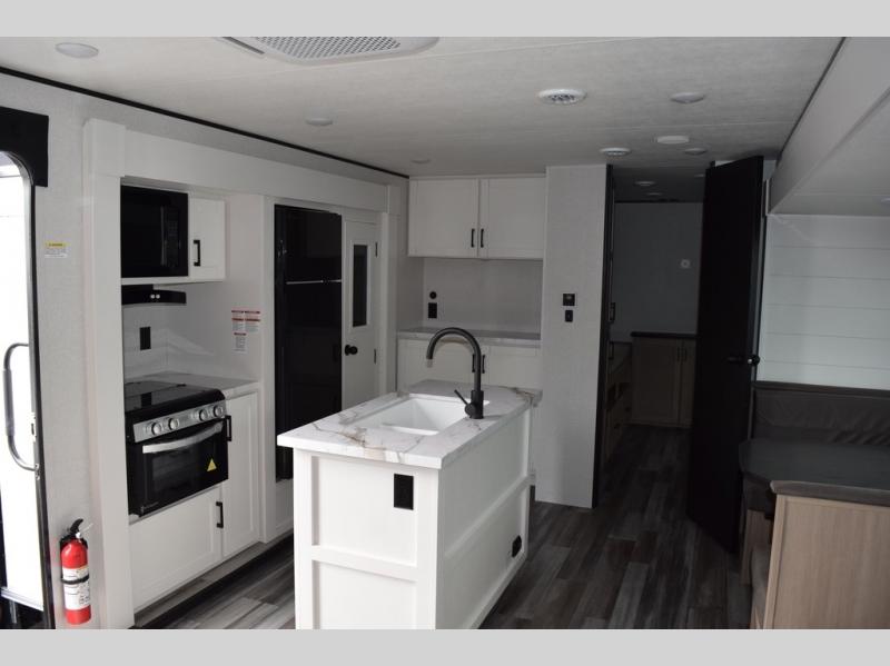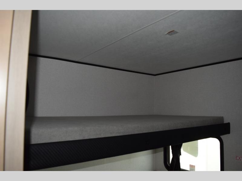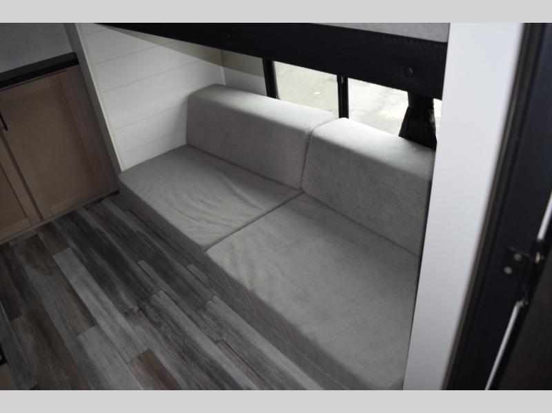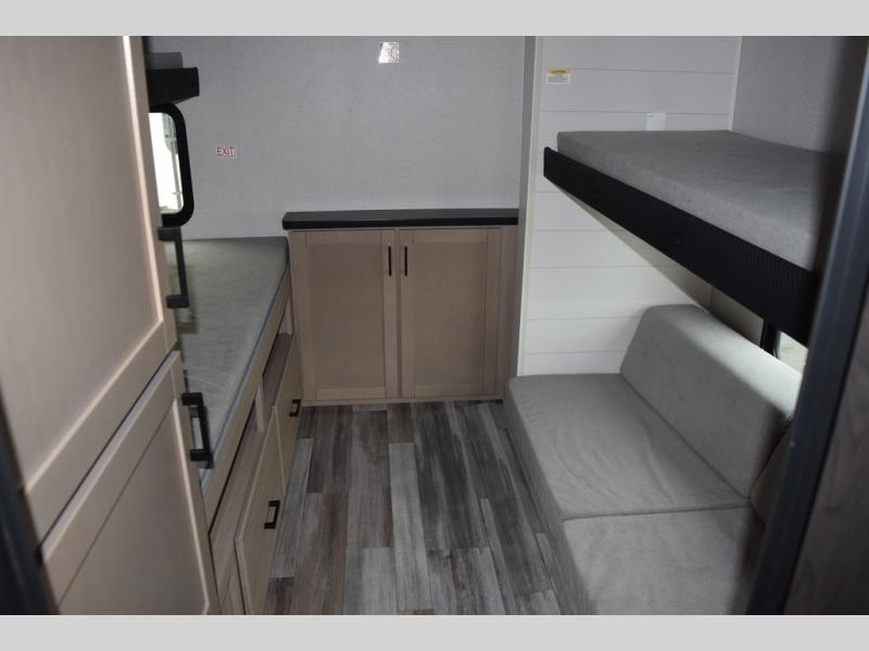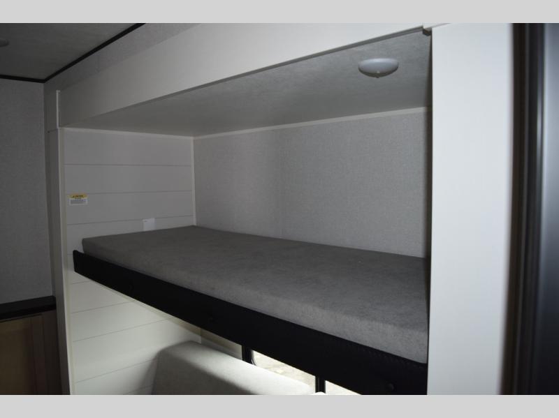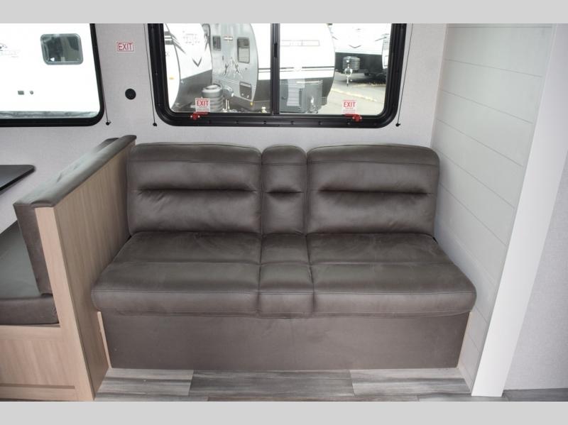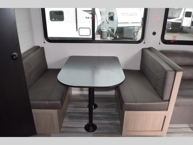 The whole gang can join along on camping trips in this triple slide out travel trailer! There is a rear private bunkhouse with a bunk bed and J-cube futon sofa below plus a second bunk bed and storage below to help keep this space tidy. You'll find your own space in the front private bedroom, which also includes a queen bed and dual wardrobes. The middle kitchen and living room will be a favorite place to come together since there is a jack-knife sofa and booth dinette, a kitchen island, plus a fully-equipped kitchen to make meals each day. There is also an exterior camp kitchen when you want fresh air!