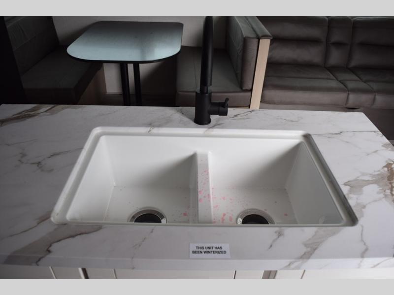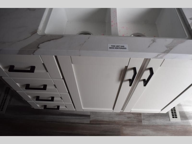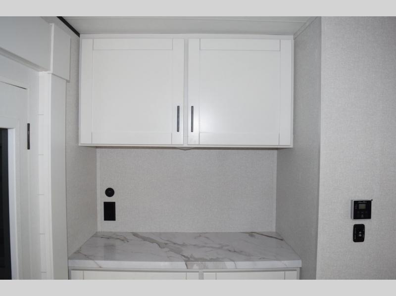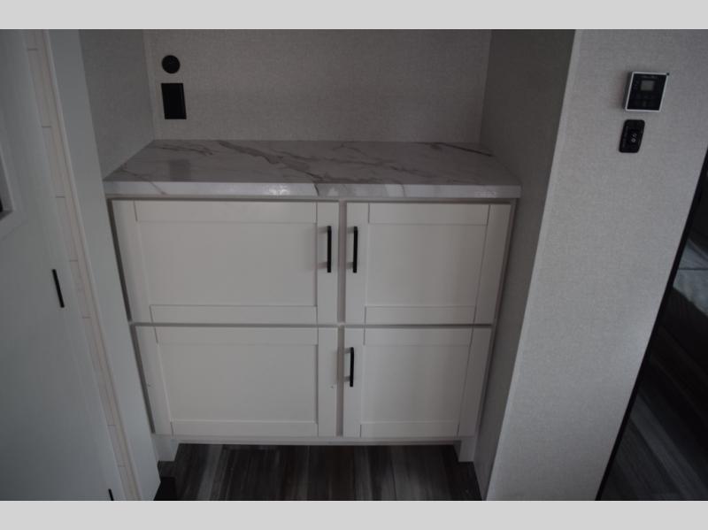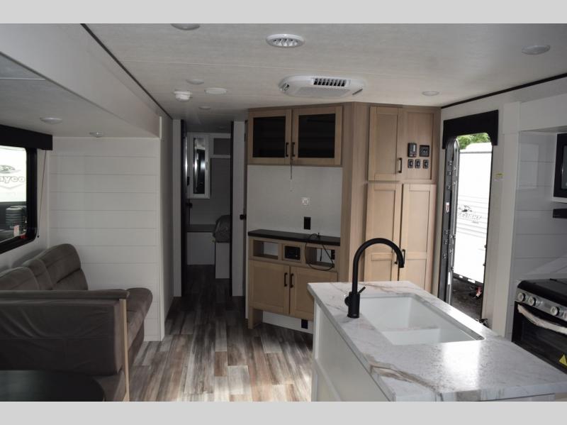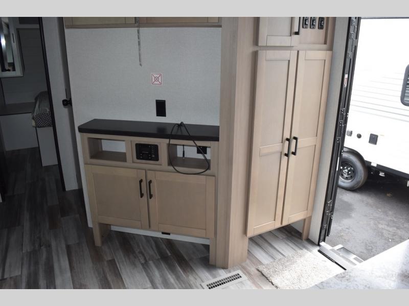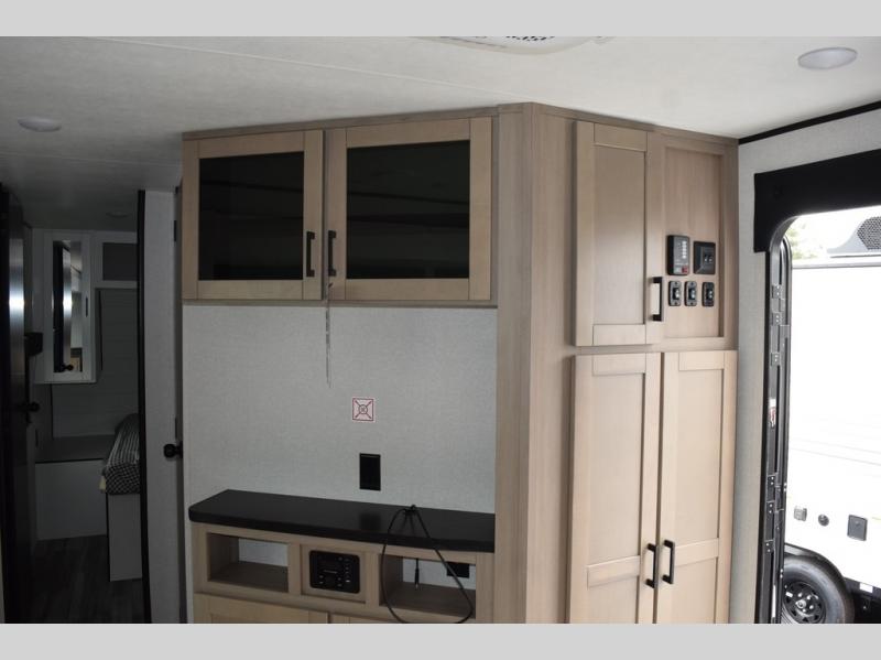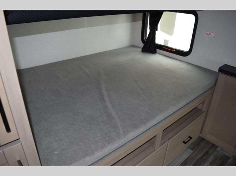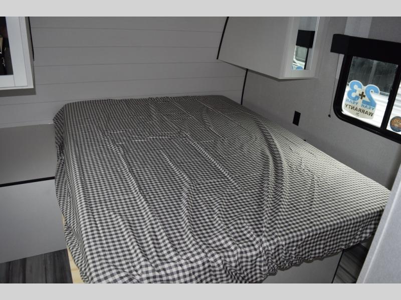 The whole gang can join along on camping trips in this triple slide out travel trailer! There is a rear private bunkhouse with a bunk bed and J-cube futon sofa below plus a second bunk bed and storage below to help keep this space tidy. You'll find your own space in the front private bedroom, which also includes a queen bed and dual wardrobes. The middle kitchen and living room will be a favorite place to come together since there is a jack-knife sofa and booth dinette, a kitchen island, plus a fully-equipped kitchen to make meals each day. There is also an exterior camp kitchen when you want fresh air!