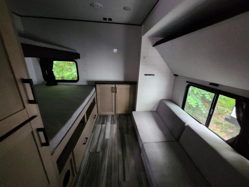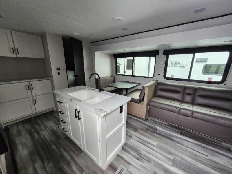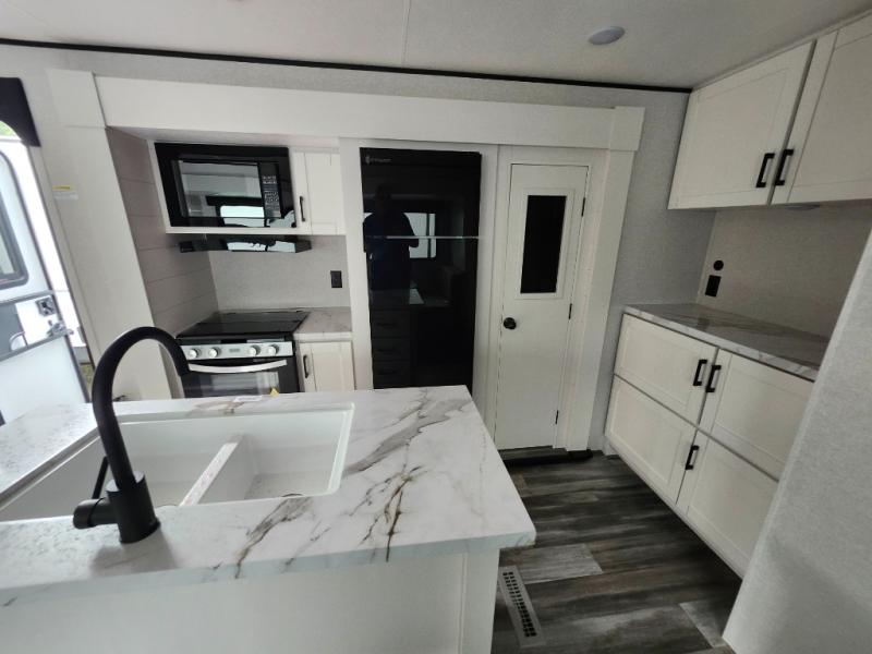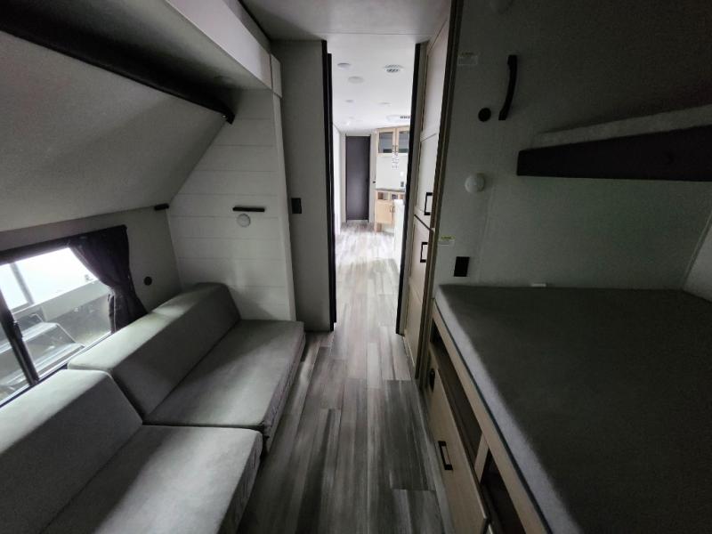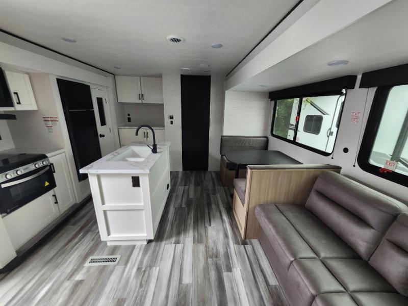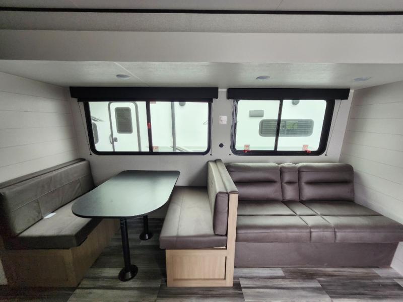 The whole gang can join along on camping trips in this triple slide out travel trailer! There is a rear private bunkhouse with a bunk bed and J-cube futon sofa below plus a second bunk bed and storage below to help keep this space tidy. You'll find your own space in the front private bedroom, which also includes a queen bed and dual wardrobes. The middle kitchen and living room will be a favorite place to come together since there is a jack-knife sofa and booth dinette, a kitchen island, plus a fully-equipped kitchen to make meals each day. There is also an exterior camp kitchen when you want fresh air!