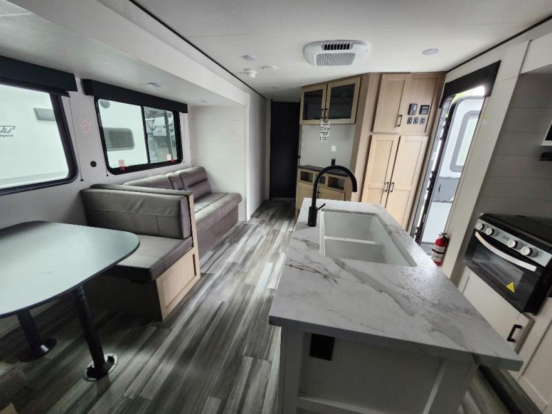 The Jayco Jay Flight SLX travel trailer is quite easy to own because it is lightweight for an easier towing experience. Built on a fully integrated A-frame with galvanized-steel, impact-resistant wheel wells, the Jay Flight SLX has quality at its very foundation. That quality continues on to the electric self-adjusting brakes, easy-lube hubs, Magnum Truss roof system, and LP quick connect. Some of what the mandatory Customer Value Package includes is backup camera prep, Keyed-Alike entry and baggage doors, and an on-demand tankless water heater.