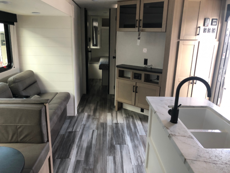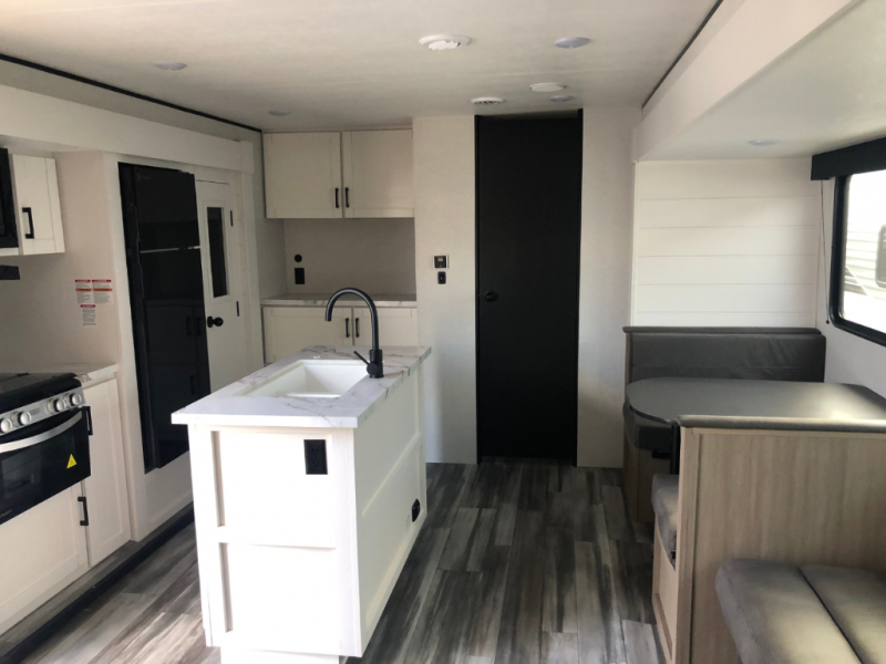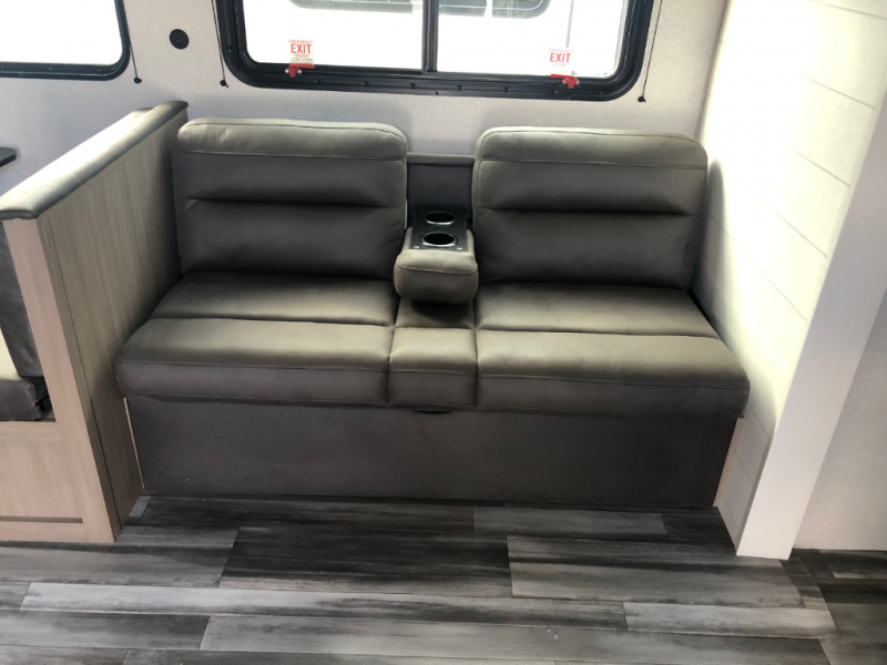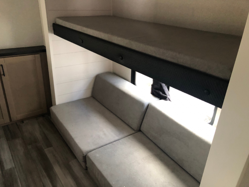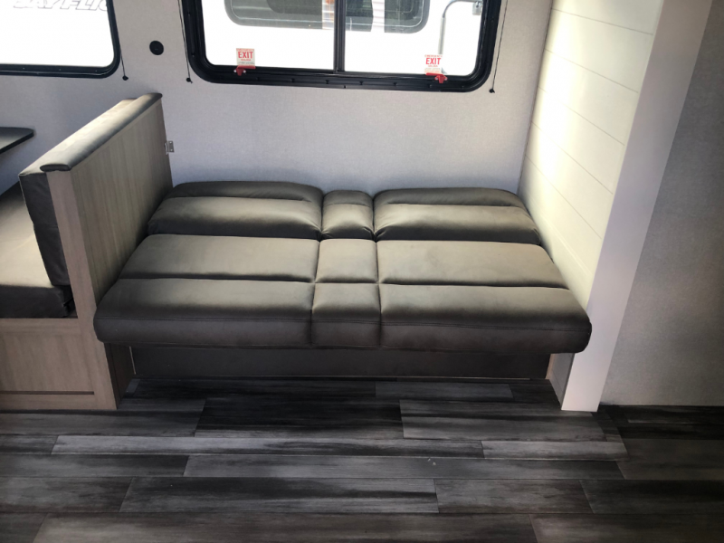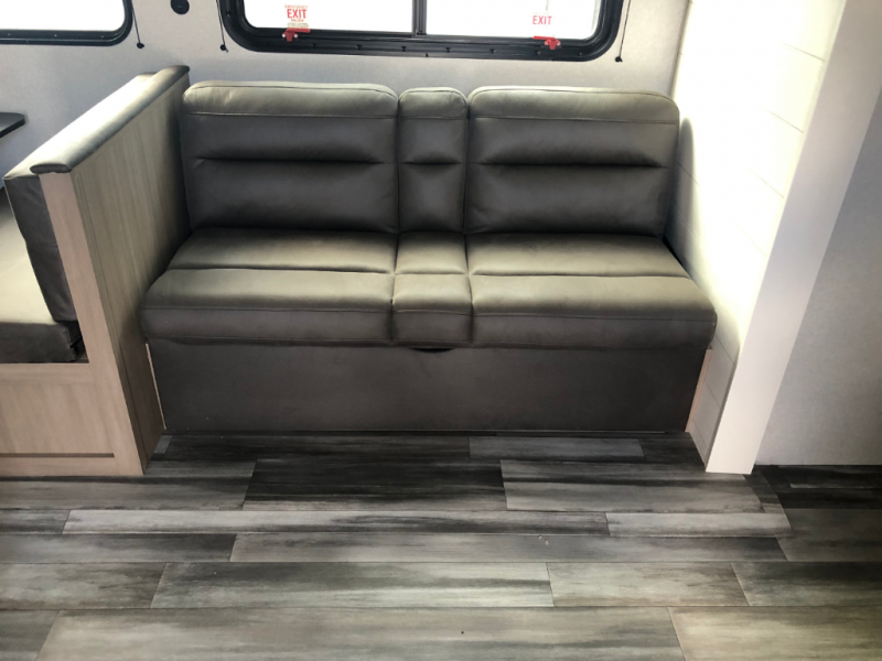 The whole gang can join along on camping trips in this triple slide out travel trailer! There is a rear private bunkhouse with a bunk bed and J-cube futon sofa below plus a second bunk bed and storage below to help keep this space tidy. You'll find your own space in the front private bedroom, which also includes a queen bed and dual wardrobes. The middle kitchen and living room will be a favorite place to come together since there is a jack-knife sofa and booth dinette, a kitchen island, plus a fully-equipped kitchen to make meals each day. There is also an exterior camp kitchen when you want fresh air!