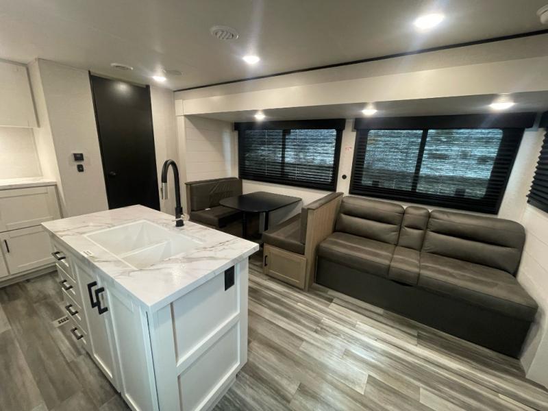 The whole gang can join along on camping trips in this triple slide out travel trailer! There is a rear private bunkhouse with a bunk bed and J-cube futon sofa below plus a second bunk bed and storage below to help keep this space tidy. You'll find your own space in the front private bedroom, which also includes a queen bed and dual wardrobes. The middle kitchen and living room will be a favorite place to come together since there is a jack-knife sofa and booth dinette, a kitchen island, plus a fully-equipped kitchen to make meals each day. There is also an exterior camp kitchen when you want fresh air!
