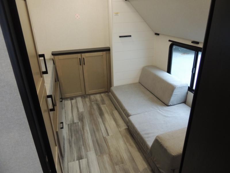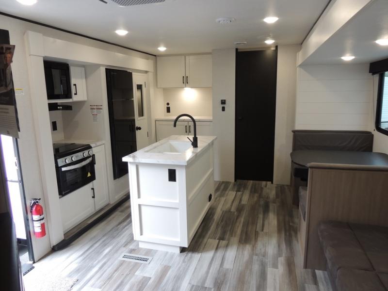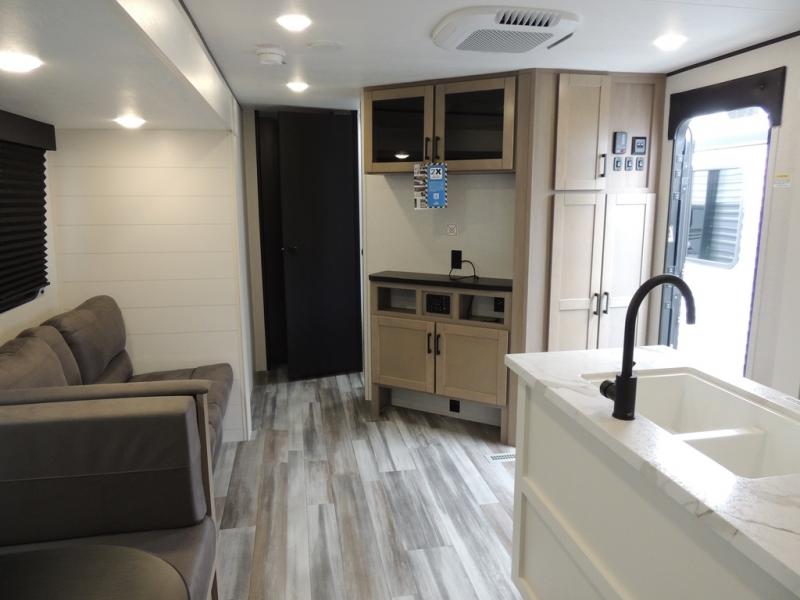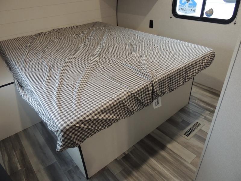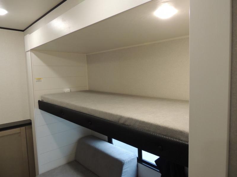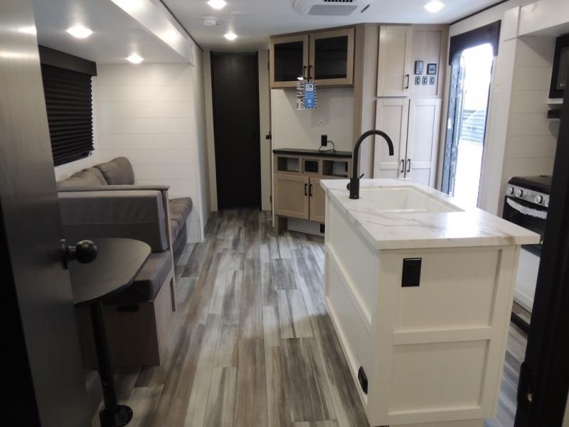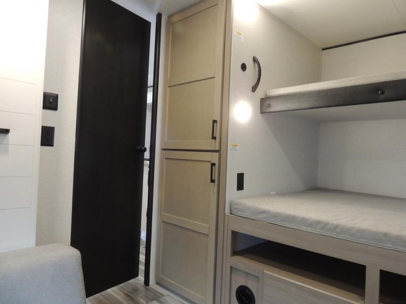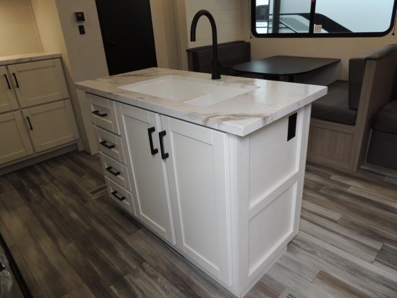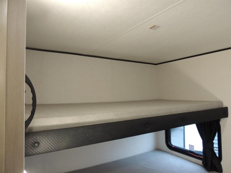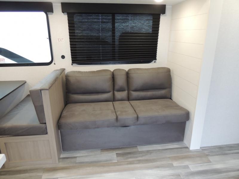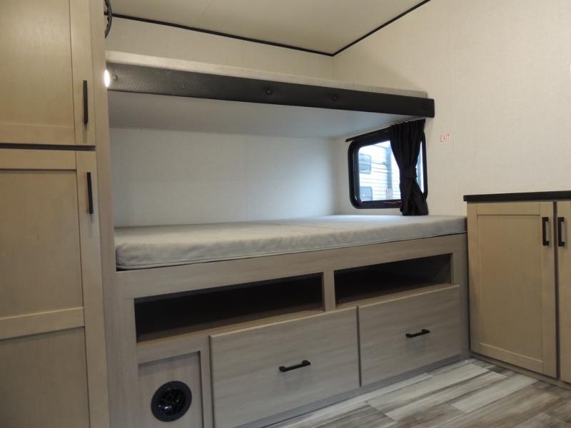 The whole gang can join along on camping trips in this triple slide out travel trailer! There is a rear private bunkhouse with a bunk bed and J-cube futon sofa below plus a second bunk bed and storage below to help keep this space tidy. You'll find your own space in the front private bedroom, which also includes a queen bed and dual wardrobes. The middle kitchen and living room will be a favorite place to come together since there is a jack-knife sofa and booth dinette, a kitchen island, plus a fully-equipped kitchen to make meals each day. There is also an exterior camp kitchen when you want fresh air!