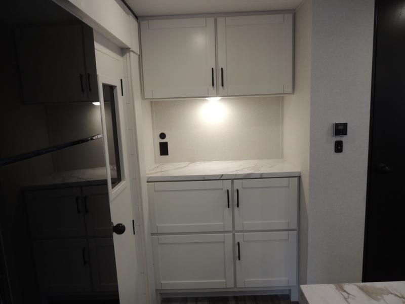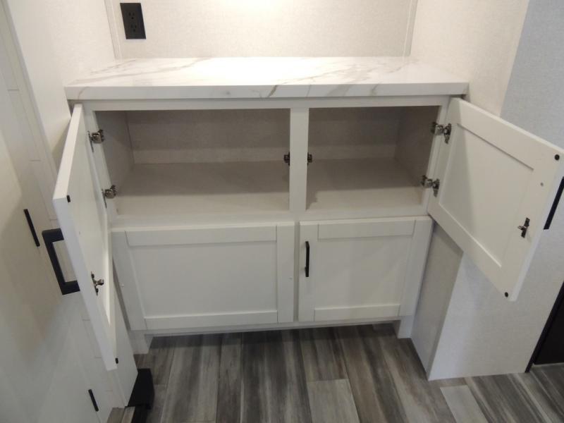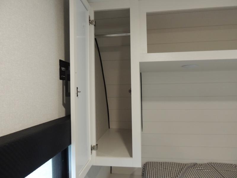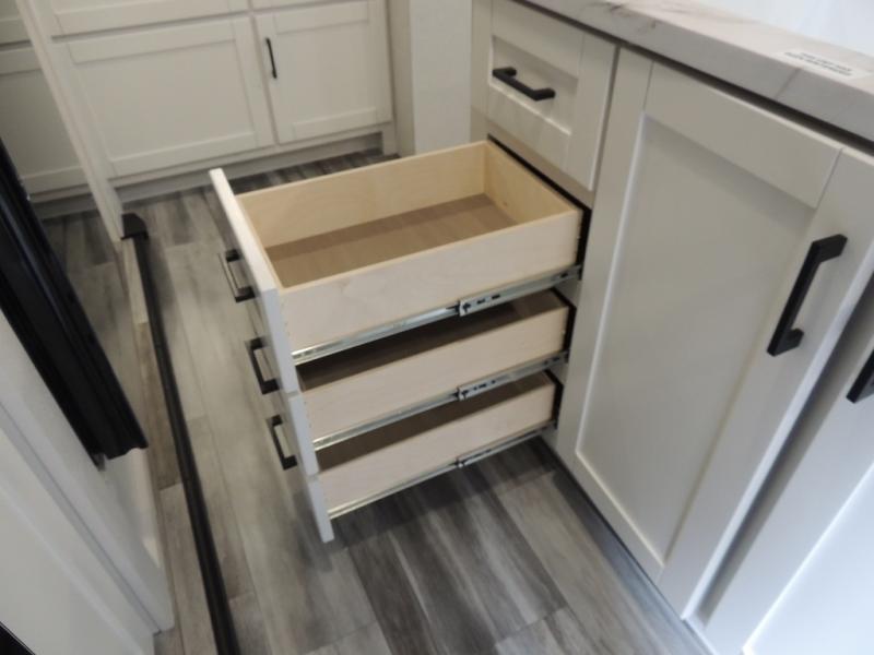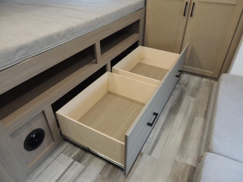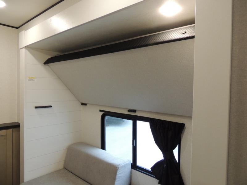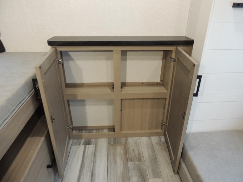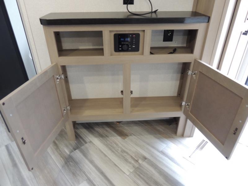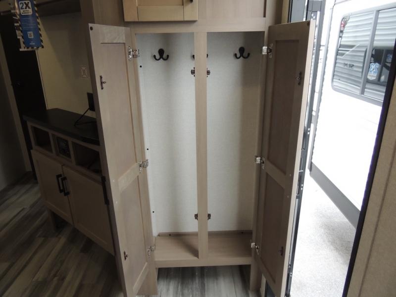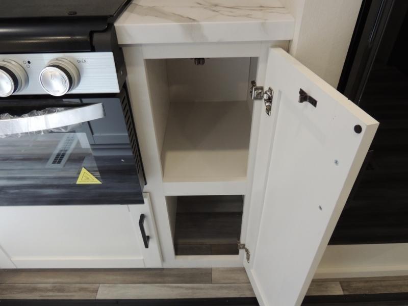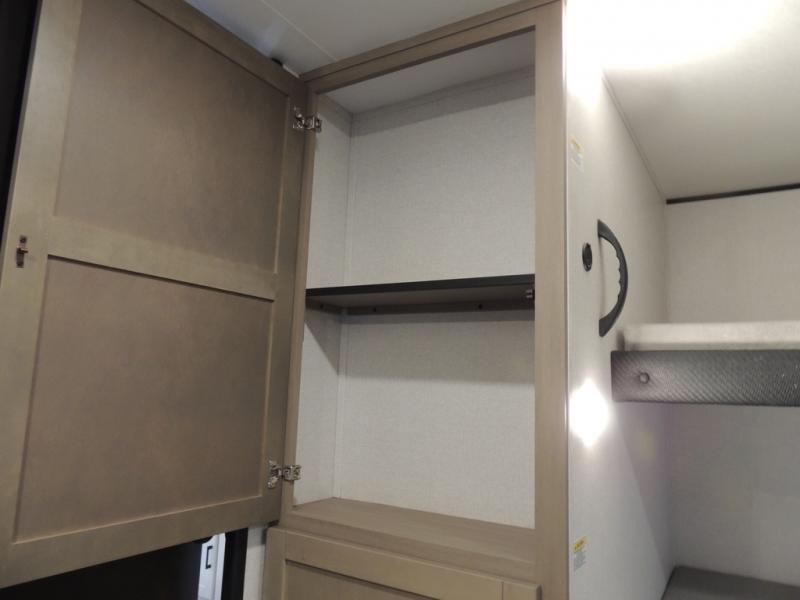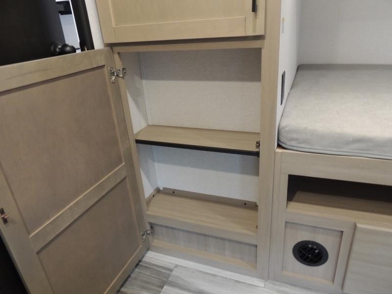 The whole gang can join along on camping trips in this triple slide out travel trailer! There is a rear private bunkhouse with a bunk bed and J-cube futon sofa below plus a second bunk bed and storage below to help keep this space tidy. You'll find your own space in the front private bedroom, which also includes a queen bed and dual wardrobes. The middle kitchen and living room will be a favorite place to come together since there is a jack-knife sofa and booth dinette, a kitchen island, plus a fully-equipped kitchen to make meals each day. There is also an exterior camp kitchen when you want fresh air!