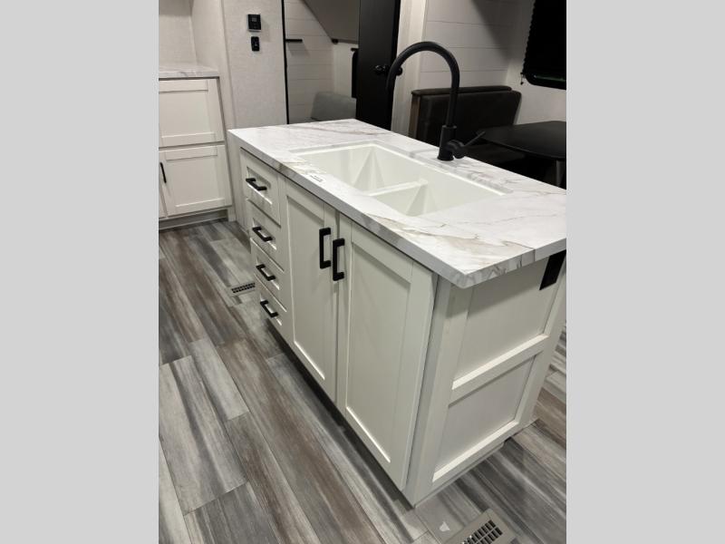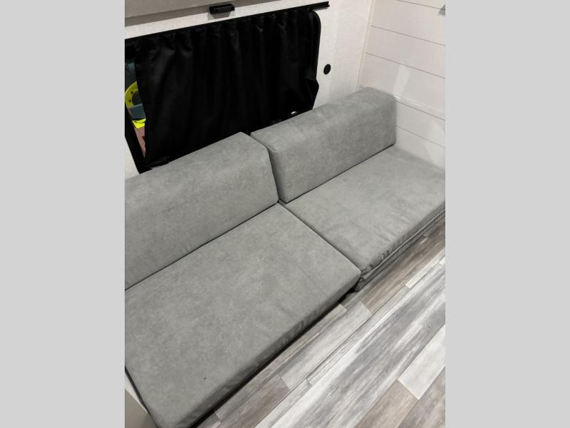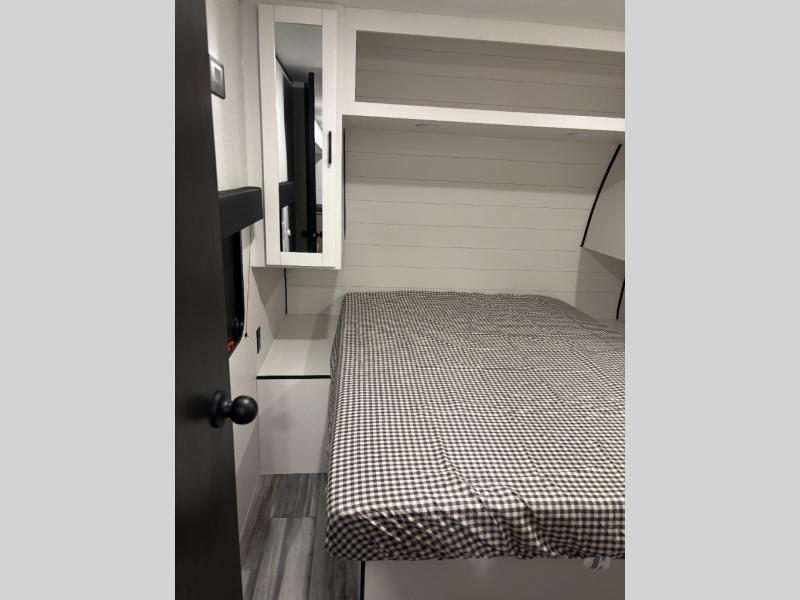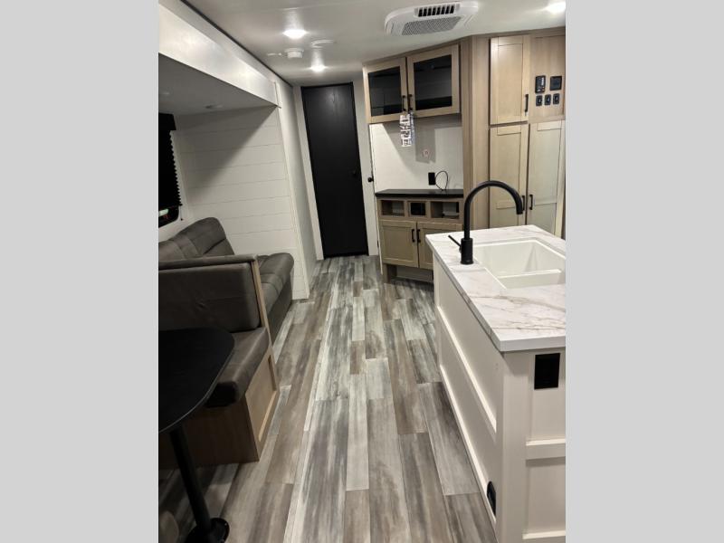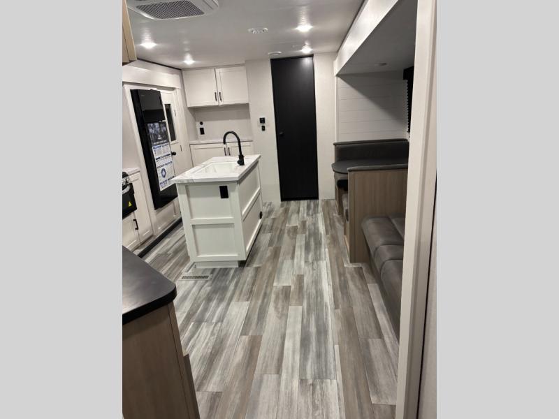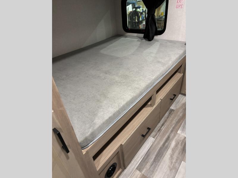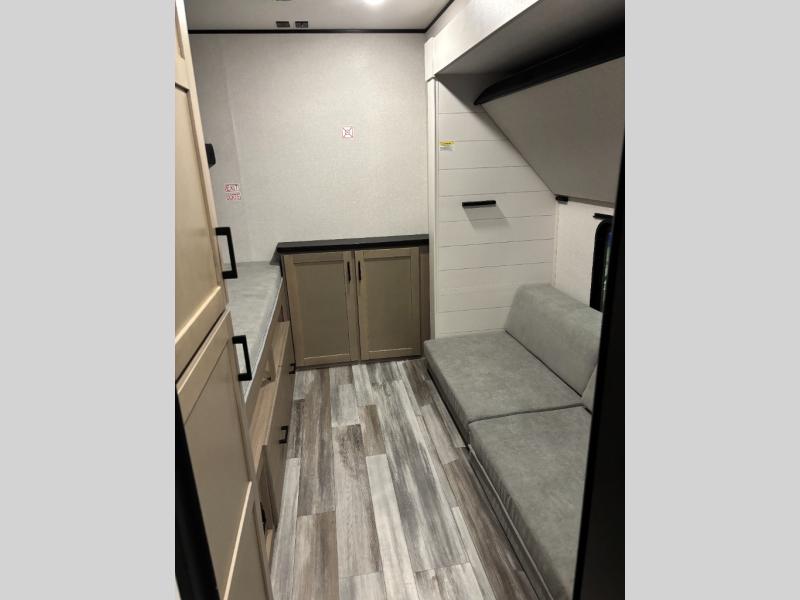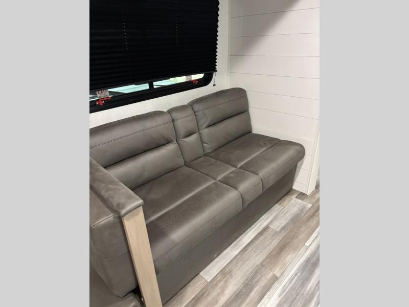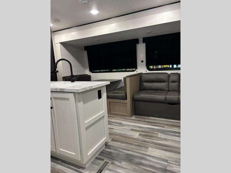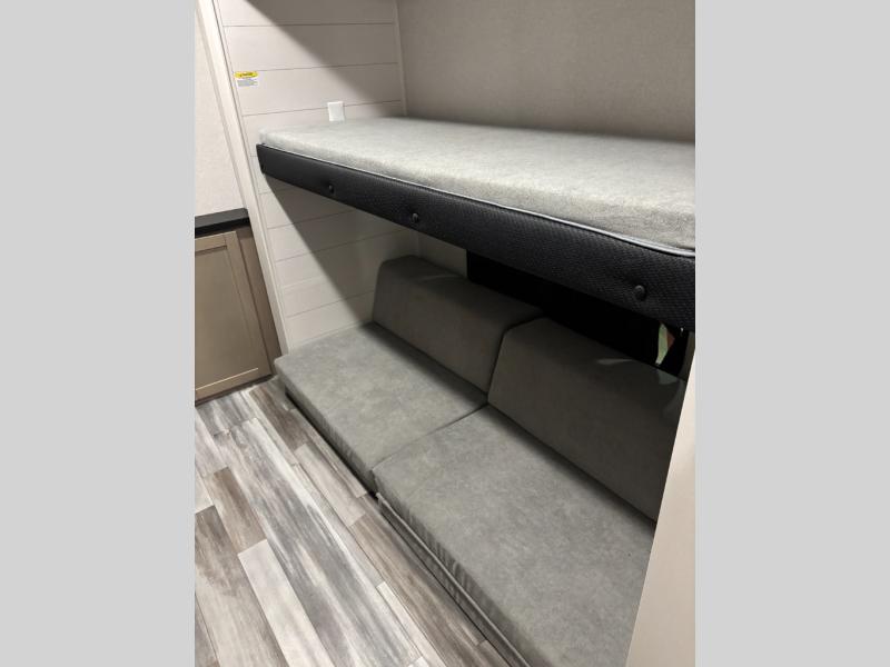 The whole gang can join along on camping trips in this triple slide out travel trailer! There is a rear private bunkhouse with a bunk bed and J-cube futon sofa below plus a second bunk bed and storage below to help keep this space tidy. You'll find your own space in the front private bedroom, which also includes a queen bed and dual wardrobes. The middle kitchen and living room will be a favorite place to come together since there is a jack-knife sofa and booth dinette, a kitchen island, plus a fully-equipped kitchen to make meals each day. There is also an exterior camp kitchen when you want fresh air!