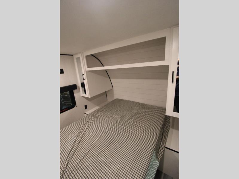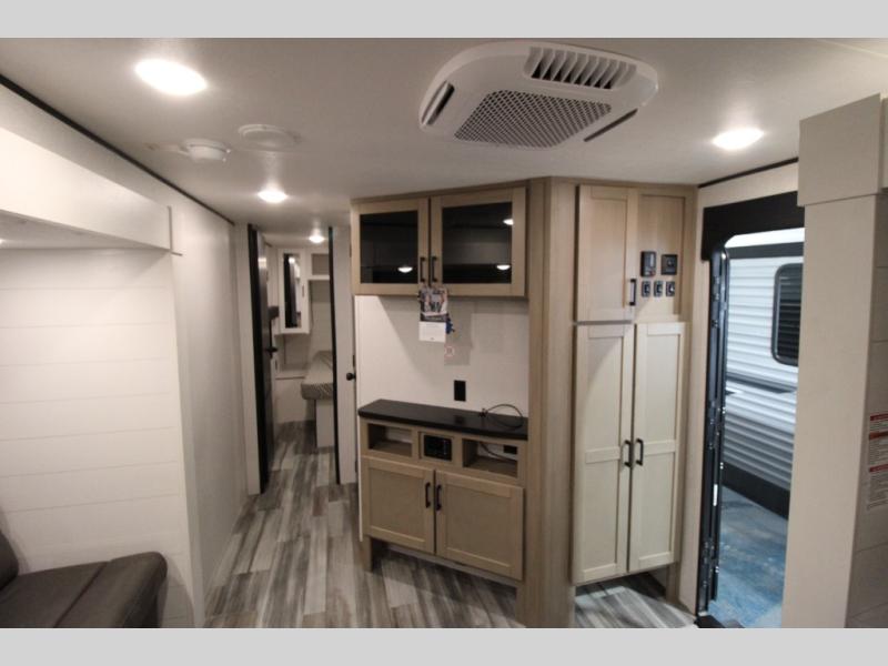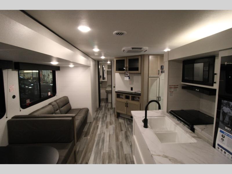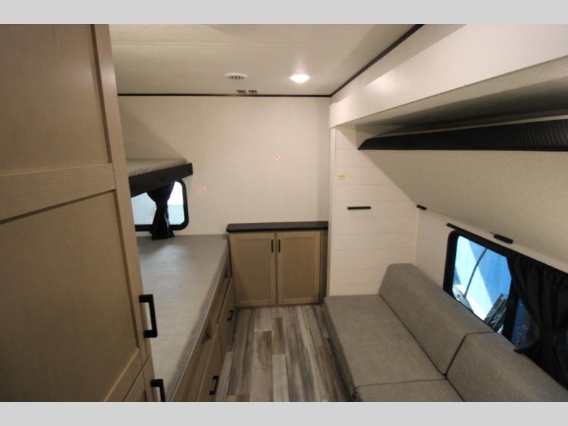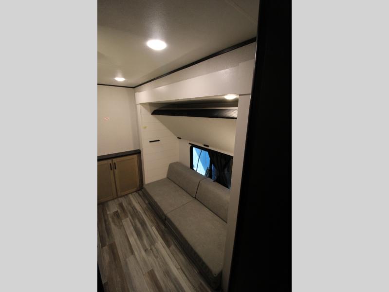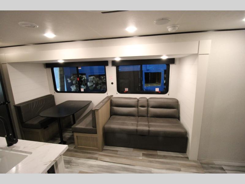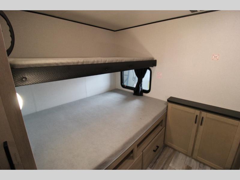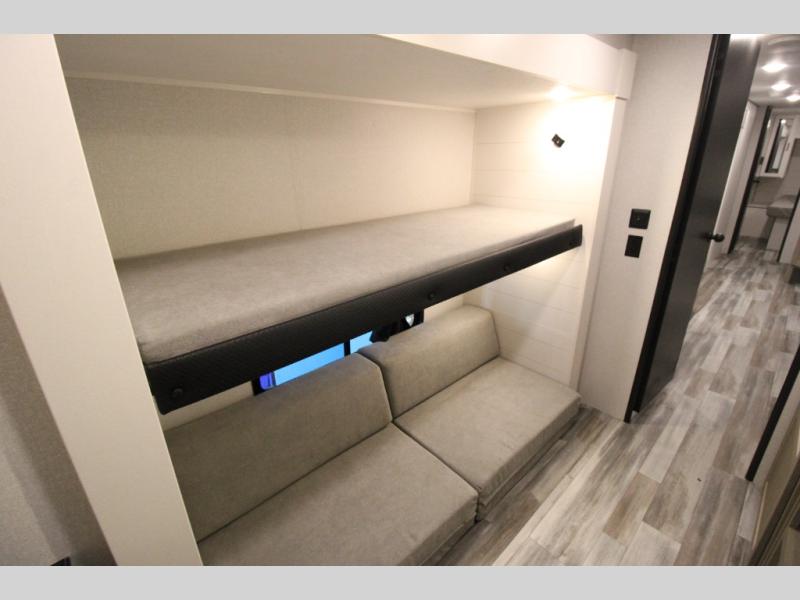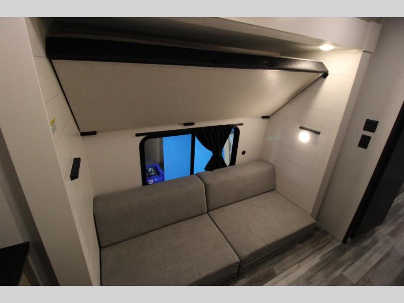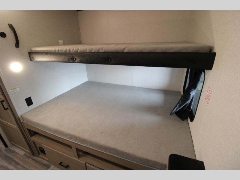 The whole gang can join along on camping trips in this triple slide out travel trailer! There is a rear private bunkhouse with a bunk bed and J-cube futon sofa below plus a second bunk bed and storage below to help keep this space tidy. You'll find your own space in the front private bedroom, which also includes a queen bed and dual wardrobes. The middle kitchen and living room will be a favorite place to come together since there is a jack-knife sofa and booth dinette, a kitchen island, plus a fully-equipped kitchen to make meals each day. There is also an exterior camp kitchen when you want fresh air!