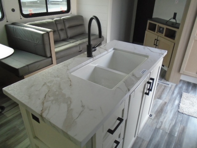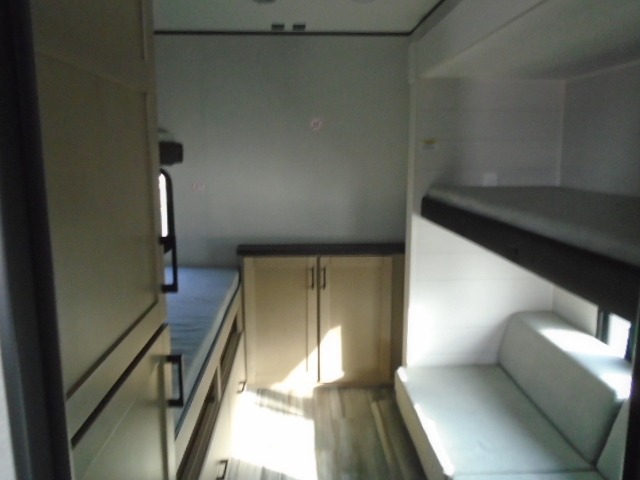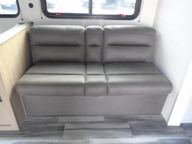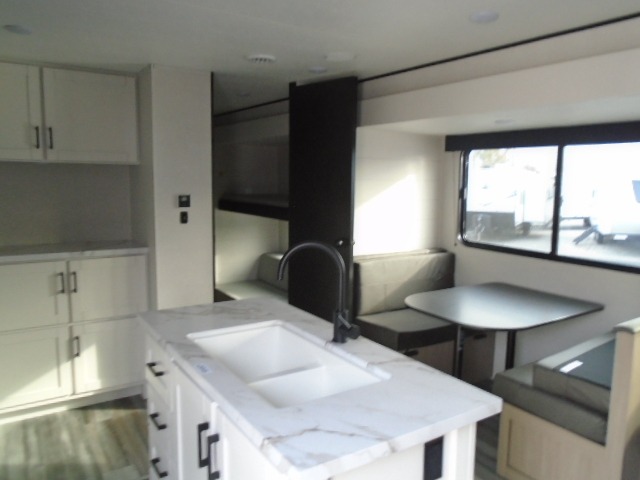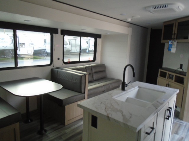 The whole gang can join along on camping trips in this triple slide out travel trailer! There is a rear private bunkhouse with a bunk bed and J-cube futon sofa below plus a second bunk bed and storage below to help keep this space tidy. You'll find your own space in the front private bedroom, which also includes a queen bed and dual wardrobes. The middle kitchen and living room will be a favorite place to come together since there is a jack-knife sofa and booth dinette, a kitchen island, plus a fully-equipped kitchen to make meals each day. There is also an exterior camp kitchen when you want fresh air!