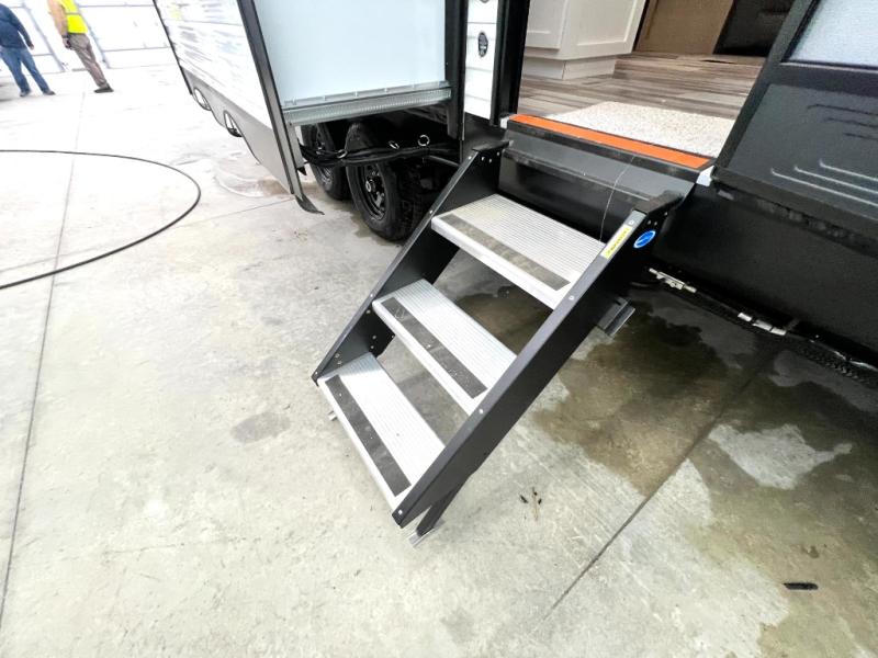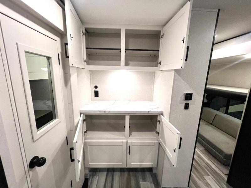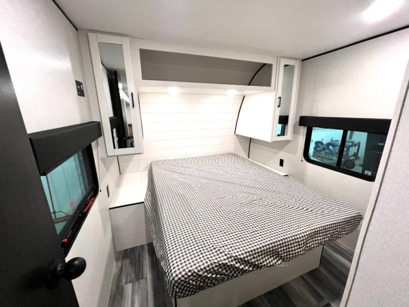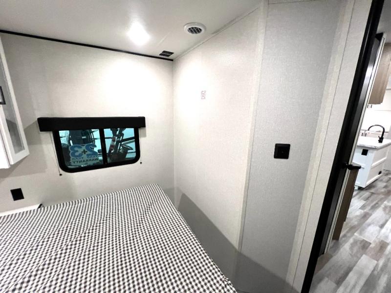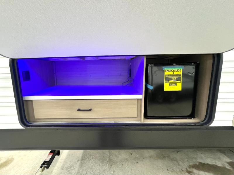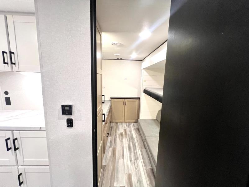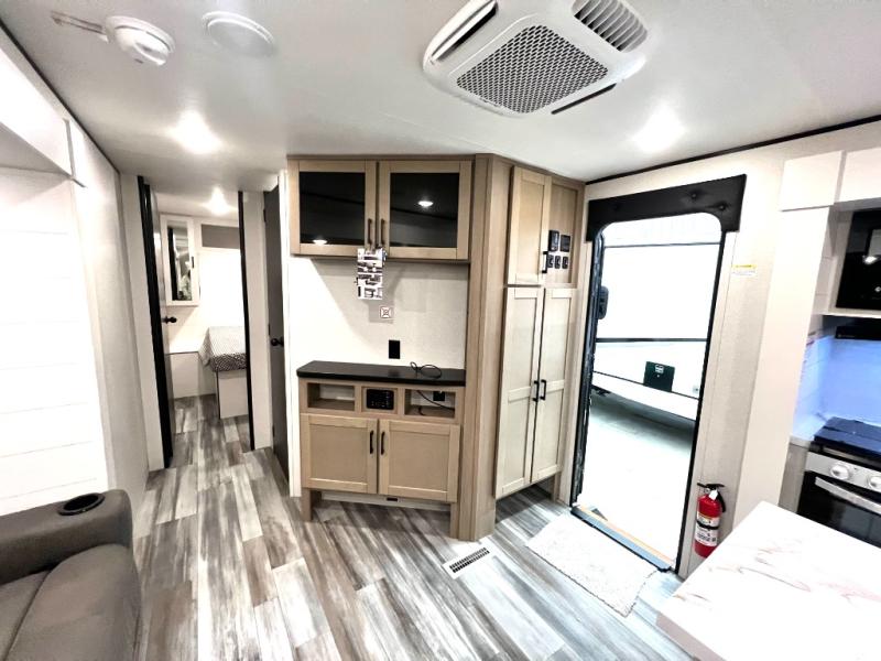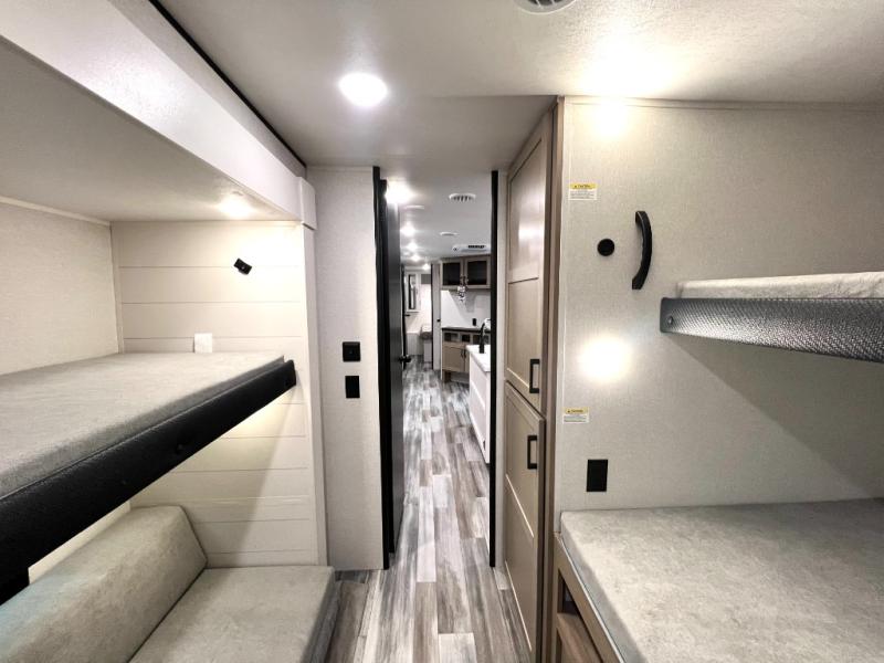 The whole gang can join along on camping trips in this triple slide out travel trailer! There is a rear private bunkhouse with a bunk bed and J-cube futon sofa below plus a second bunk bed and storage below to help keep this space tidy. You'll find your own space in the front private bedroom, which also includes a queen bed and dual wardrobes. The middle kitchen and living room will be a favorite place to come together since there is a jack-knife sofa and booth dinette, a kitchen island, plus a fully-equipped kitchen to make meals each day. There is also an exterior camp kitchen when you want fresh air!
