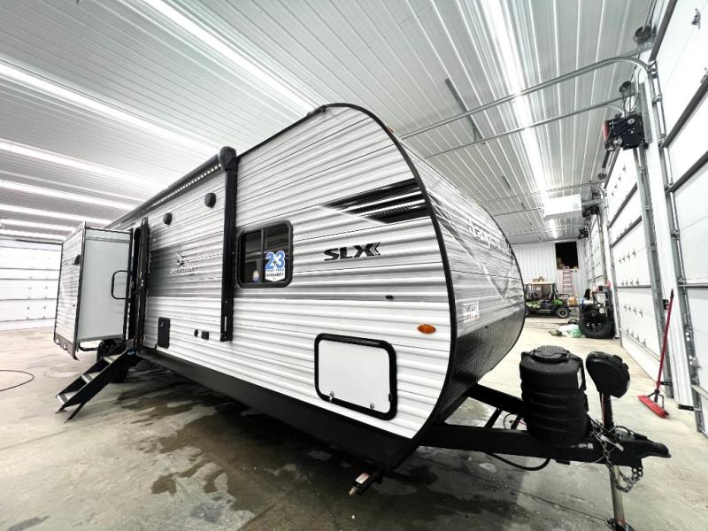 The Jayco Jay Flight SLX travel trailer is quite easy to own because it is lightweight for an easier towing experience. Built on a fully integrated A-frame with galvanized-steel, impact-resistant wheel wells, the Jay Flight SLX has quality at its very foundation. That quality continues on to the electric self-adjusting brakes, easy-lube hubs, Magnum Truss roof system, and LP quick connect. Some of what the mandatory Customer Value Package includes is backup camera prep, Keyed-Alike entry and baggage doors, and an on-demand tankless water heater.