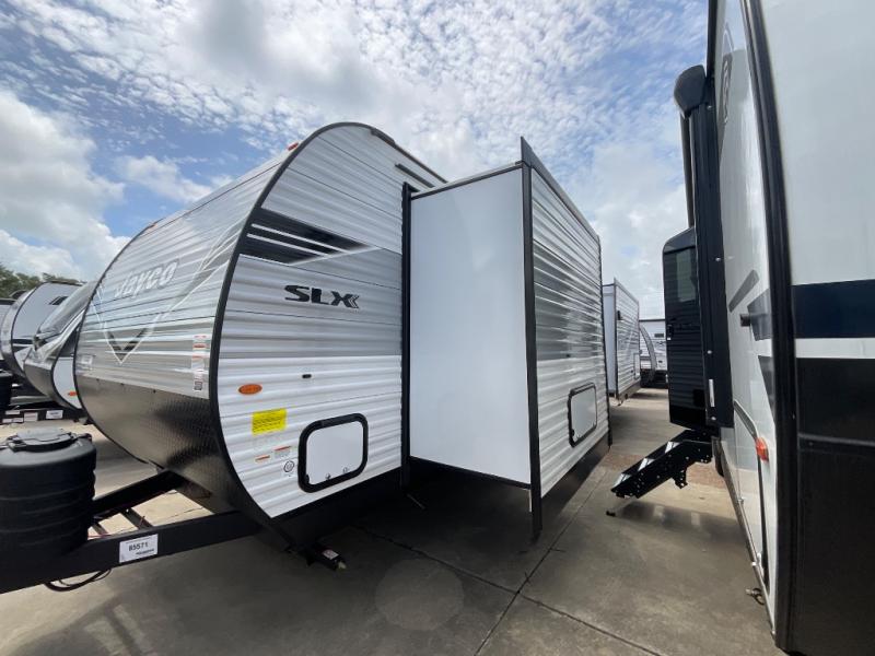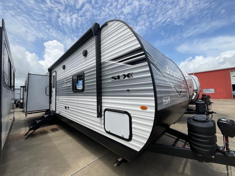 The Jayco Jay Flight SLX travel trailer is quite easy to own because it is lightweight for an easier towing experience. Built on a fully integrated A-frame with galvanized-steel, impact-resistant wheel wells, the Jay Flight SLX has quality at its very foundation. That quality continues on to the electric self-adjusting brakes, easy-lube hubs, Magnum Truss roof system, and LP quick connect. Some of what the mandatory Customer Value Package includes is backup camera prep, Keyed-Alike entry and baggage doors, and an on-demand tankless water heater.