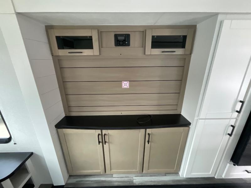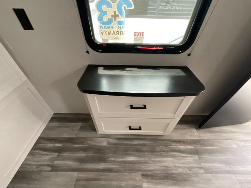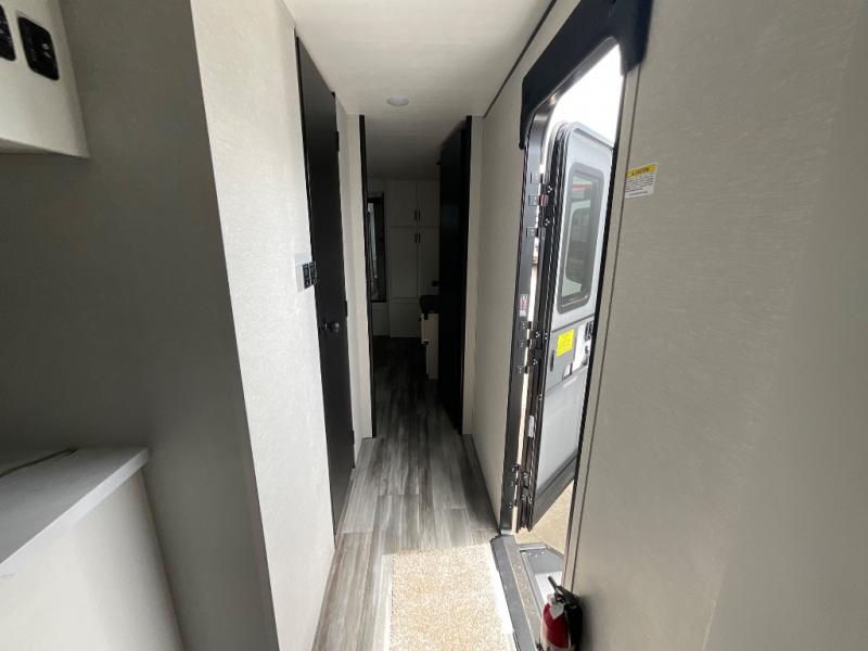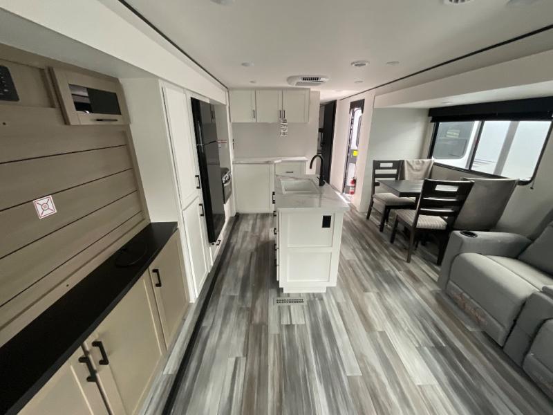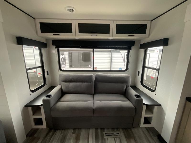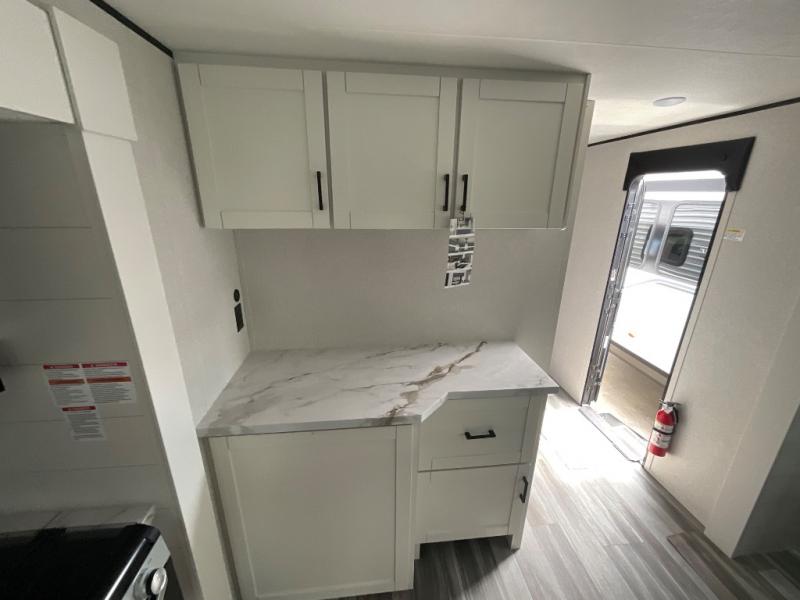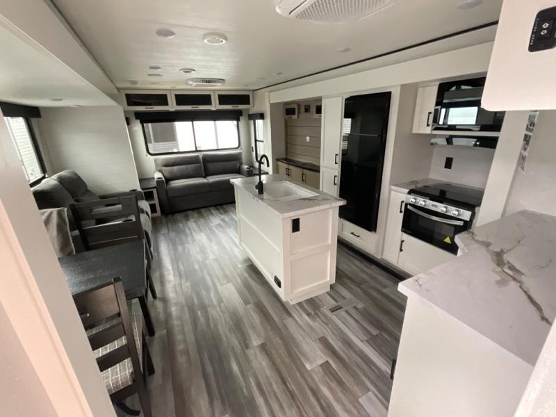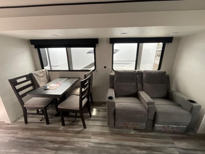 Enjoy a relaxing weekend getaway in this travel trailer! The dual entry bathroom with radius shower creates a front master suite with a queen bed slide, a dresser, and a front large wardrobe with storage space plus washer and dryer prep. The chef will have an easy time preparing their best home cooked meals with the kitchen island, hutch, three burner cooktop, and 12V refrigerator. Enjoy your meals at the booth dinette then play a card game or transform it into an extra sleeping space. The rear living area has a rear Jack-knife sofa for a quick afternoon nap and theater seating across from the entertainment center with a fireplace for the perfect spot on movie night!