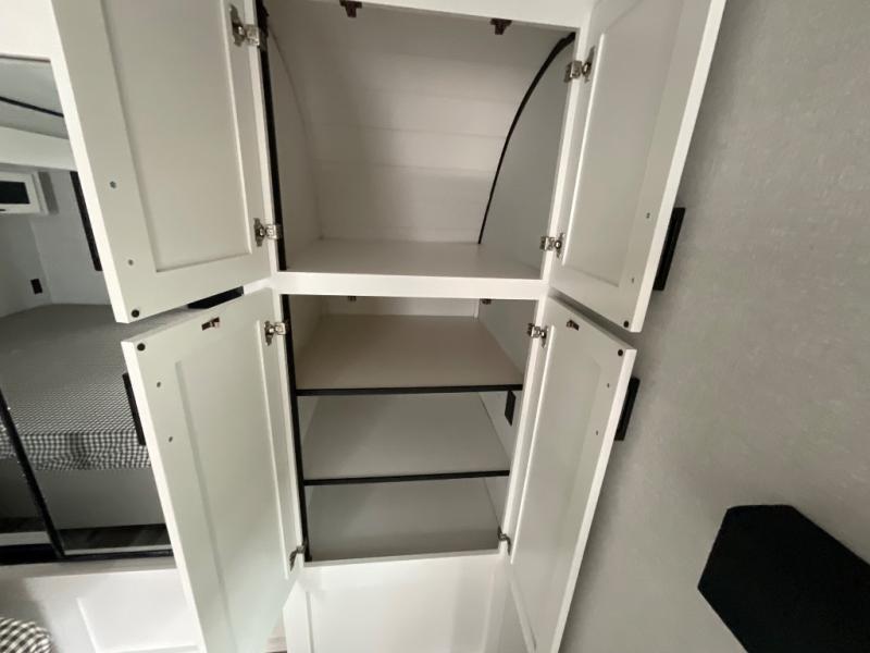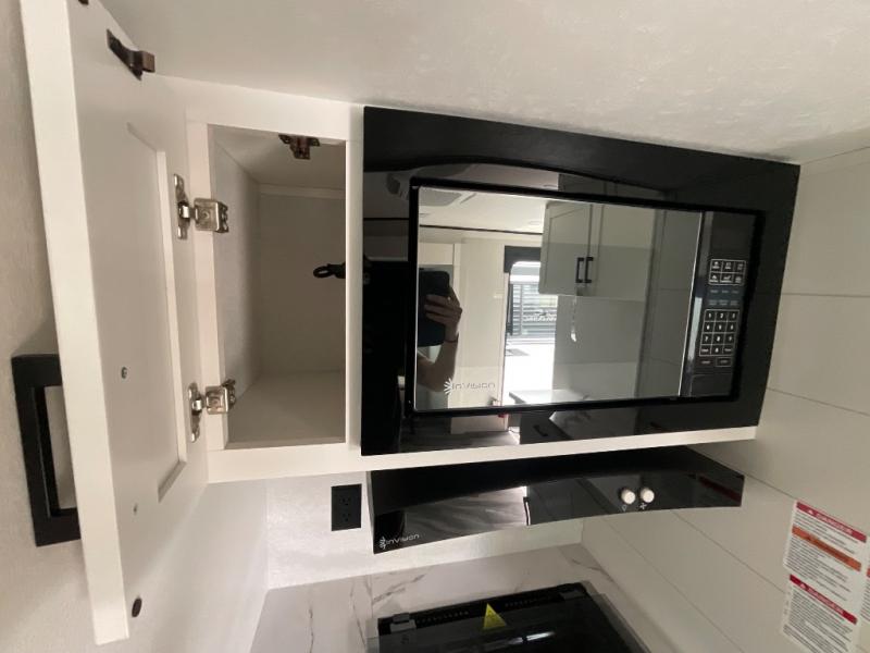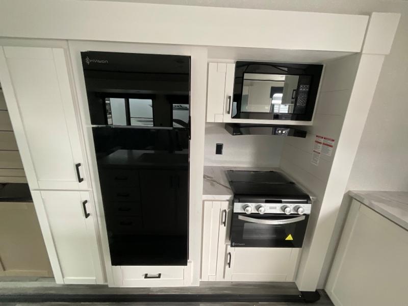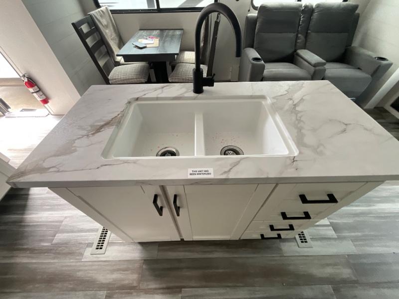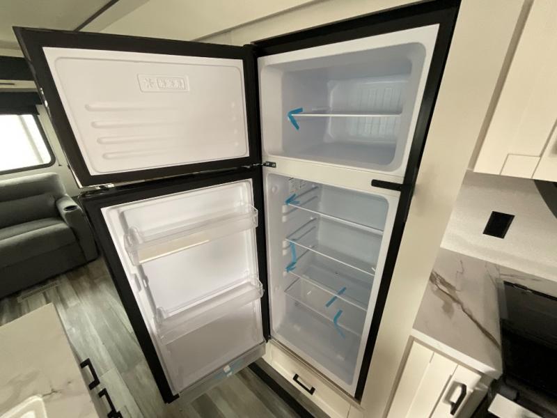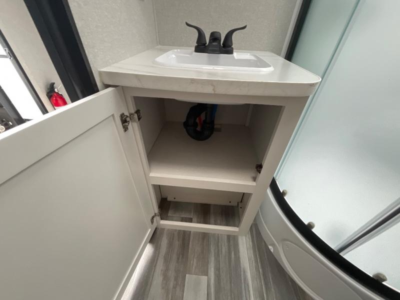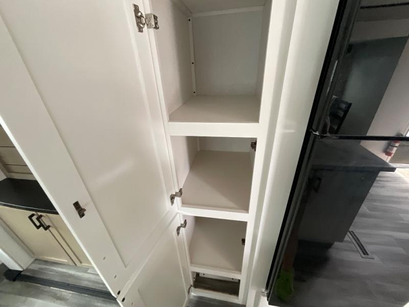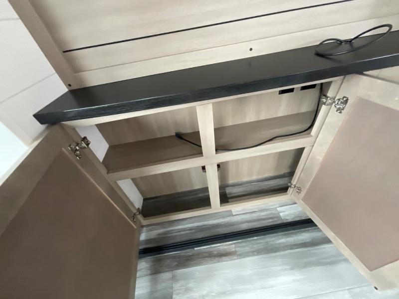 Enjoy a relaxing weekend getaway in this travel trailer! The dual entry bathroom with radius shower creates a front master suite with a queen bed slide, a dresser, and a front large wardrobe with storage space plus washer and dryer prep. The chef will have an easy time preparing their best home cooked meals with the kitchen island, hutch, three burner cooktop, and 12V refrigerator. Enjoy your meals at the booth dinette then play a card game or transform it into an extra sleeping space. The rear living area has a rear Jack-knife sofa for a quick afternoon nap and theater seating across from the entertainment center with a fireplace for the perfect spot on movie night!