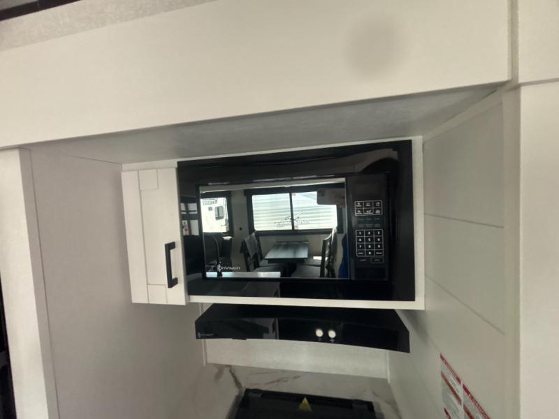 Enjoy a relaxing weekend getaway in this travel trailer! The dual entry bathroom with radius shower creates a front master suite with a queen bed slide, a dresser, and a front large wardrobe with storage space plus washer and dryer prep. The chef will have an easy time preparing their best home cooked meals with the kitchen island, hutch, three burner cooktop, and 12V refrigerator. Enjoy your meals at the booth dinette then play a card game or transform it into an extra sleeping space. The rear living area has a rear Jack-knife sofa for a quick afternoon nap and theater seating across from the entertainment center with a fireplace for the perfect spot on movie night!