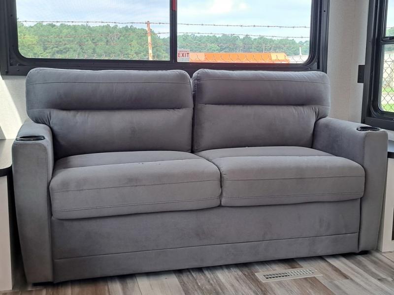 Enjoy a relaxing weekend getaway in this travel trailer! The dual entry bathroom with radius shower creates a front master suite with a queen bed slide, a dresser, and a front large wardrobe with storage space plus washer and dryer prep. The chef will have an easy time preparing their best home cooked meals with the kitchen island, hutch, three burner cooktop, and 12V refrigerator. Enjoy your meals at the booth dinette then play a card game or transform it into an extra sleeping space. The rear living area has a rear Jack-knife sofa for a quick afternoon nap and theater seating across from the entertainment center with a fireplace for the perfect spot on movie night!