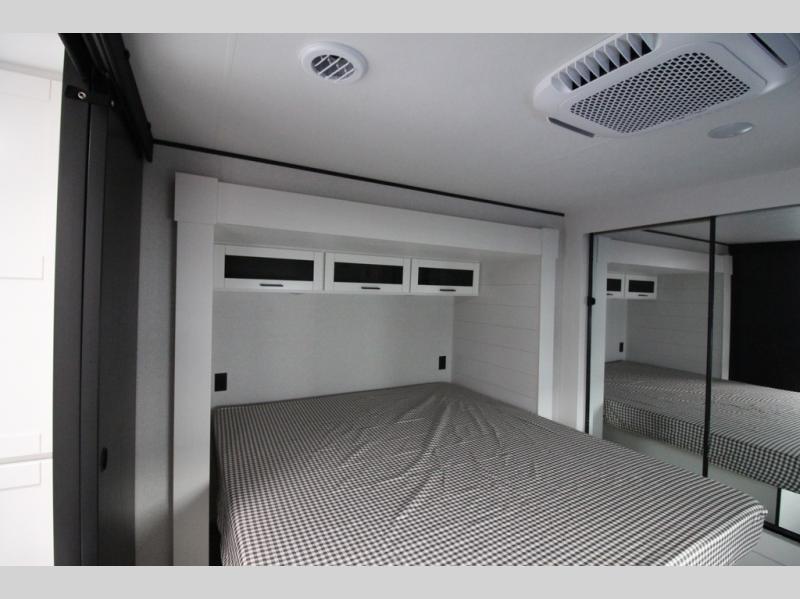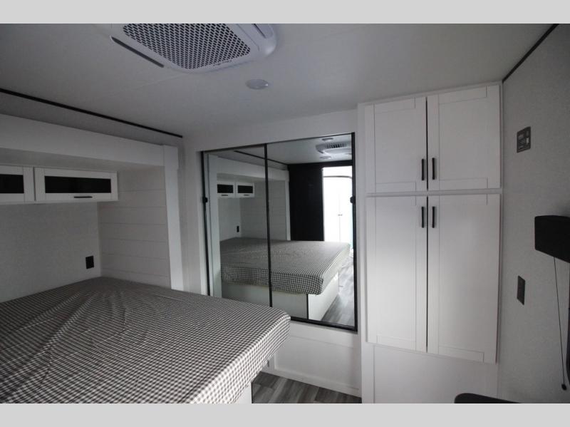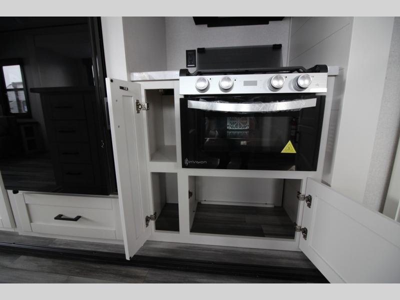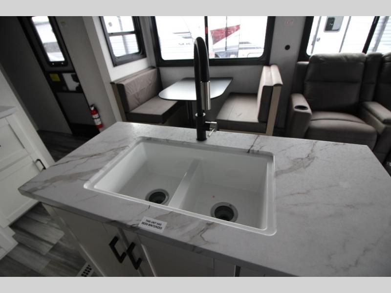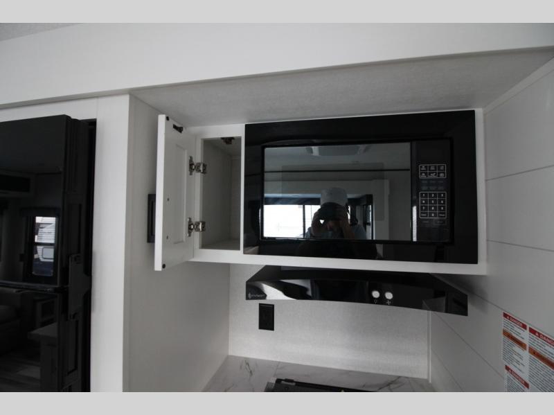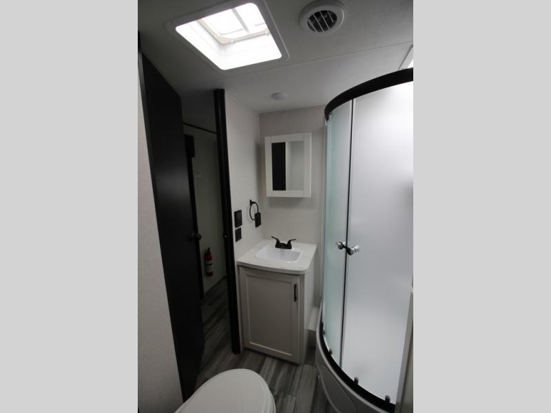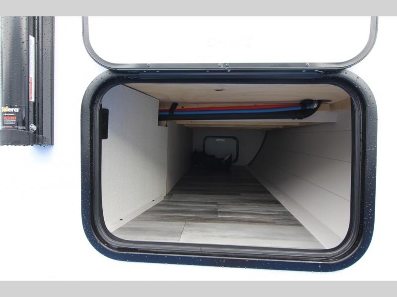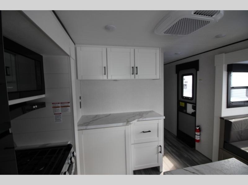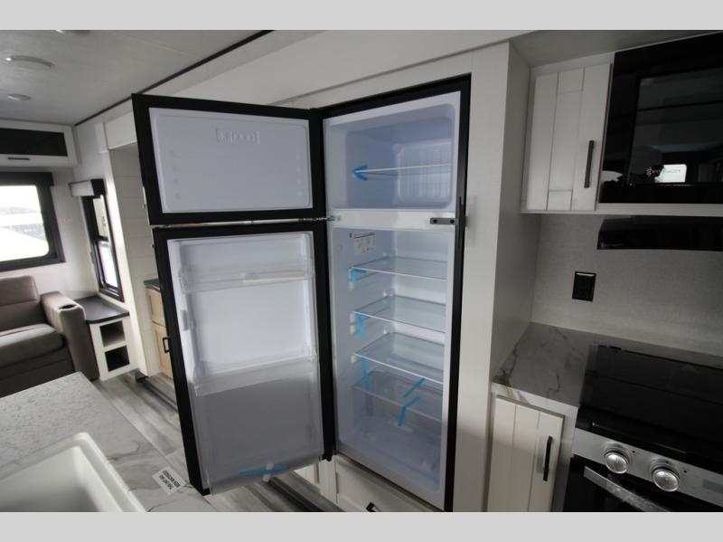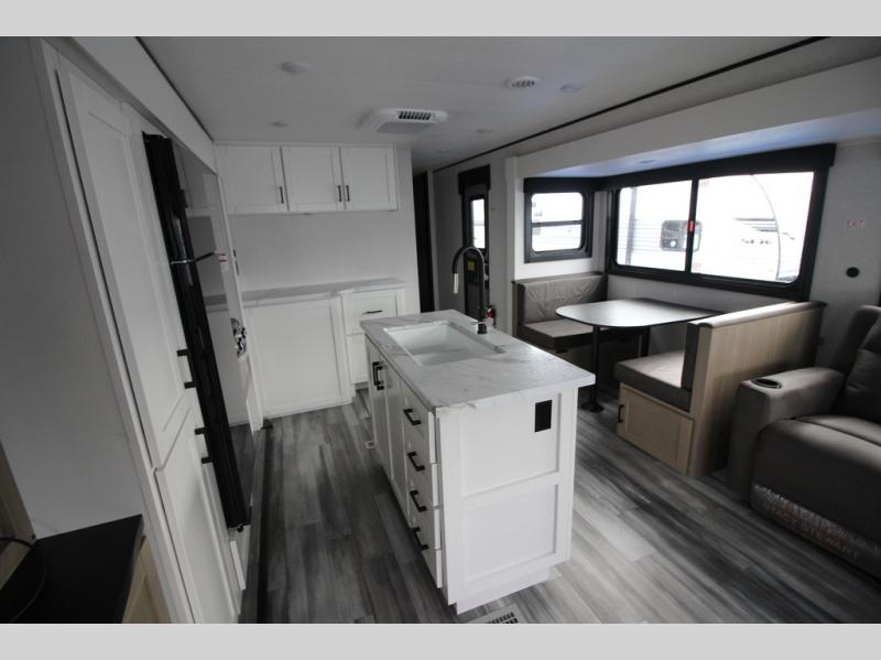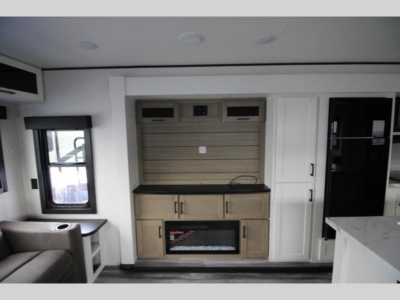 Enjoy a relaxing weekend getaway in this travel trailer! The dual entry bathroom with radius shower creates a front master suite with a queen bed slide, a dresser, and a front large wardrobe with storage space plus washer and dryer prep. The chef will have an easy time preparing their best home cooked meals with the kitchen island, hutch, three burner cooktop, and 12V refrigerator. Enjoy your meals at the booth dinette then play a card game or transform it into an extra sleeping space. The rear living area has a rear Jack-knife sofa for a quick afternoon nap and theater seating across from the entertainment center with a fireplace for the perfect spot on movie night!