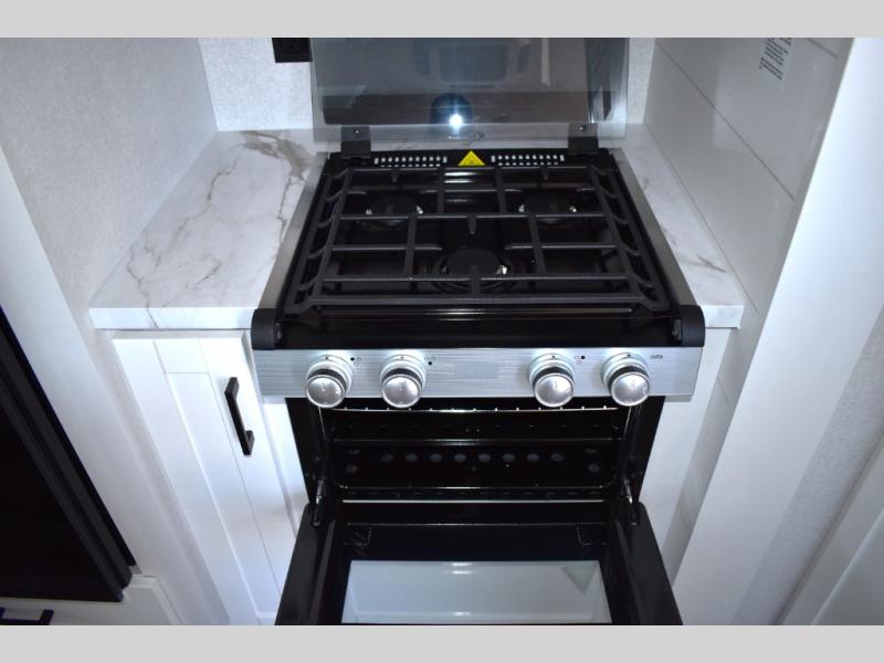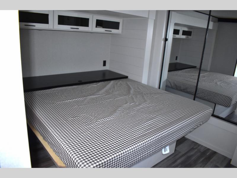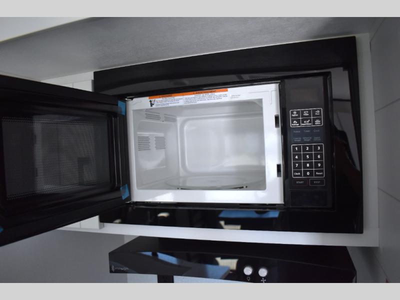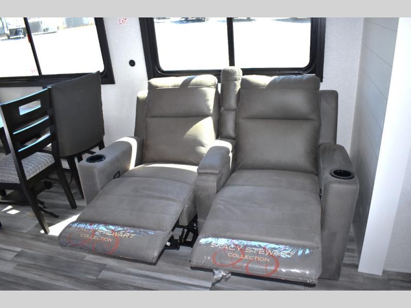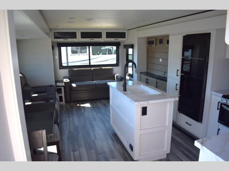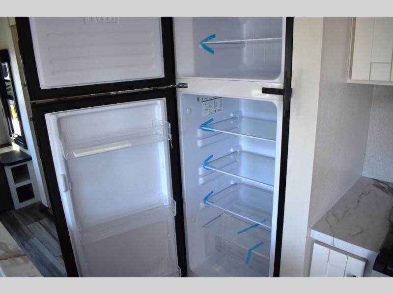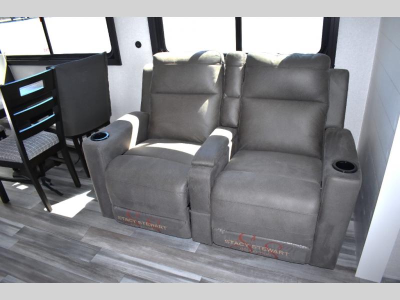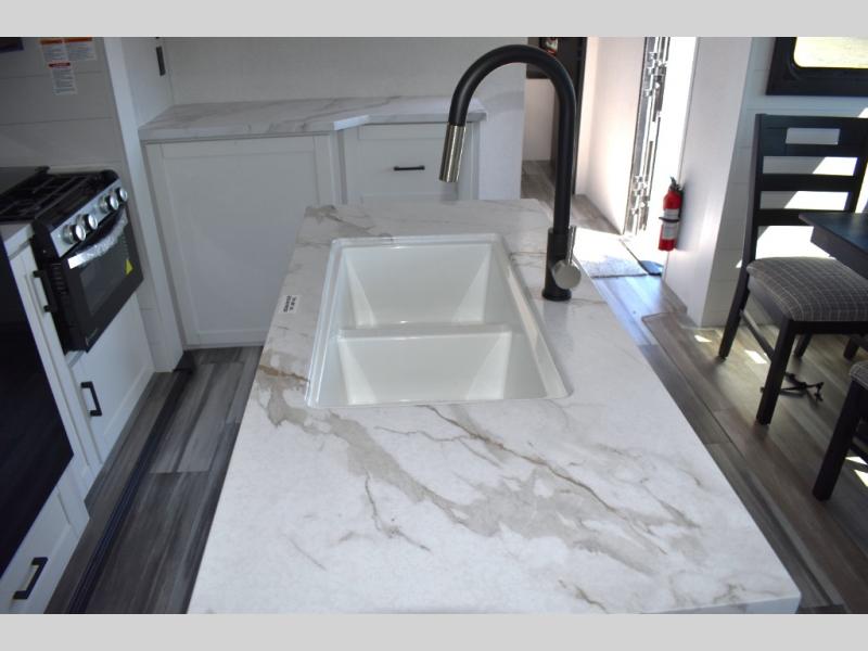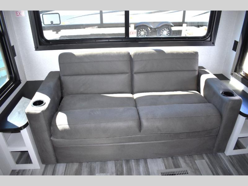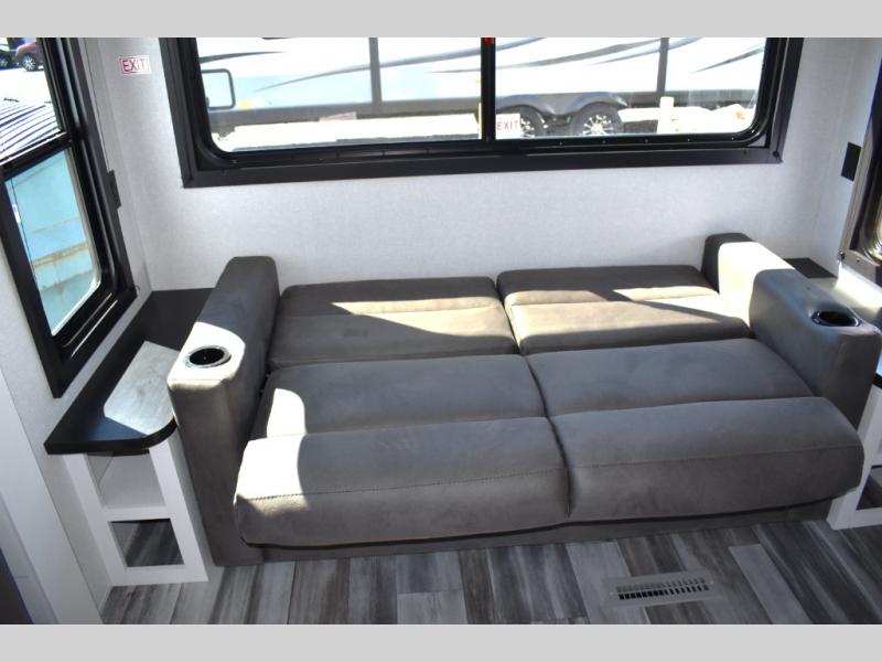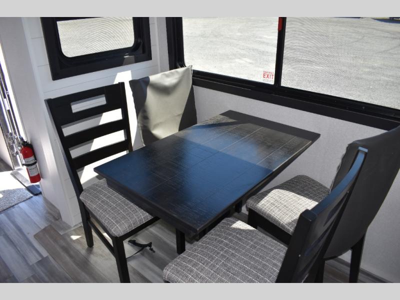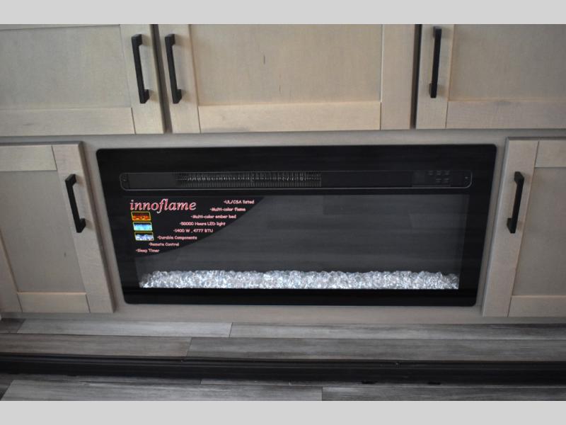 Enjoy a relaxing weekend getaway in this travel trailer! The dual entry bathroom with radius shower creates a front master suite with a queen bed slide, a dresser, and a front large wardrobe with storage space plus washer and dryer prep. The chef will have an easy time preparing their best home cooked meals with the kitchen island, hutch, three burner cooktop, and 12V refrigerator. Enjoy your meals at the booth dinette then play a card game or transform it into an extra sleeping space. The rear living area has a rear Jack-knife sofa for a quick afternoon nap and theater seating across from the entertainment center with a fireplace for the perfect spot on movie night!