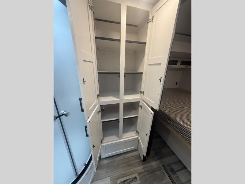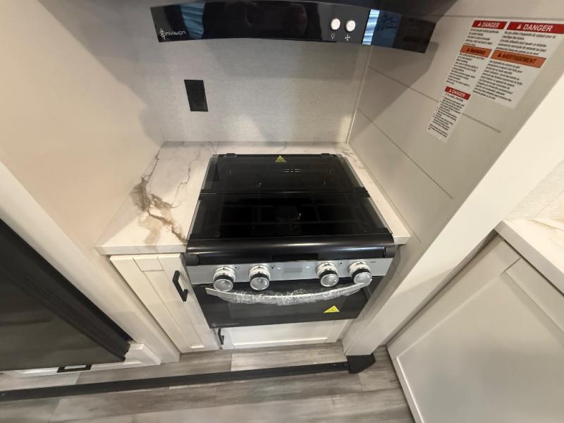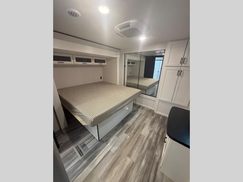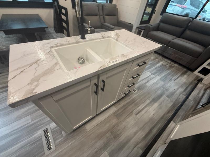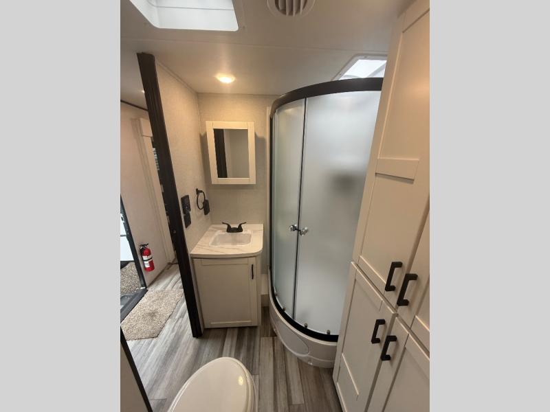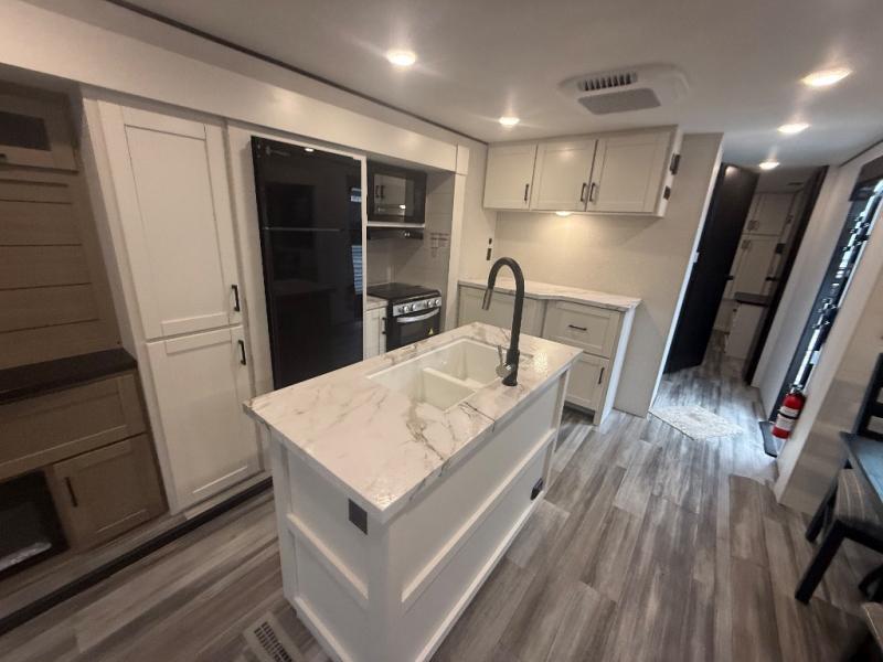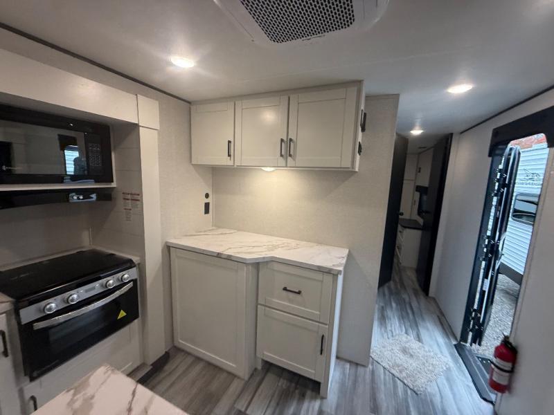 Enjoy a relaxing weekend getaway in this travel trailer! The dual entry bathroom with radius shower creates a front master suite with a queen bed slide, a dresser, and a front large wardrobe with storage space plus washer and dryer prep. The chef will have an easy time preparing their best home cooked meals with the kitchen island, hutch, three burner cooktop, and 12V refrigerator. Enjoy your meals at the booth dinette then play a card game or transform it into an extra sleeping space. The rear living area has a rear Jack-knife sofa for a quick afternoon nap and theater seating across from the entertainment center with a fireplace for the perfect spot on movie night!