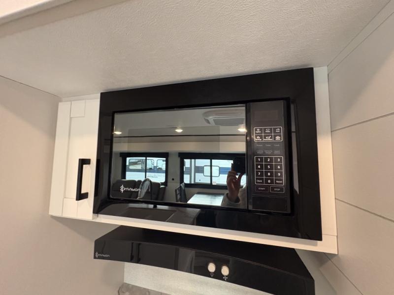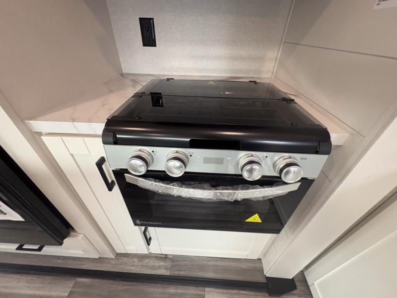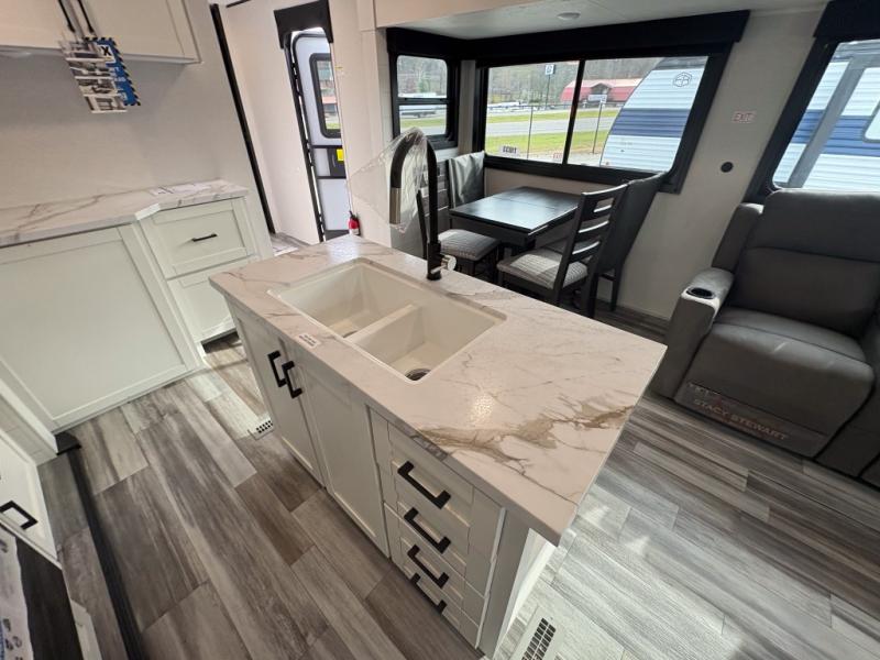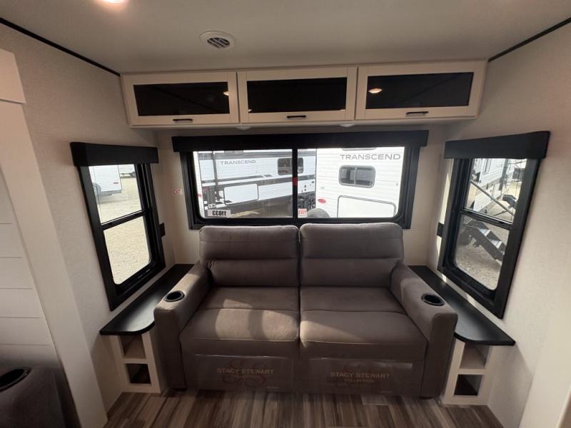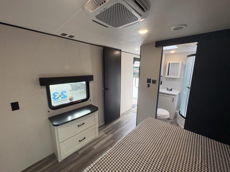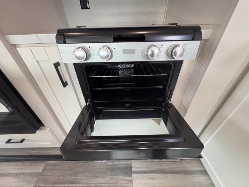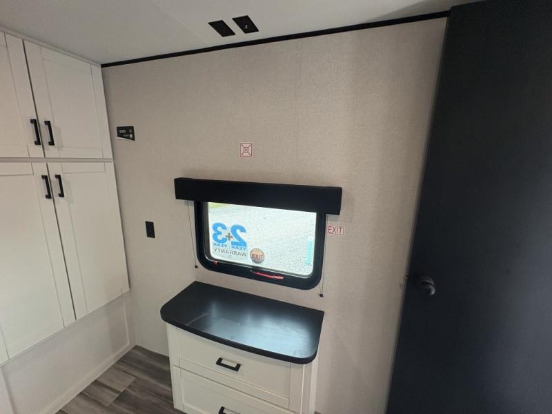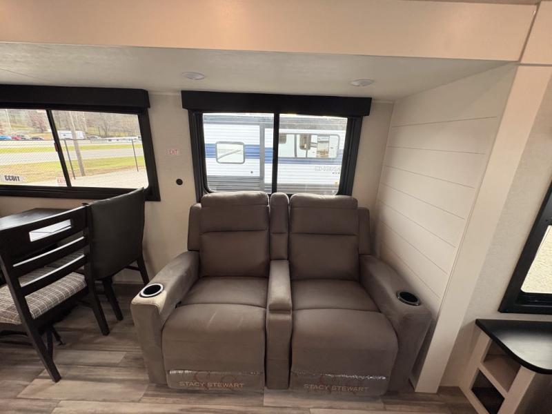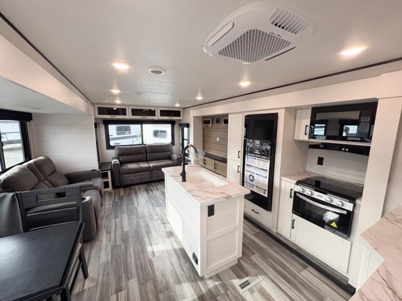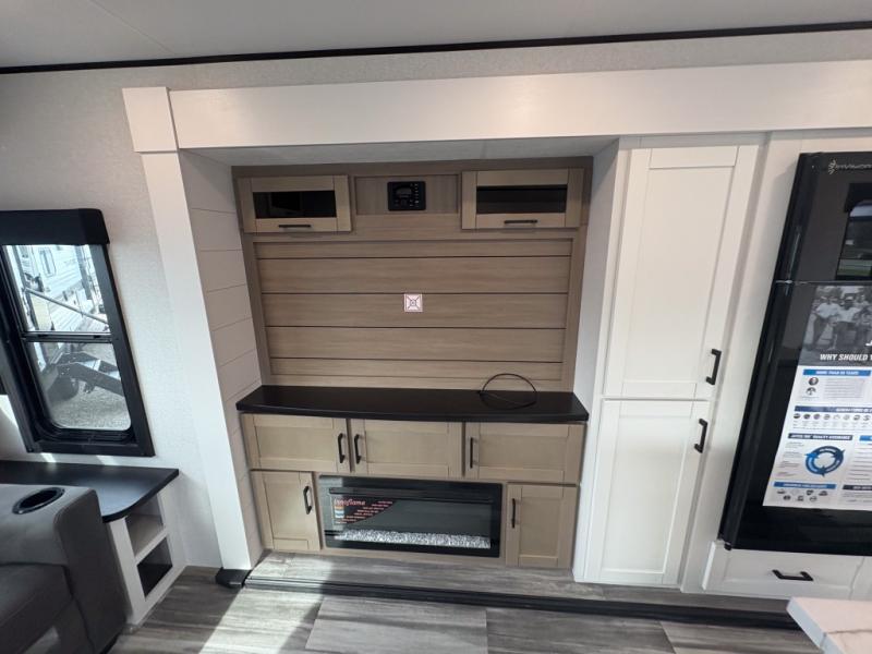 Enjoy a relaxing weekend getaway in this travel trailer! The dual entry bathroom with radius shower creates a front master suite with a queen bed slide, a dresser, and a front large wardrobe with storage space plus washer and dryer prep. The chef will have an easy time preparing their best home cooked meals with the kitchen island, hutch, three burner cooktop, and 12V refrigerator. Enjoy your meals at the booth dinette then play a card game or transform it into an extra sleeping space. The rear living area has a rear Jack-knife sofa for a quick afternoon nap and theater seating across from the entertainment center with a fireplace for the perfect spot on movie night!