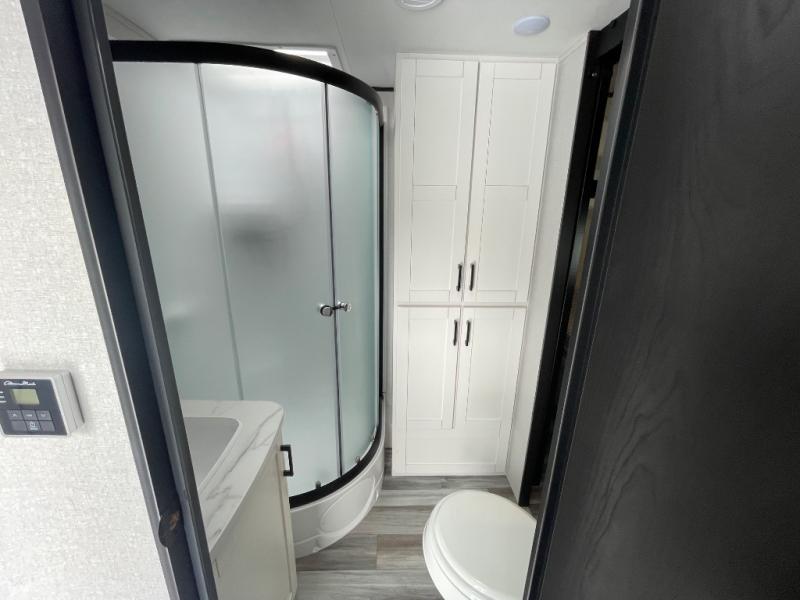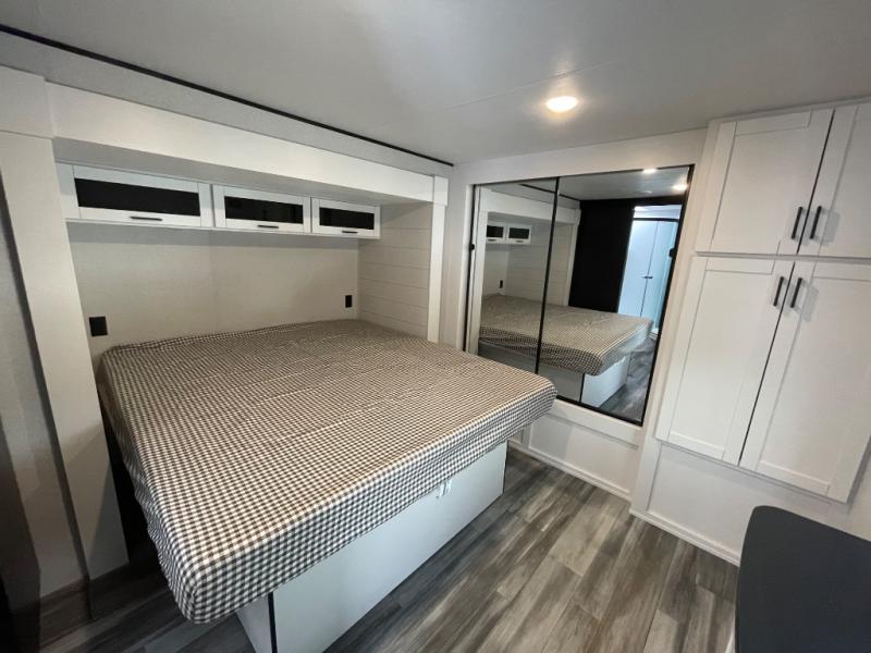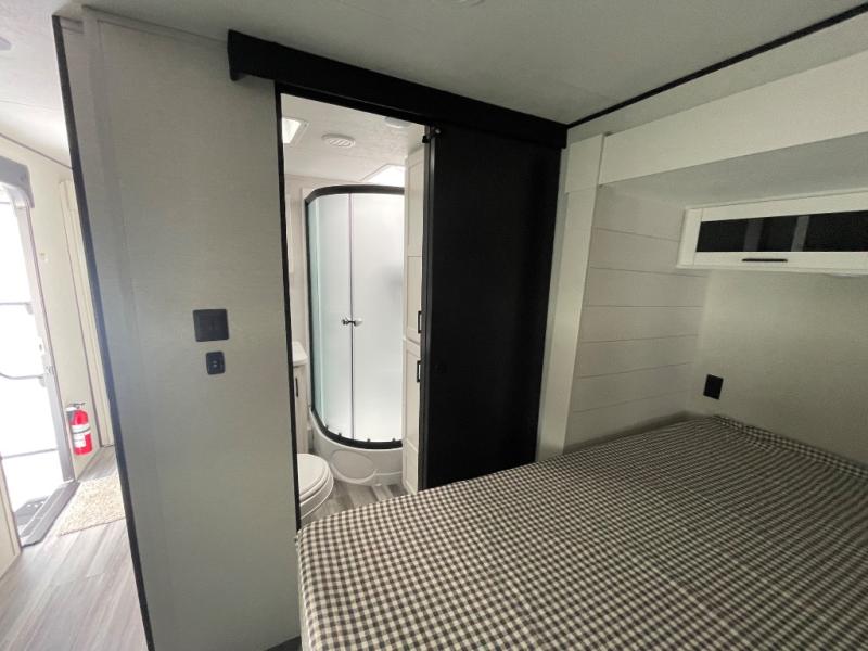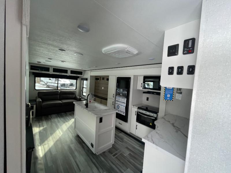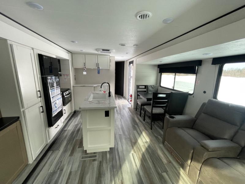 Enjoy a relaxing weekend getaway in this travel trailer! The dual entry bathroom with radius shower creates a front master suite with a queen bed slide, a dresser, and a front large wardrobe with storage space plus washer and dryer prep. The chef will have an easy time preparing their best home cooked meals with the kitchen island, hutch, three burner cooktop, and 12V refrigerator. Enjoy your meals at the booth dinette then play a card game or transform it into an extra sleeping space. The rear living area has a rear Jack-knife sofa for a quick afternoon nap and theater seating across from the entertainment center with a fireplace for the perfect spot on movie night!