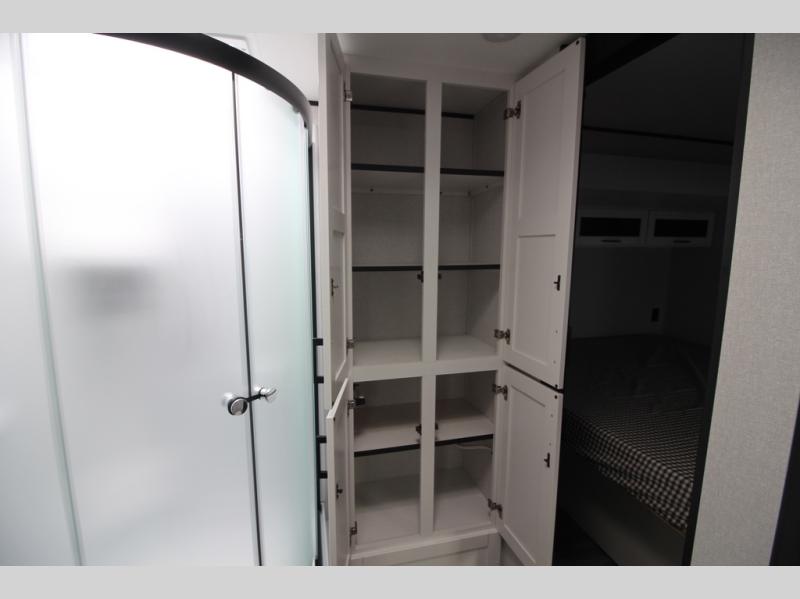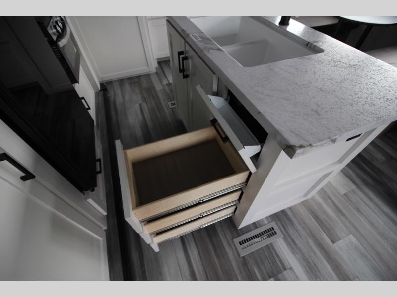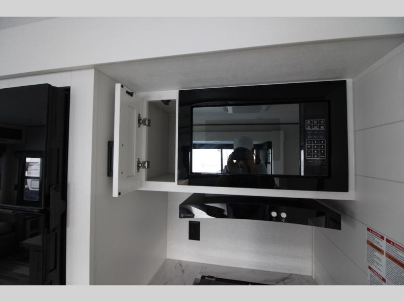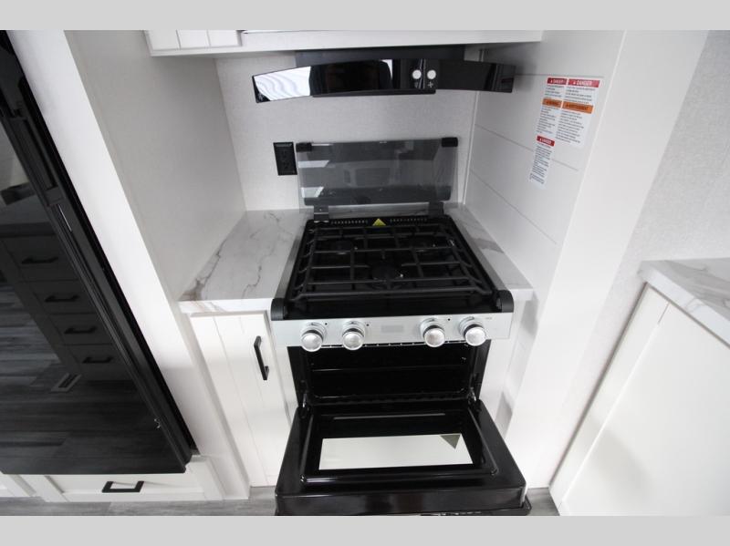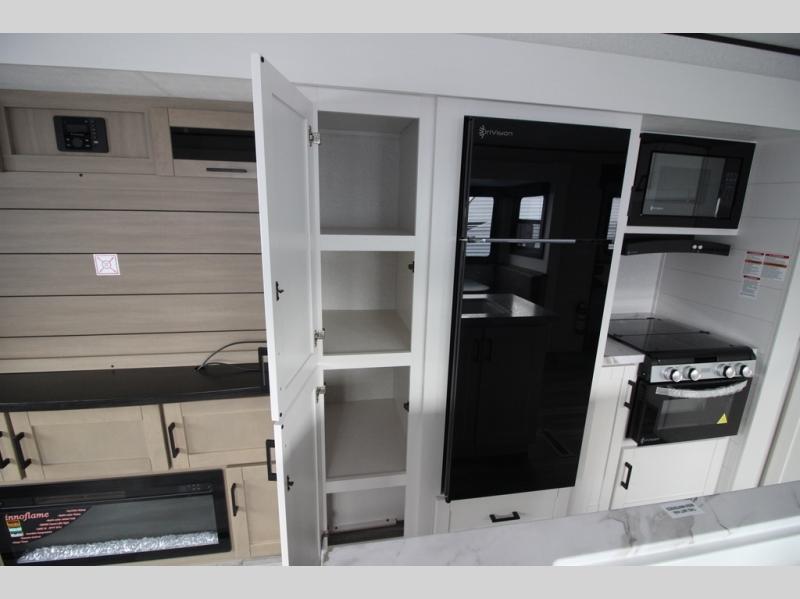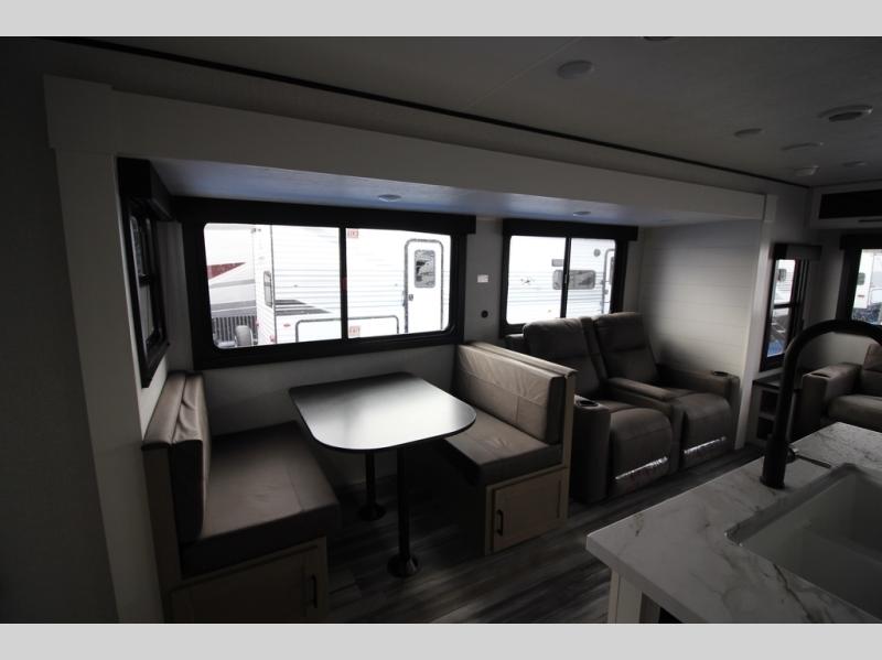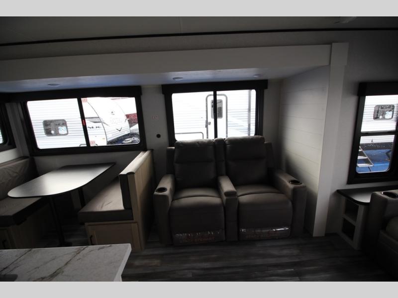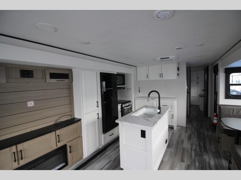 Enjoy a relaxing weekend getaway in this travel trailer! The dual entry bathroom with radius shower creates a front master suite with a queen bed slide, a dresser, and a front large wardrobe with storage space plus washer and dryer prep. The chef will have an easy time preparing their best home cooked meals with the kitchen island, hutch, three burner cooktop, and 12V refrigerator. Enjoy your meals at the booth dinette then play a card game or transform it into an extra sleeping space. The rear living area has a rear Jack-knife sofa for a quick afternoon nap and theater seating across from the entertainment center with a fireplace for the perfect spot on movie night!