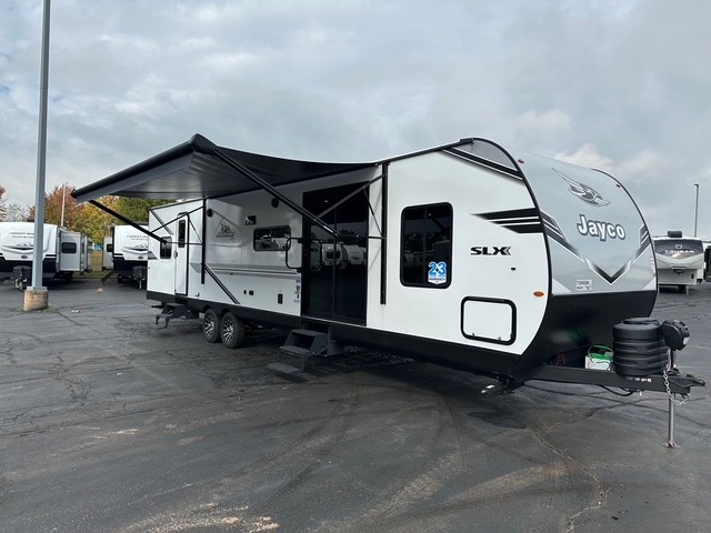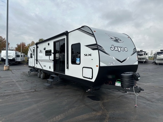 The Jayco Jay Flight SLX travel trailer is quite easy to own because it is lightweight for an easier towing experience. Built on a fully integrated A-frame with galvanized-steel, impact-resistant wheel wells, the Jay Flight SLX has quality at its very foundation. That quality continues on to the electric self-adjusting brakes, easy-lube hubs, Magnum Truss roof system, and LP quick connect. Some of what the mandatory Customer Value Package includes is backup camera prep, Keyed-Alike entry and baggage doors, marine grade exterior speakers, and an on-demand tankless water heater.