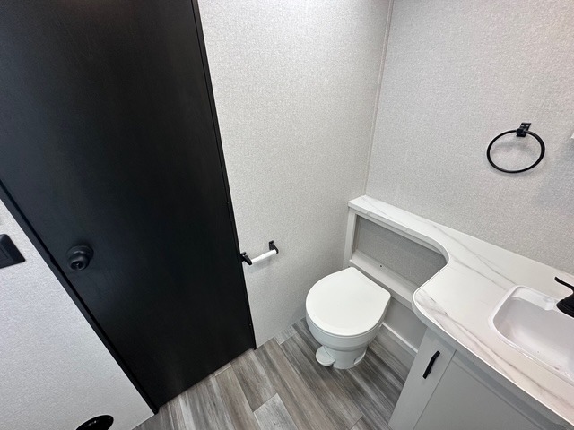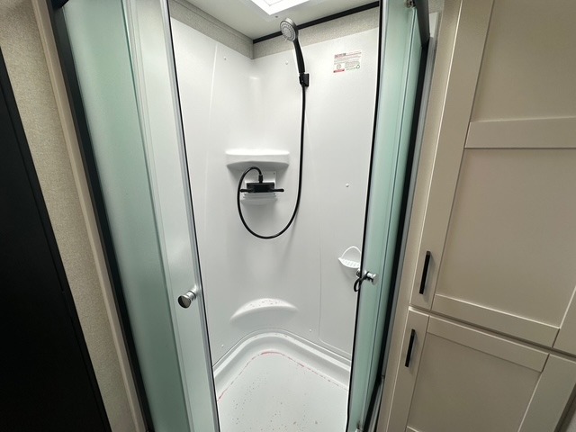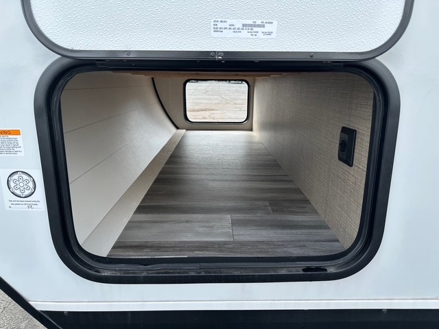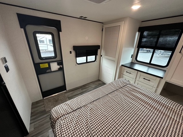 With two private bedrooms, everyone will have a comfortable place to sleep in this travel trailer! The front private bedroom has a 60" x 75" queen bed with wardrobes on either side and the rear private bedroom has a 60" x 80" queen bed slide with a dresser, a wardrobe, one of the exit/entrance doors, and an entrance into the walk-through bathroom which has a radius shower for everyone to stay squeaky clean. The patio doors not only make it easy to enter and exit the unit, but also bring in tons of natural lighting. After you have prepared a delicious home cooked meal, you can can head to the U-shaped dinette to enjoy it there comfortably then relax on the Jack-knife sofa across from the entertainment center!