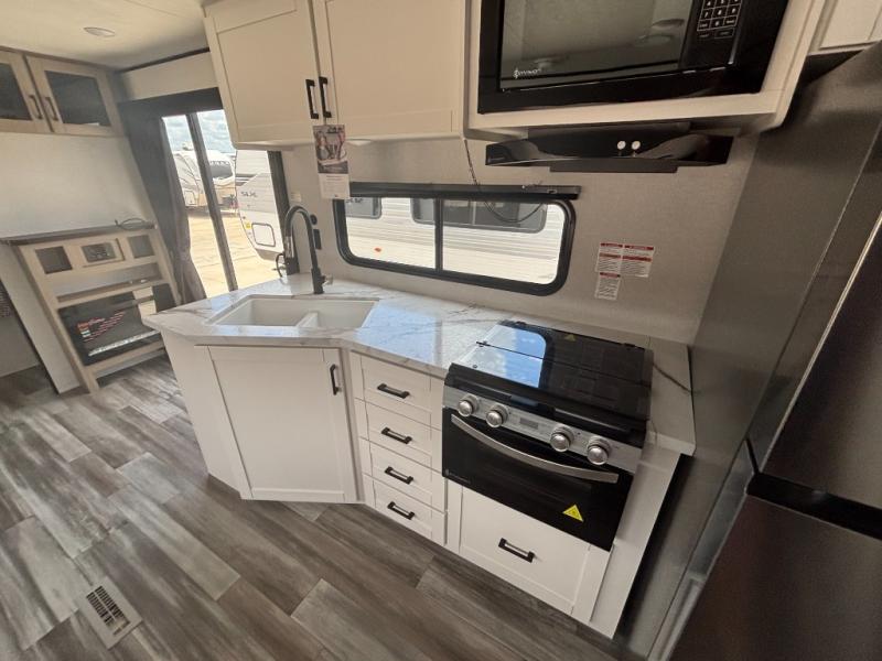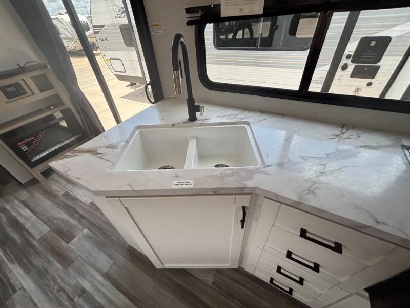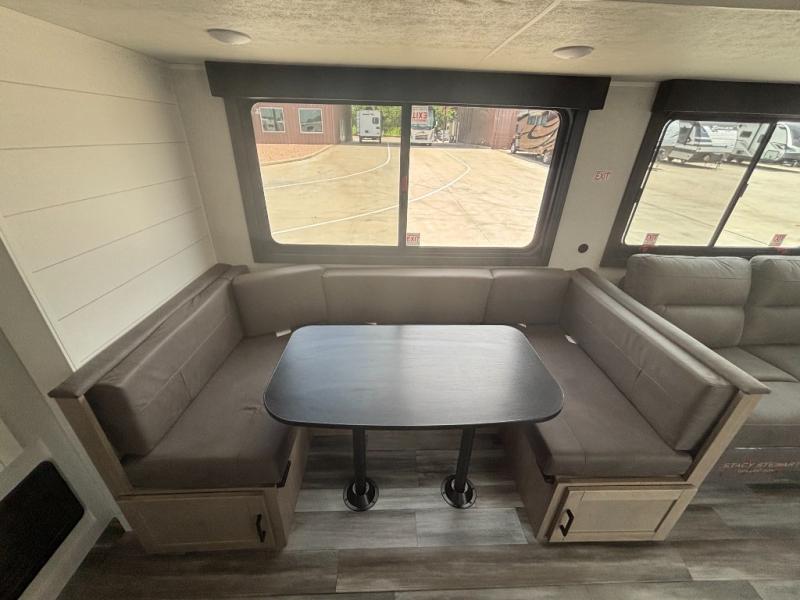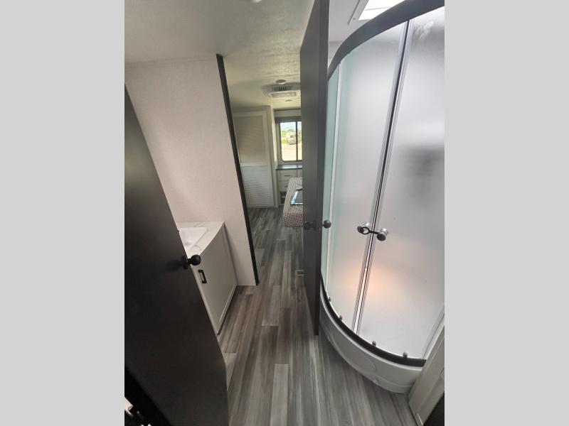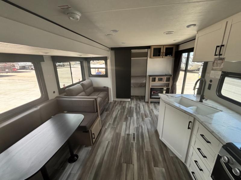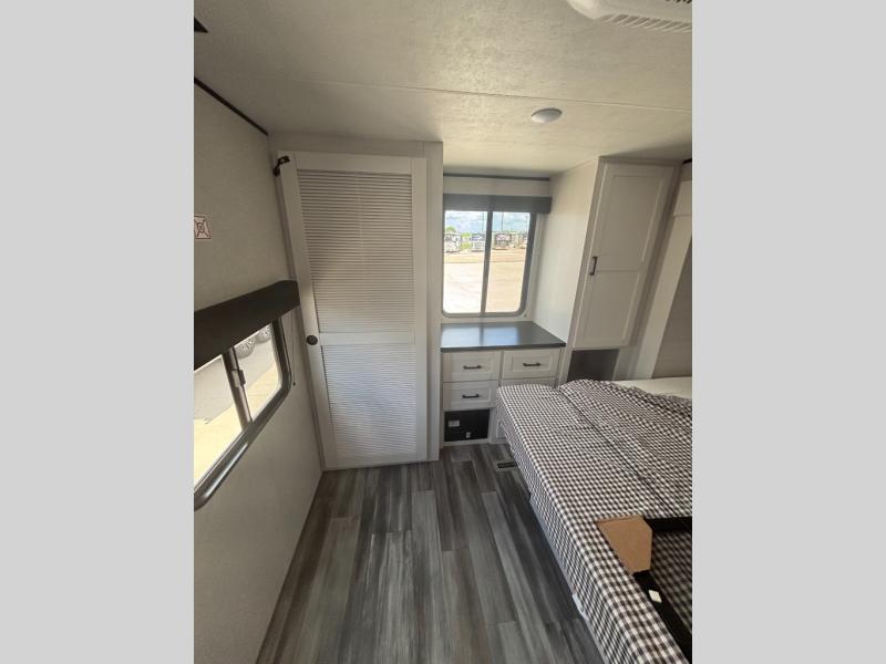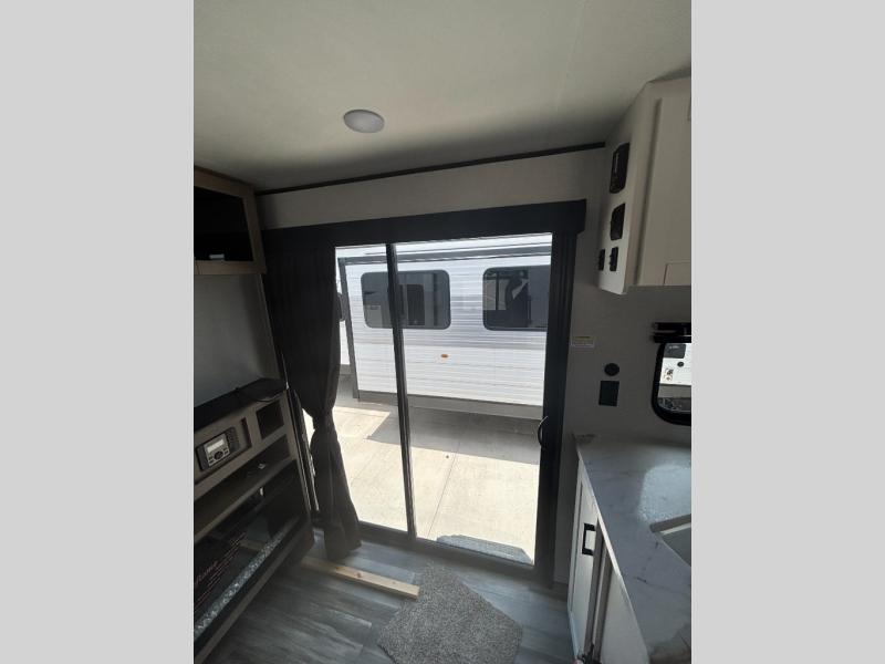 With two private bedrooms, everyone will have a comfortable place to sleep in this travel trailer! The front private bedroom has a 60" x 75" queen bed with wardrobes on either side and the rear private bedroom has a 60" x 80" queen bed slide with a dresser, a wardrobe, one of the exit/entrance doors, and an entrance into the walk-through bathroom which has a radius shower for everyone to stay squeaky clean. The patio doors not only make it easy to enter and exit the unit, but also bring in tons of natural lighting. After you have prepared a delicious home cooked meal, you can can head to the U-shaped dinette to enjoy it there comfortably then relax on the Jack-knife sofa across from the entertainment center!