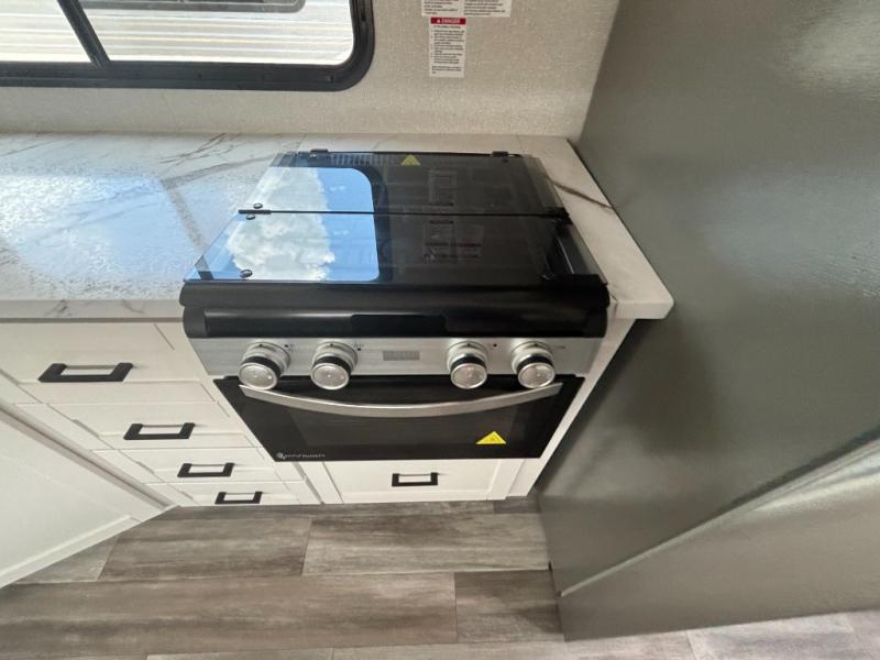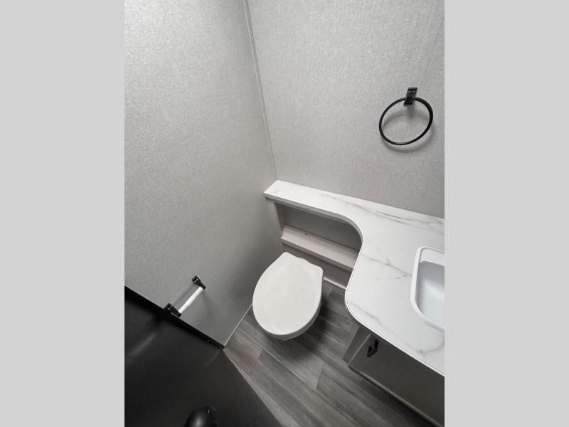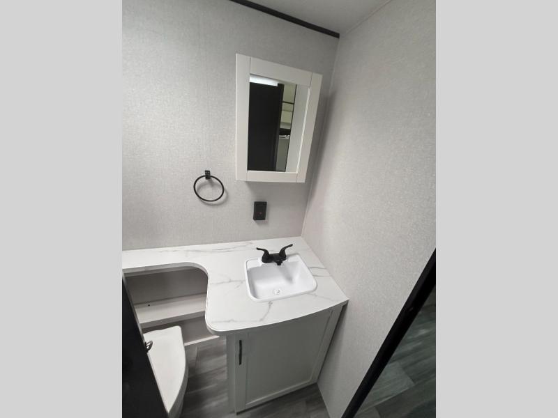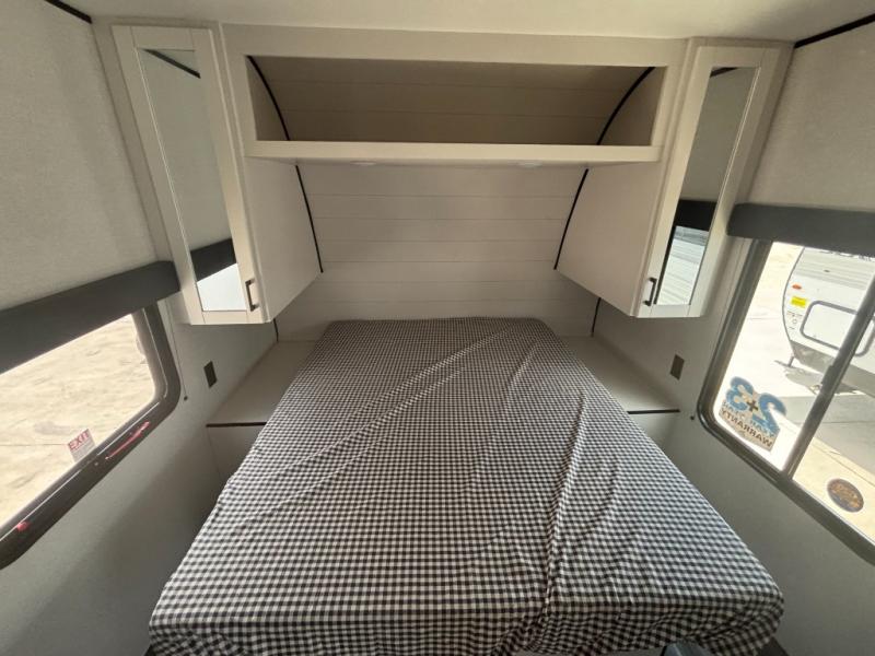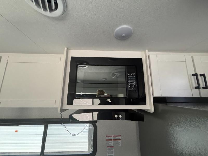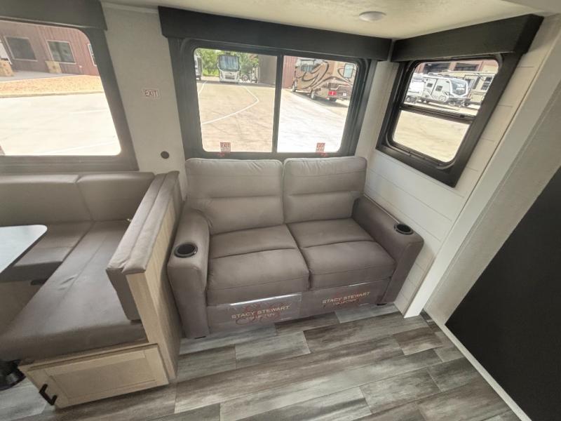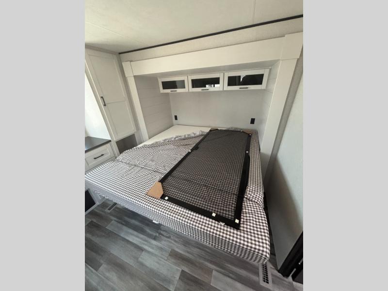 With two private bedrooms, everyone will have a comfortable place to sleep in this travel trailer! The front private bedroom has a 60" x 75" queen bed with wardrobes on either side and the rear private bedroom has a 60" x 80" queen bed slide with a dresser, a wardrobe, one of the exit/entrance doors, and an entrance into the walk-through bathroom which has a radius shower for everyone to stay squeaky clean. The patio doors not only make it easy to enter and exit the unit, but also bring in tons of natural lighting. After you have prepared a delicious home cooked meal, you can can head to the U-shaped dinette to enjoy it there comfortably then relax on the Jack-knife sofa across from the entertainment center!