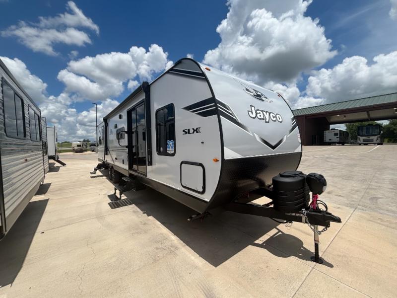 The Jayco Jay Flight SLX travel trailer is quite easy to own because it is lightweight for an easier towing experience. Built on a fully integrated A-frame with galvanized-steel, impact-resistant wheel wells, the Jay Flight SLX has quality at its very foundation. That quality continues on to the electric self-adjusting brakes, easy-lube hubs, Magnum Truss roof system, and LP quick connect. Some of what the mandatory Customer Value Package includes is backup camera prep, Keyed-Alike entry and baggage doors, and an on-demand tankless water heater.