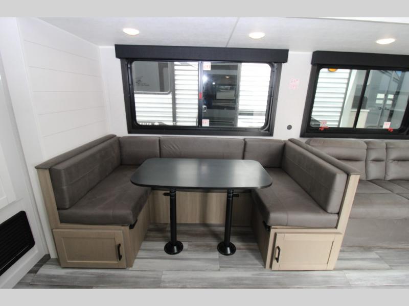 With two private bedrooms, everyone will have a comfortable place to sleep in this travel trailer! The front private bedroom has a 60" x 75" queen bed with wardrobes on either side and the rear private bedroom has a 60" x 80" queen bed slide with a dresser, a wardrobe, one of the exit/entrance doors, and an entrance into the walk-through bathroom which has a radius shower for everyone to stay squeaky clean. The patio doors not only make it easy to enter and exit the unit, but also bring in tons of natural lighting. After you have prepared a delicious home cooked meal, you can can head to the U-shaped dinette to enjoy it there comfortably then relax on the Jack-knife sofa across from the entertainment center!