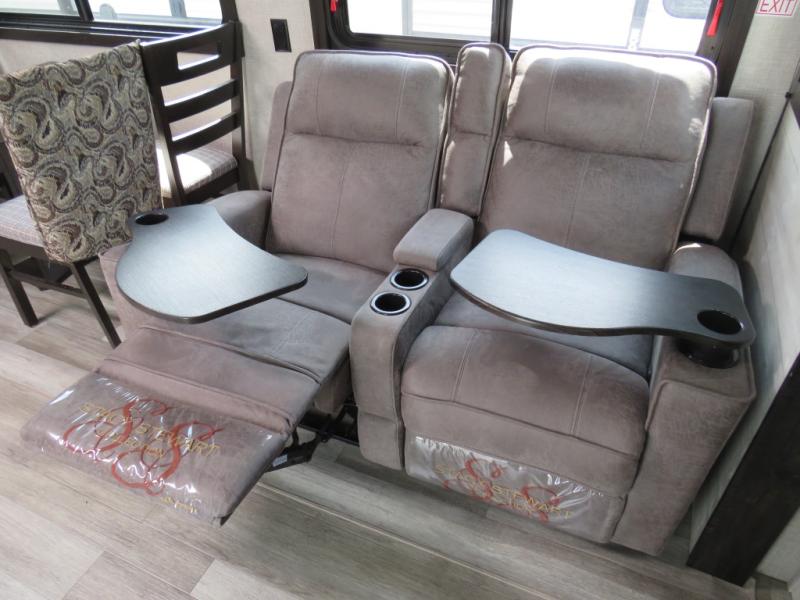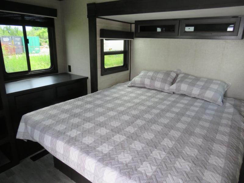 With two private bedrooms, everyone will have a comfortable place to sleep in this travel trailer! The front private bedroom has a 60" x 75" queen bed with wardrobes on either side and the rear private bedroom has a 60" x 80" queen bed slide with a dresser, a wardrobe, one of the exit/entrance doors, and an entrance into the walk-through bathroom which has a radius shower for everyone to stay squeaky clean. The patio doors not only make it easy to enter and exit the unit, but also bring in tons of natural lighting. After you have prepared a delicious home cooked meal, you can can head to the U-shaped dinette to enjoy it there comfortably then relax on the Jack-knife sofa across from the entertainment center!
