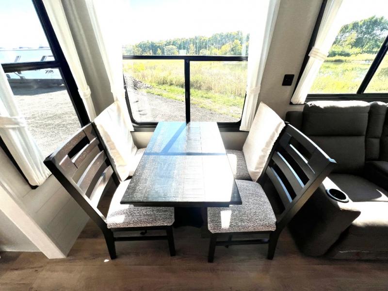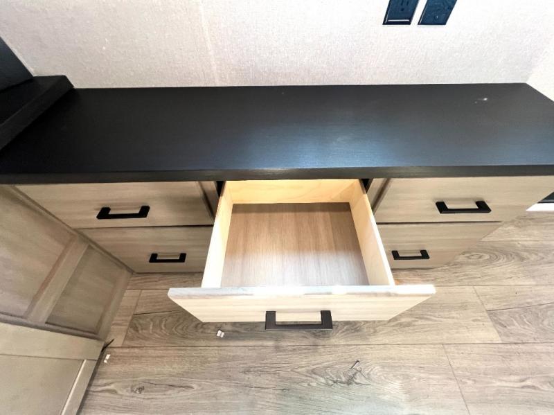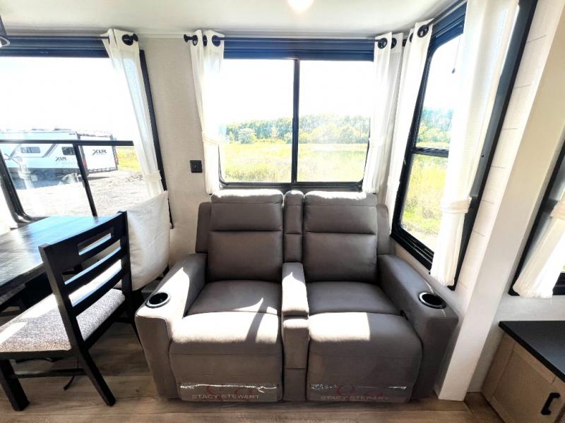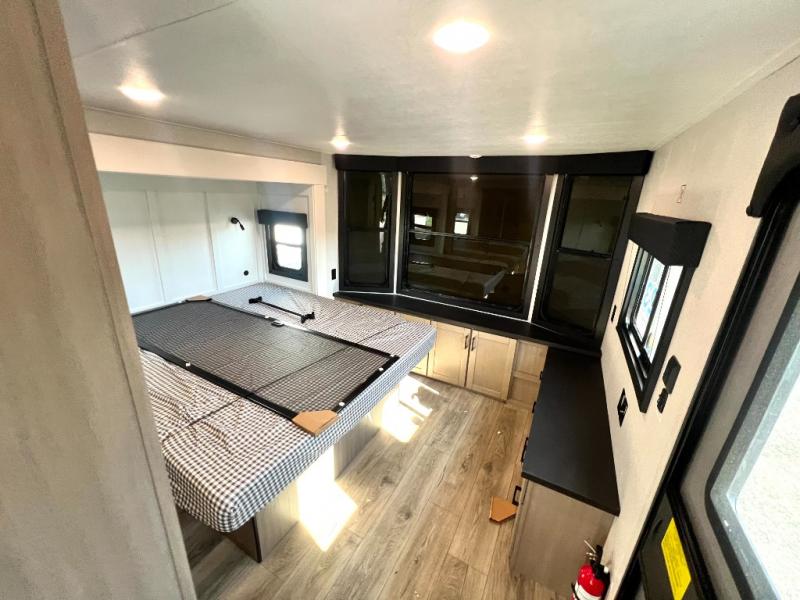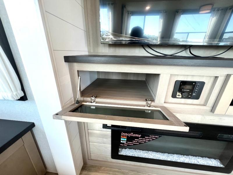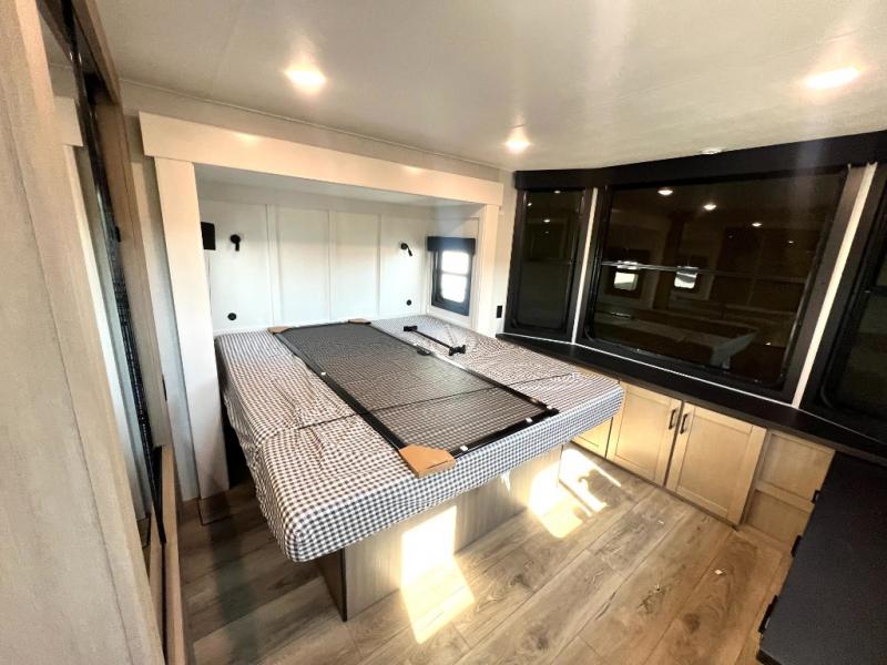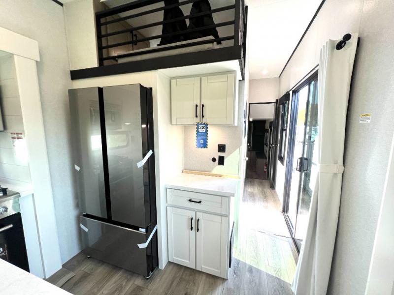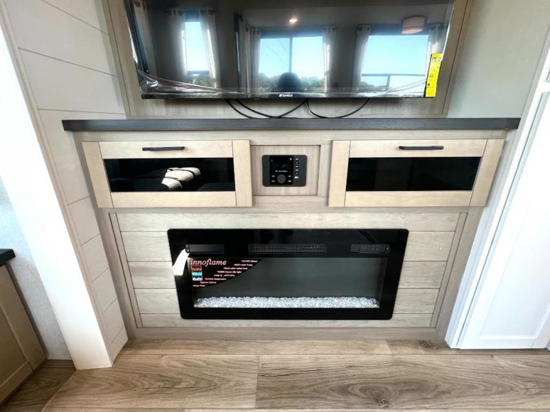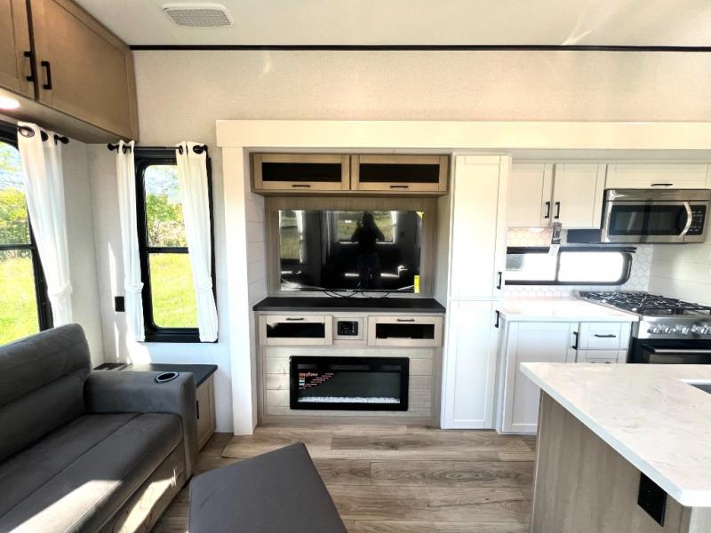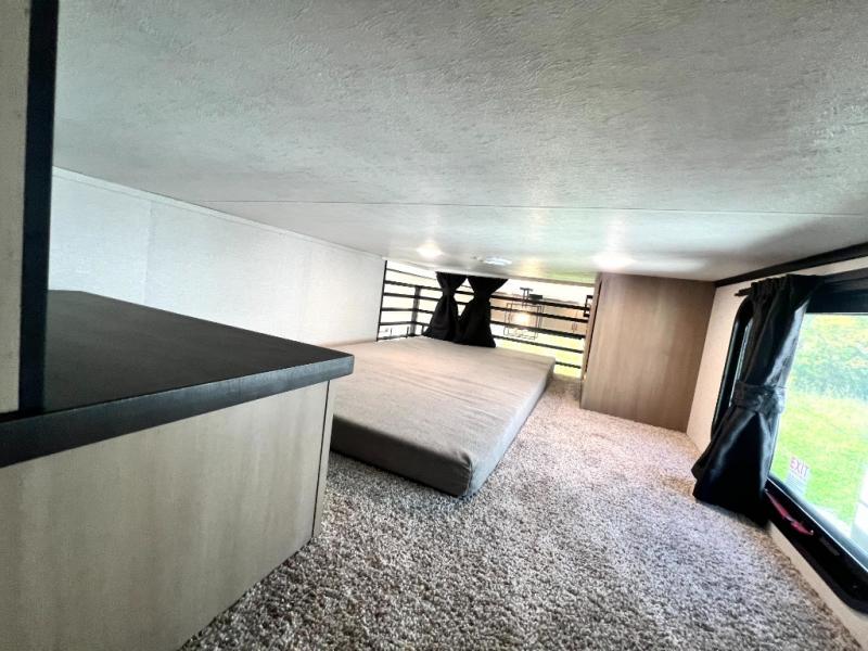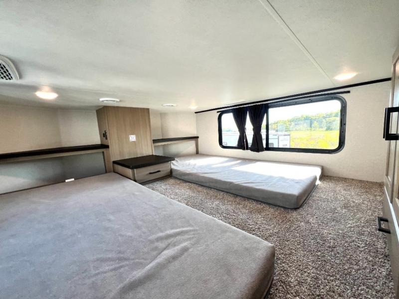 Wherever you choose you camp, you'll be camping in comfort with this travel trailer. There are dual opposing slides in the main living area, allowing everyone space to stretch out, and the cook will love having more space at the kitchen island. After dinner is cleaned up you can relax on the theater seat across from the TV and fireplace, or you can play a game at the free-standing table and chairs. The little ones are sure to head up to the double loft area to play or rest. Here, you'll find three bunk mats, two wardrobes, and shelves for plenty of storage space. The front private bedroom incudes a cozy queen bed, plus a dresser, wardrobe, and storage cabinets for all your belongings. You can even choose the king bed option in place of the queen bed if you want more space to stretch out!