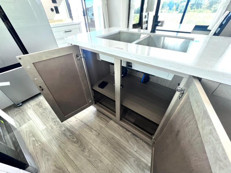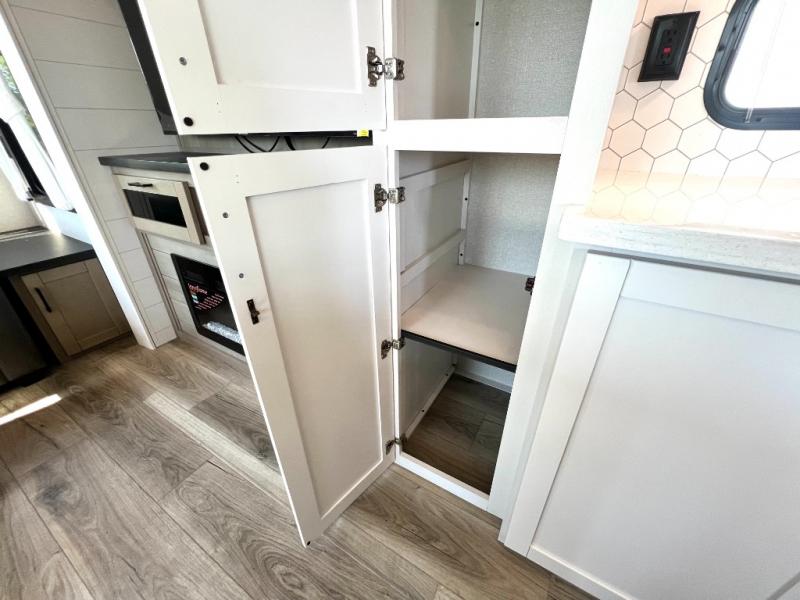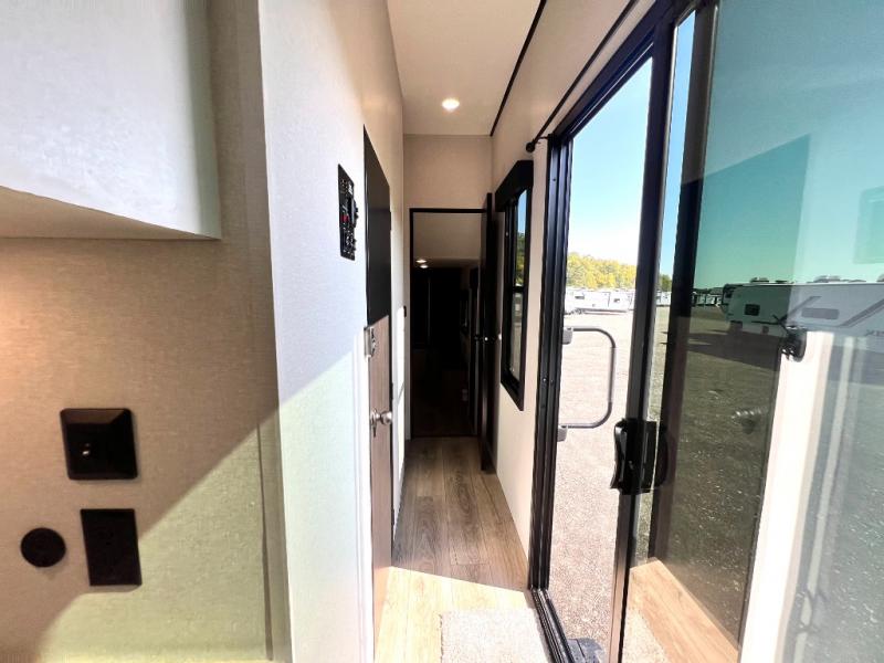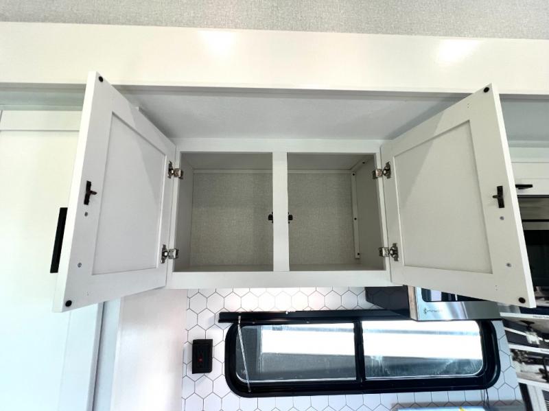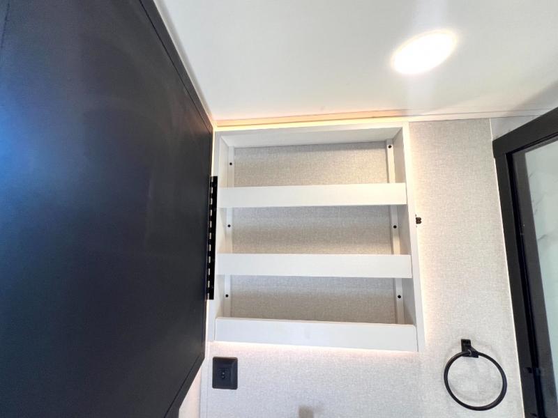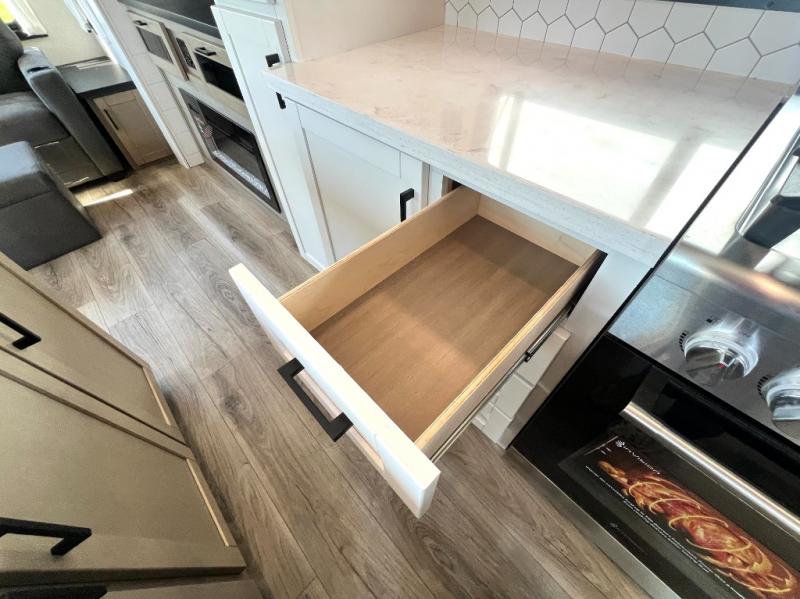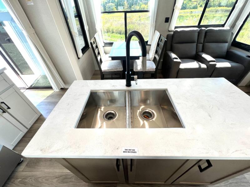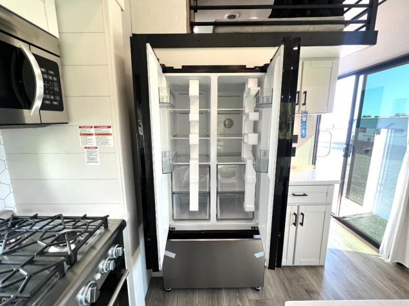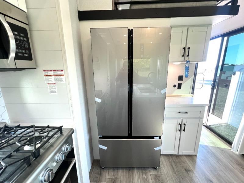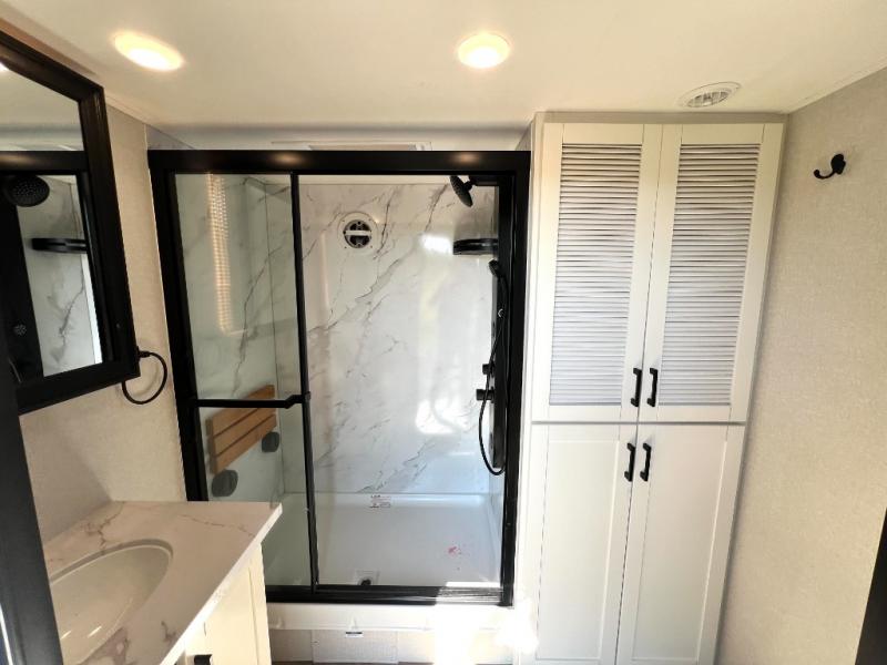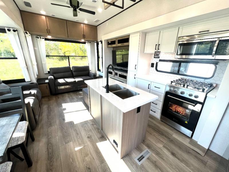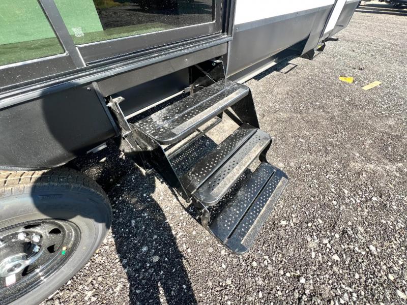 Wherever you choose you camp, you'll be camping in comfort with this travel trailer. There are dual opposing slides in the main living area, allowing everyone space to stretch out, and the cook will love having more space at the kitchen island. After dinner is cleaned up you can relax on the theater seat across from the TV and fireplace, or you can play a game at the free-standing table and chairs. The little ones are sure to head up to the double loft area to play or rest. Here, you'll find three bunk mats, two wardrobes, and shelves for plenty of storage space. The front private bedroom incudes a cozy queen bed, plus a dresser, wardrobe, and storage cabinets for all your belongings. You can even choose the king bed option in place of the queen bed if you want more space to stretch out!
