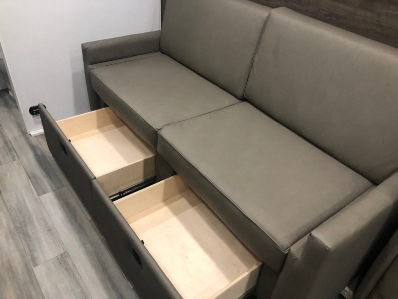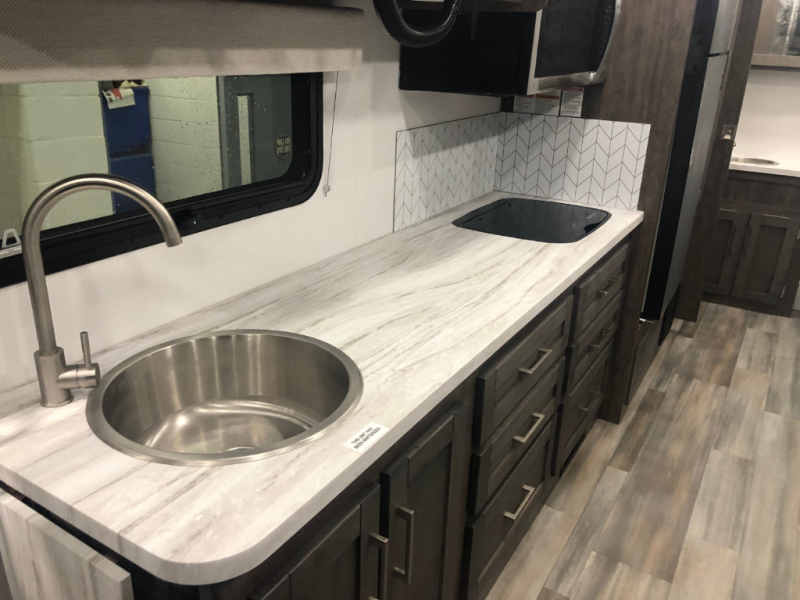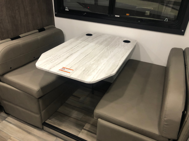 Pack up and head to the antique show for the weekend in this versatile coach. There is a sofa within the full-wall slide that includes an RV queen Murphy bed to sleep on a night, and if you have any friends tag along they can sleep on the booth dinette or cab-over bunk. The full rear bath includes a 24" x 32" shower, a stainless steel sink, plus a large bath wardrobe to store clean towels and toiletries. Head to the kitchen to prepare lunch on the two burner drop-in cooktop, and you'll appreciate the large pantry for dry goods and snacks. You can choose the optional theater seating in place of the booth dinette, or the optional front entertainment center in place of the cab-over bunk if you're not needing the additional sleeping space.