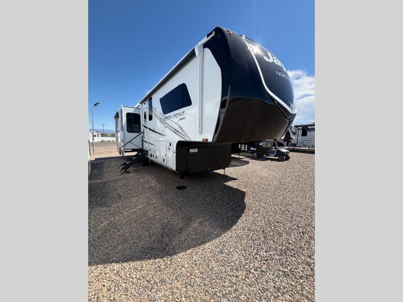With any North Point fifth wheel by Jayco you begin with a strong foundation with a custom frame, designed and sized specifically to best support each unit. Constructed with Stronghold VBL™ aluminum framed, vacuum bond laminated walls and the Magnum Truss™ XL6™ roof system with an Alpha roof membrane system, which is the strongest tested roof in the industry. The 5-Star Handling package is included with Uniroyal tires, a MORryde rubber pin box, Dexter axles with Nev-R-Adjust brakes, MORryde CRE-3000 rubberized suspension and wet bolt fasteners and bronze bushings. The interior has handcrafted hardwood glazed doors and drawers, vinyl flooring throughout, an integrated under-mount sink in the main bathroom, plus so much more you just have to see one to believe it all!